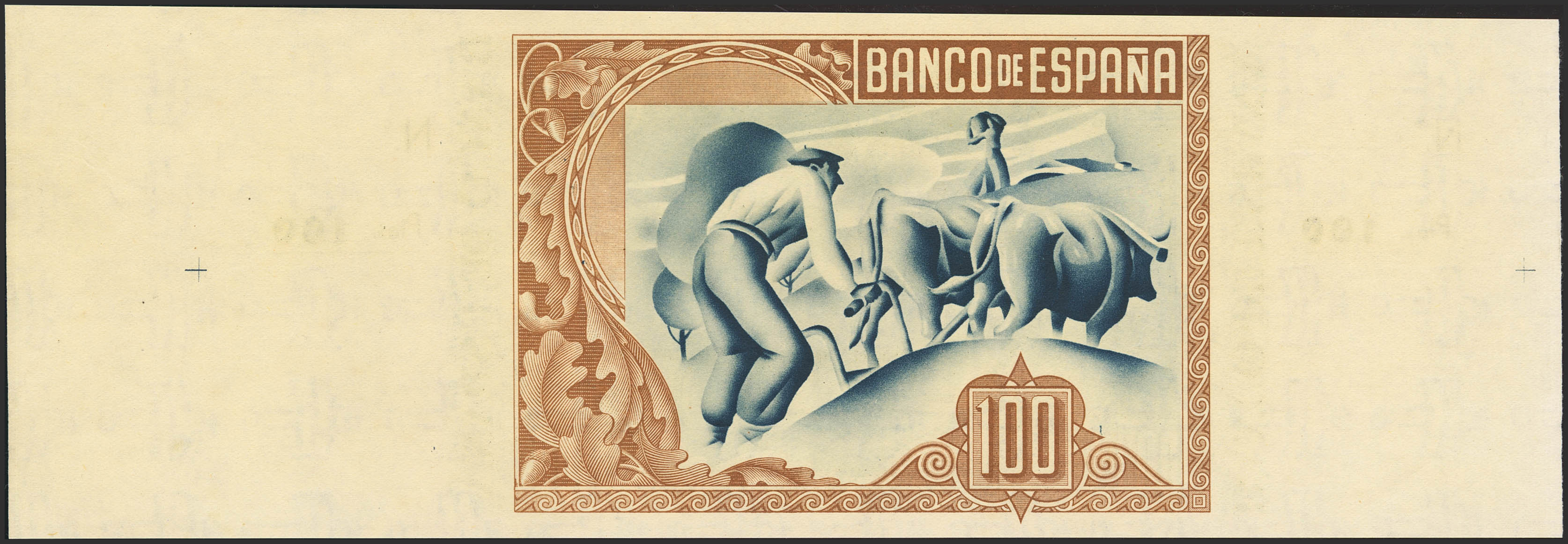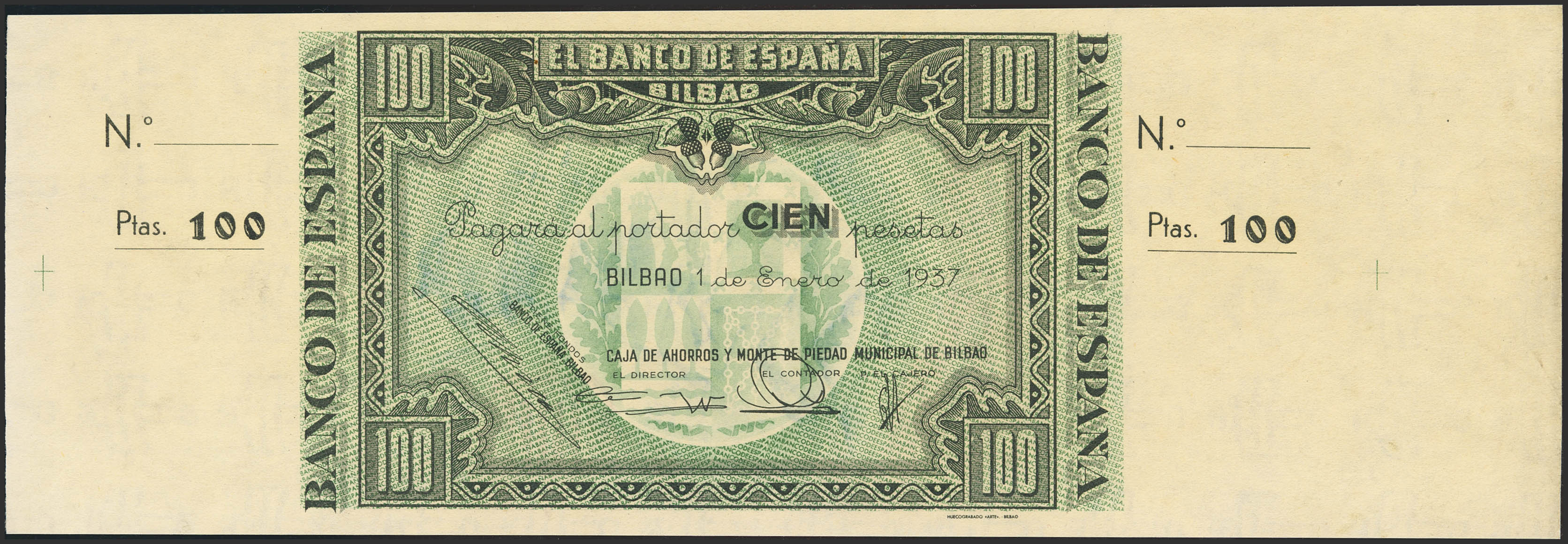 100 Pesetas. 1 de Enero de 1937. Sucursal de Bilbao, antefirma Caja de Ahorros y Monte de Piedad Municipal de Bilbao. Sin serie y sin numeración, con ambas matrices. (Edifil 2023: 390c). Apresto original. SC-.