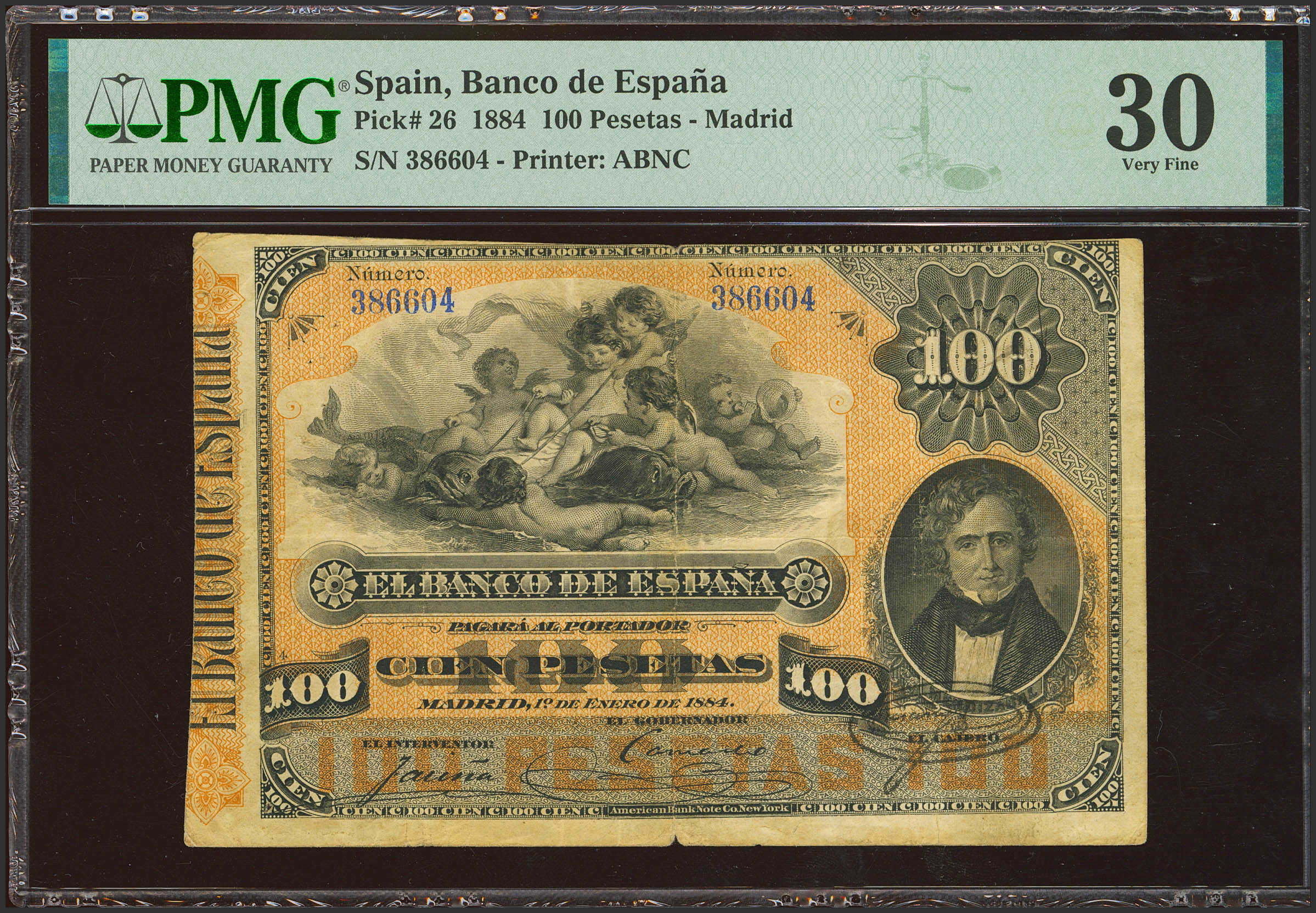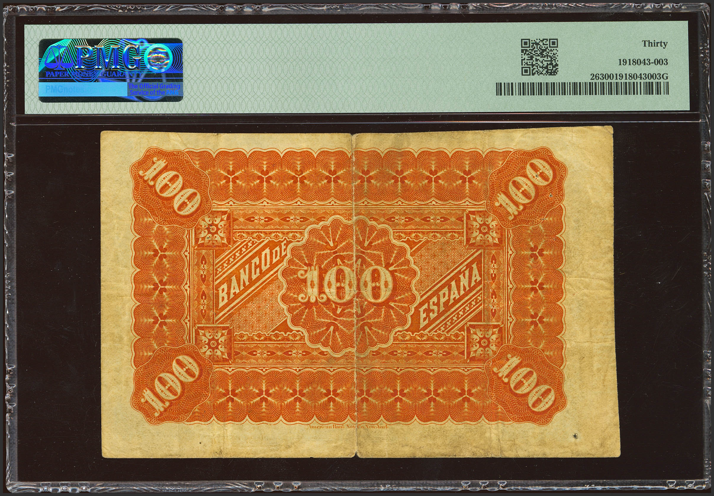 100 Pesetas. 1 de Enero de 1884. Sin serie. (Edifil 2023: 284, Pick: 26). Muy raro, especialmente sin reparaciones. MBC+. Encapsulado PMG30.