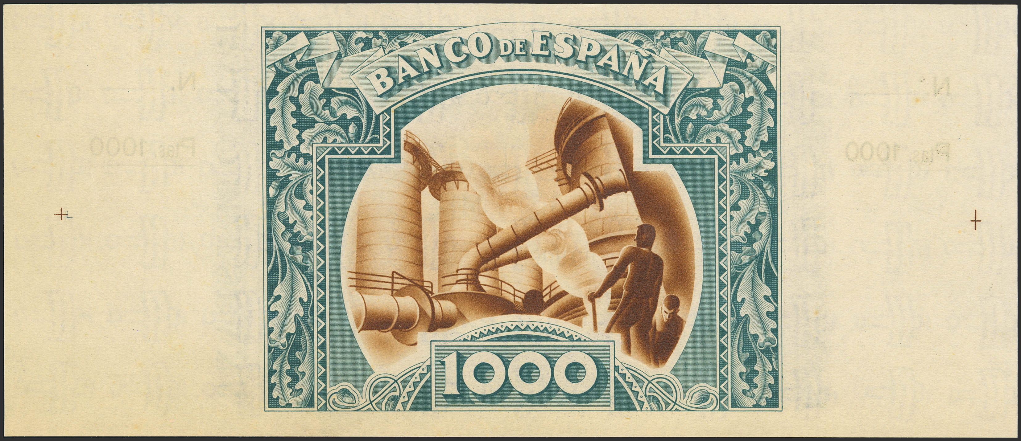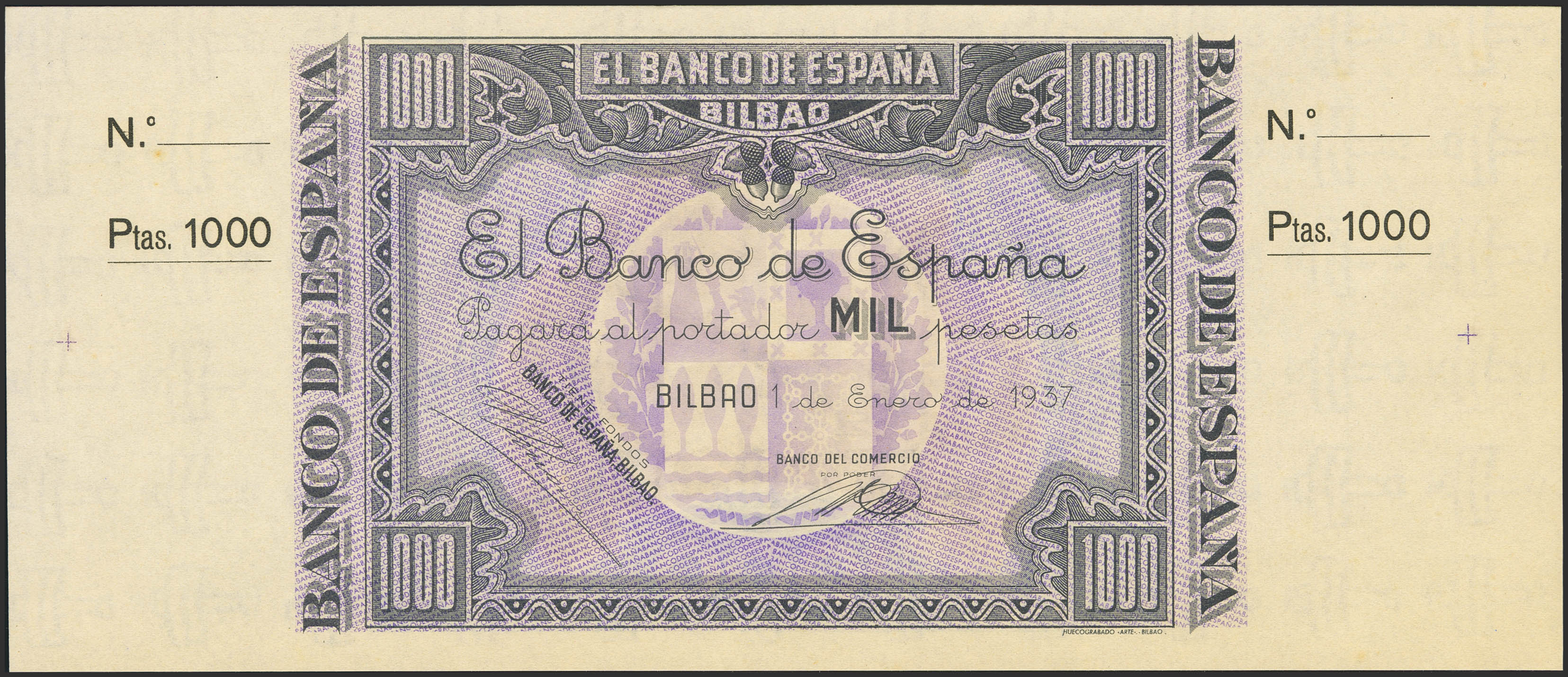1000 Pesetas. 1 de Enero de 1937. Sucursal de Bilbao, antefirma Banco de Comercio. No emitido, sin serie y sin numeración, con ambas matrices. (Edifil 2023: NE27c). Apresto original. SC.