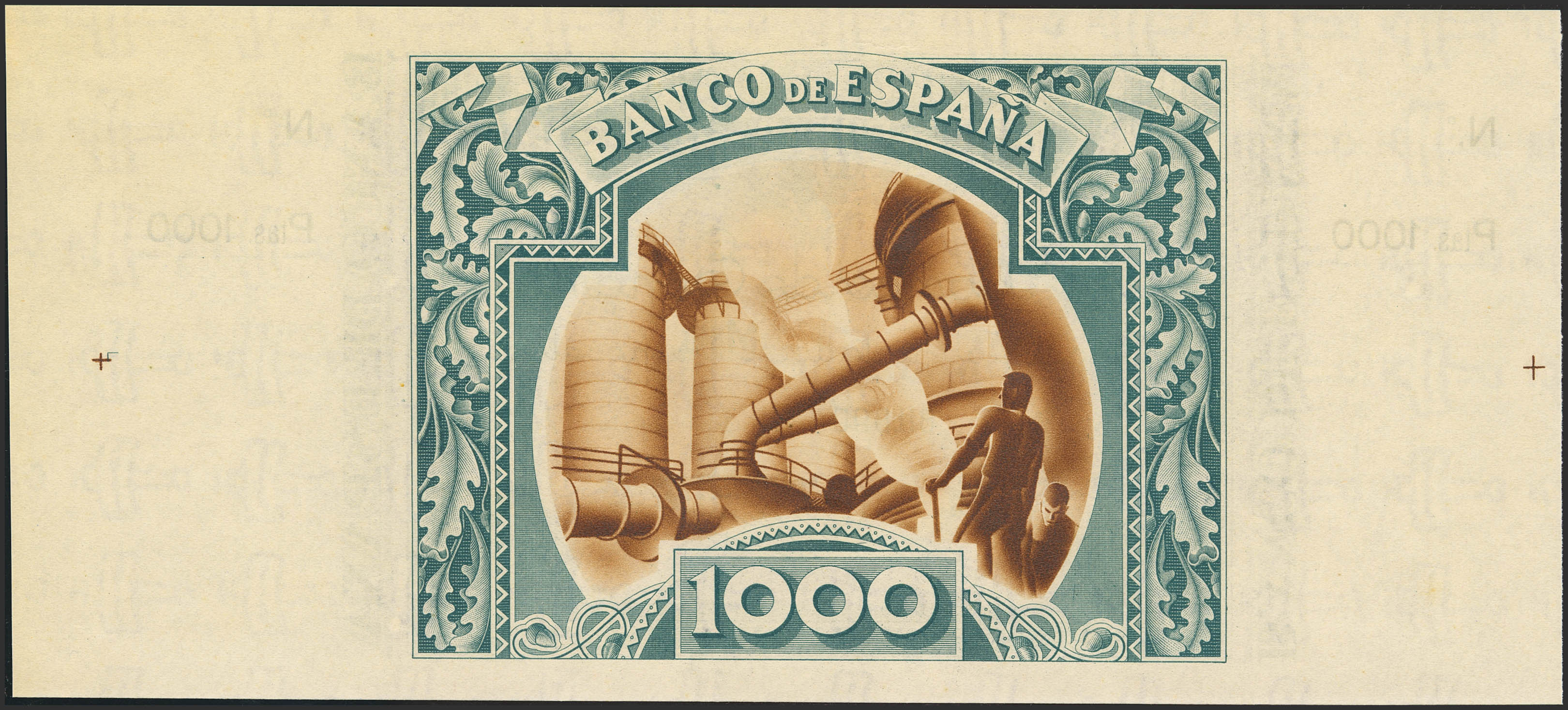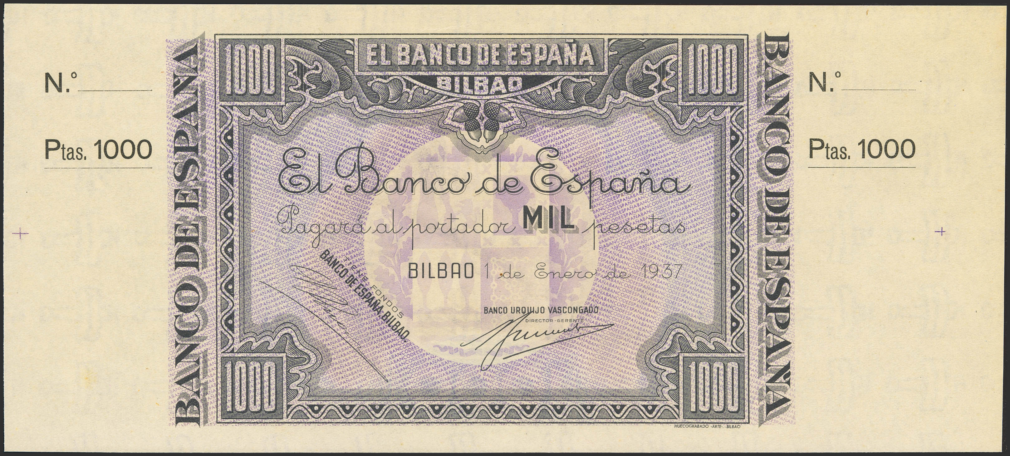 1000 Pesetas. 1 de Enero de 1937. Sucursal de Bilbao, antefirma Urquijo Vascongado. No emitido, sin serie y sin numeración, con ambas matrices. (Edifil 2023: NE27f). Apresto original, típicos puntitos del tiempo. SC-.