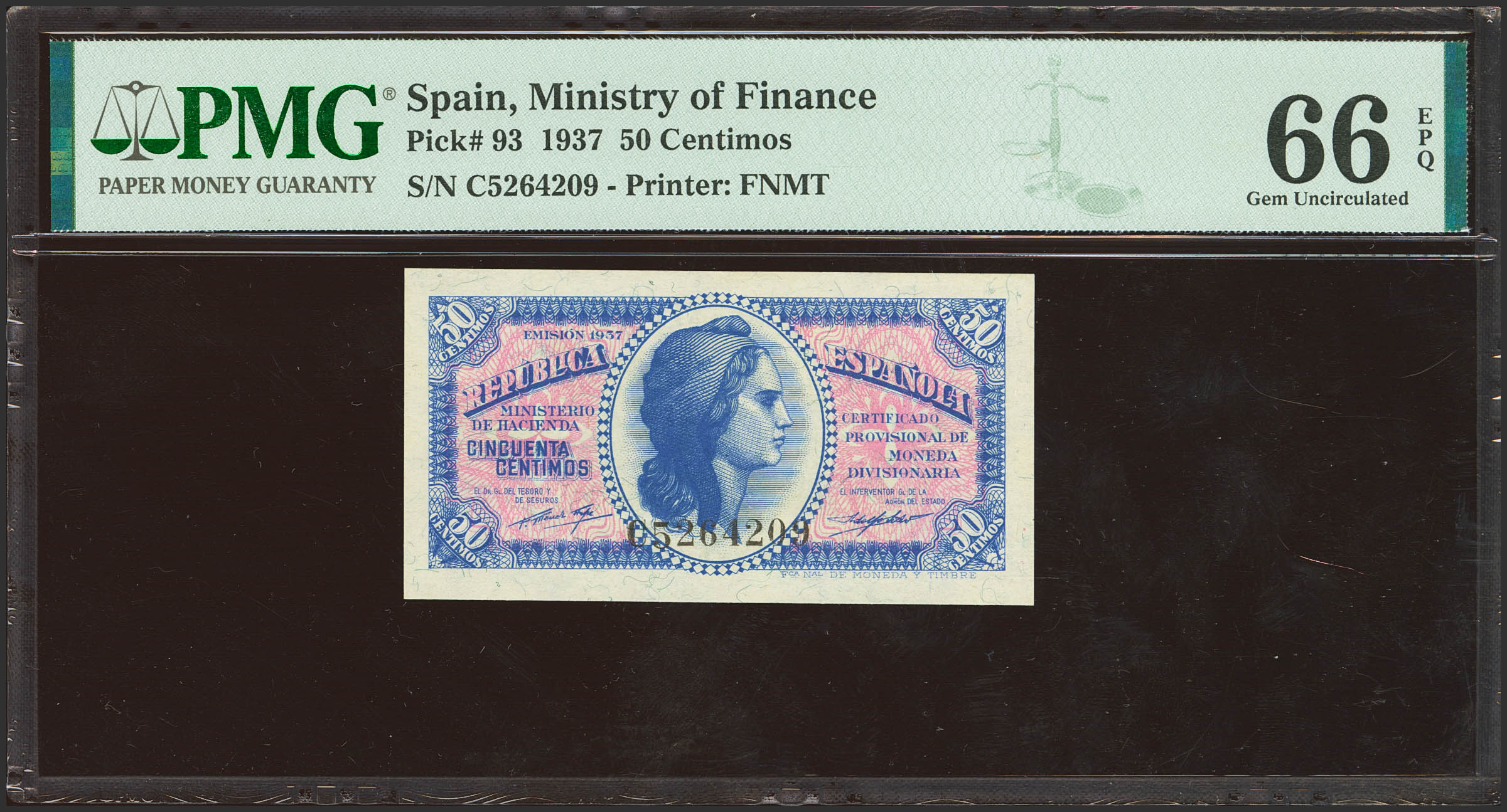 50 Céntimos. 1937. Ministerio de Hacienda. Serie C, última serie emitida. (Edifil 2023: 391a, Pick: 93). Inusual en esta excepcional conservación, apresto original. SC. Encapsulado PMG66EPQ.