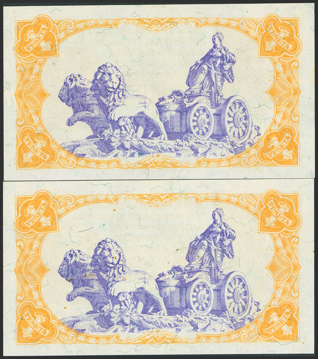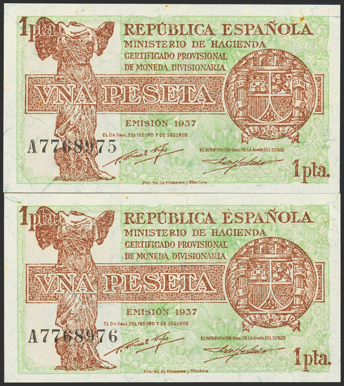 1 Peseta. 1937. Ministerio de Hacienda. Pareja correlativa. Serie A. (Edifil 2021: 392). Apresto original, típicos puntitos. SC.