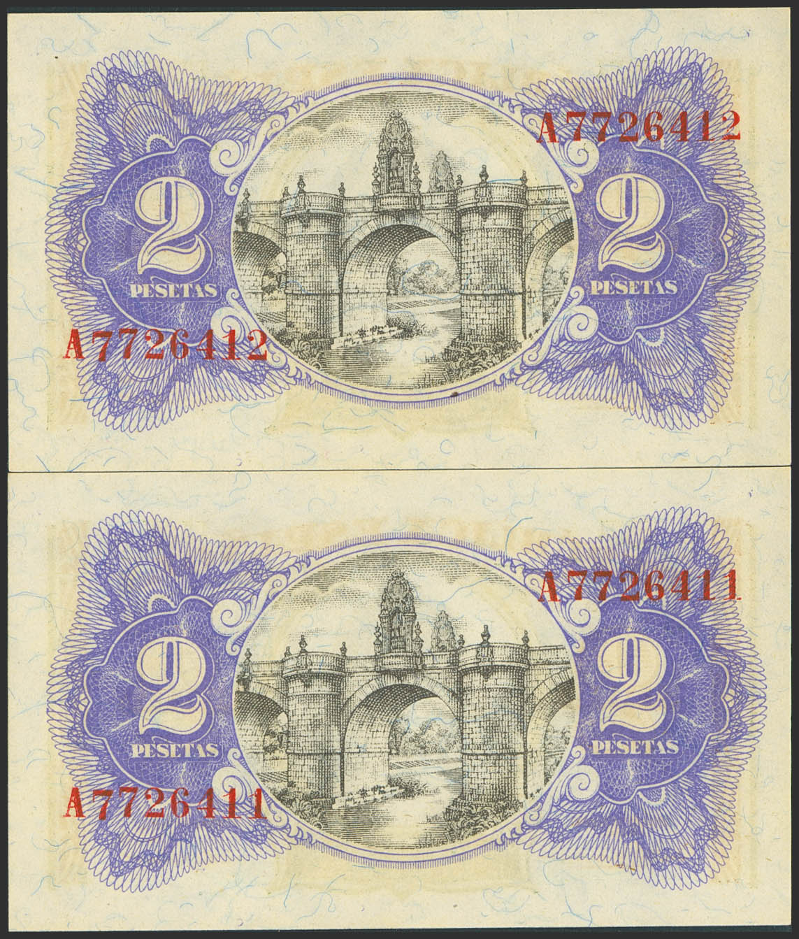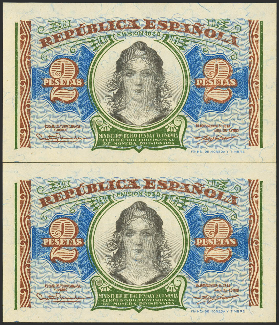 2 Pesetas. 1937. Ministerio de Hacienda. Pareja correlativa. Serie A. (Edifil 2021: 393). Apresto original. SC-.