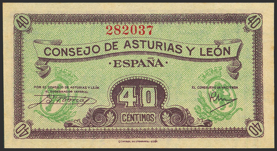 40 Céntimos. 1937. Asturias y León. Sin serie. (Edifil 2023: 395). Apresto original, manchitas típcas. SC-.