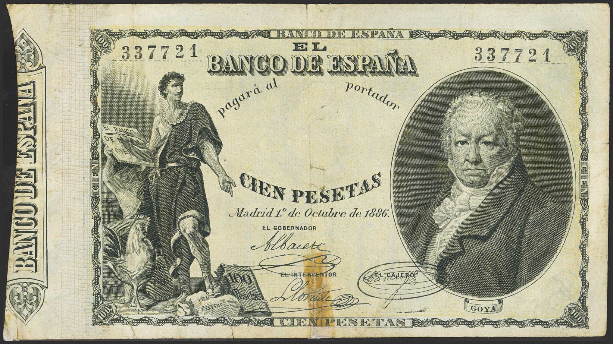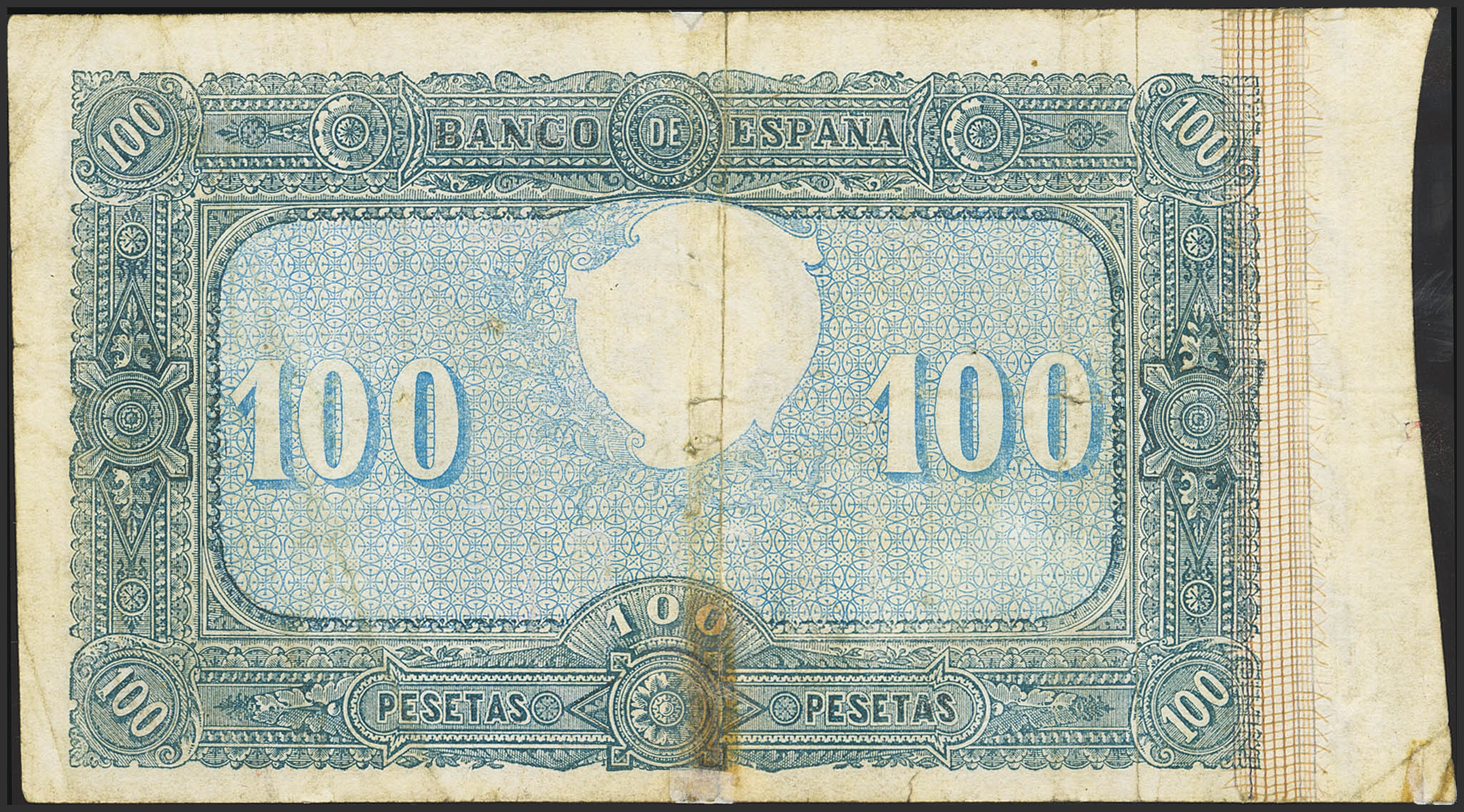 100 Pesetas. 1 de Octubre de 1886. Sin serie. (Edifil 2023: 294, Pick: 36). Muy raro, reparado y pequeñas roturitas. MBC-.