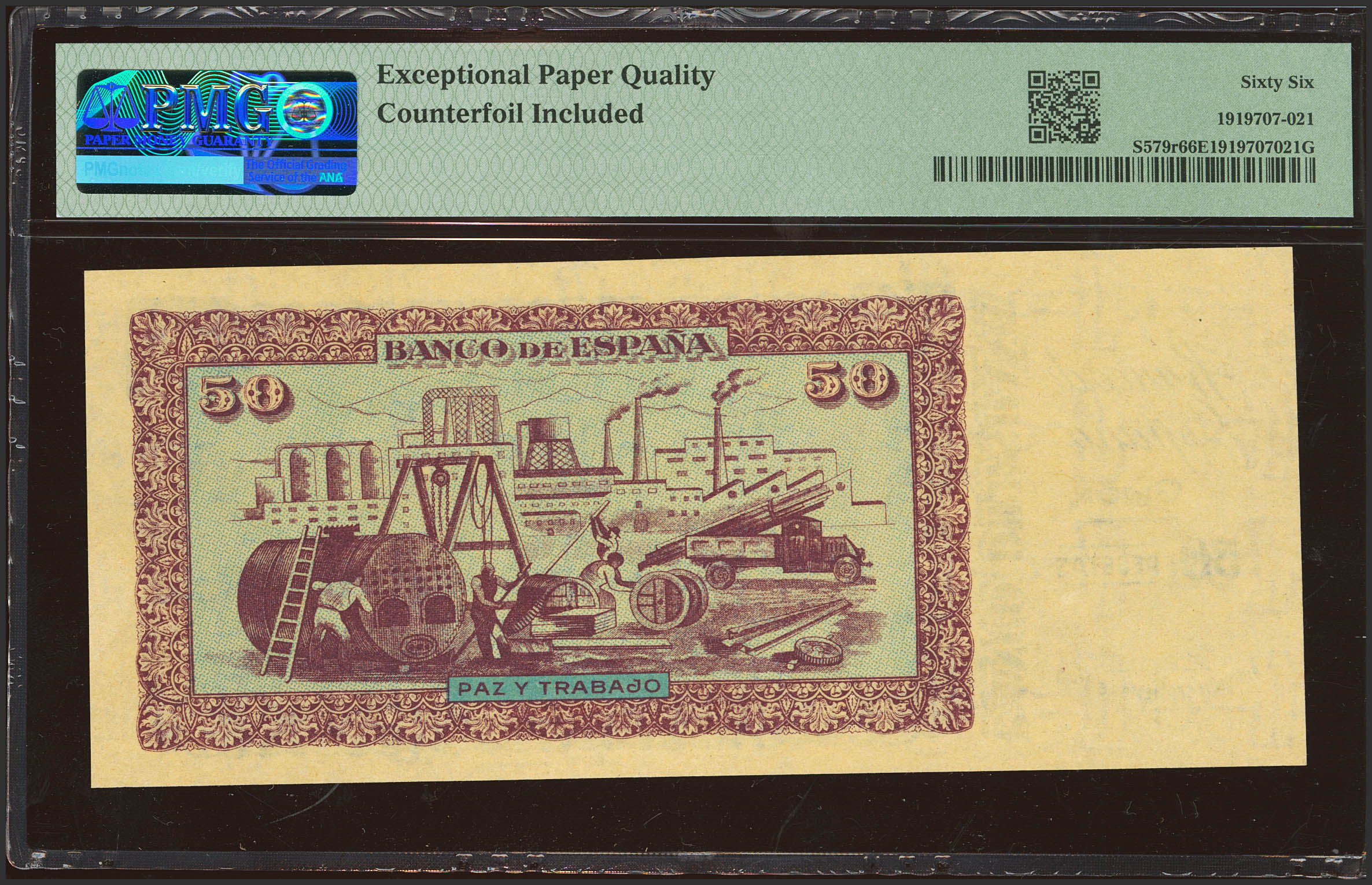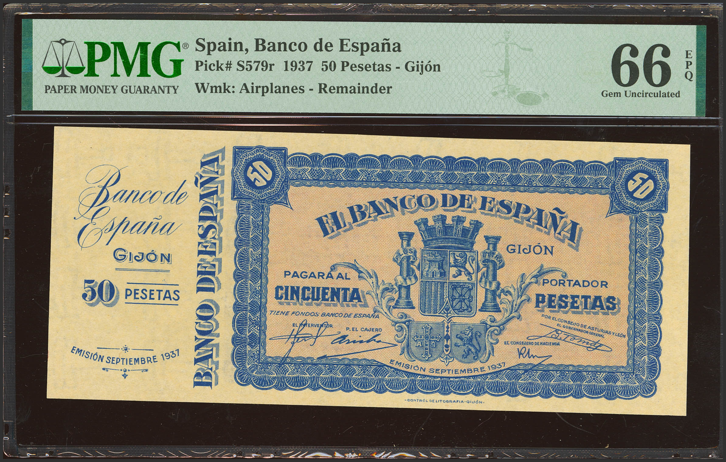 50 Pesetas. NO EMITIDO. Septiembre 1937. Banco de España, Gijón. Sin serie y con la matriz a la izquierda. (Edifil 2023: NE33, Pick: S579). Muy raro, especialmente en esta excepcional calidad, apresto original. SC. Encapsulado PMG66EPQ. (para hacernos idea de la rareza, a fecha 1 de Noviembre de 2024, este billete es el mejor calificado junto a otros cinco billetes en PMG)