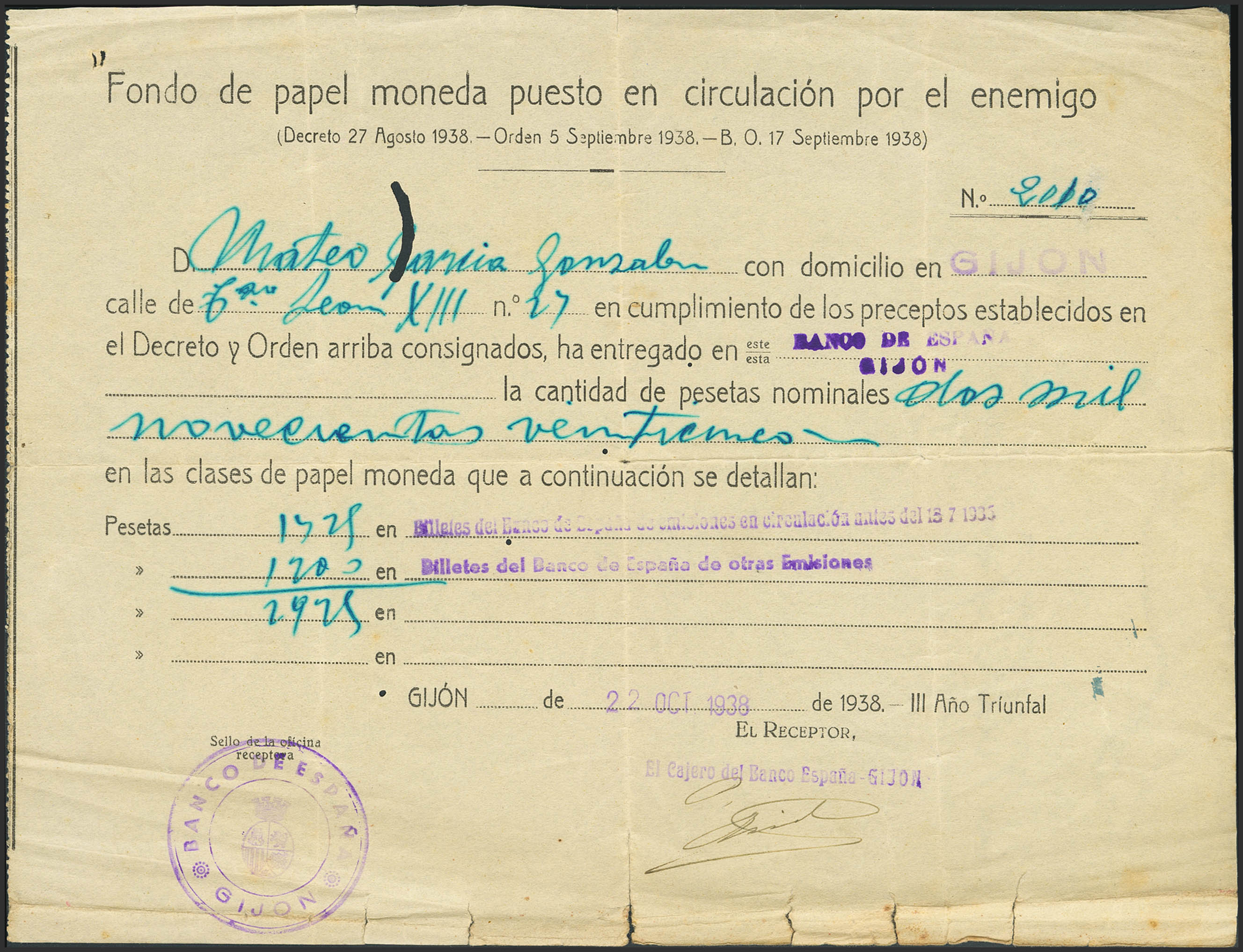 GIJON. Fondo de Papel-Moneda puesto en circulación por el enemigo por valor de 2925 Pesetas, fechado el 22 de Octubre de 1938. MBC-.
