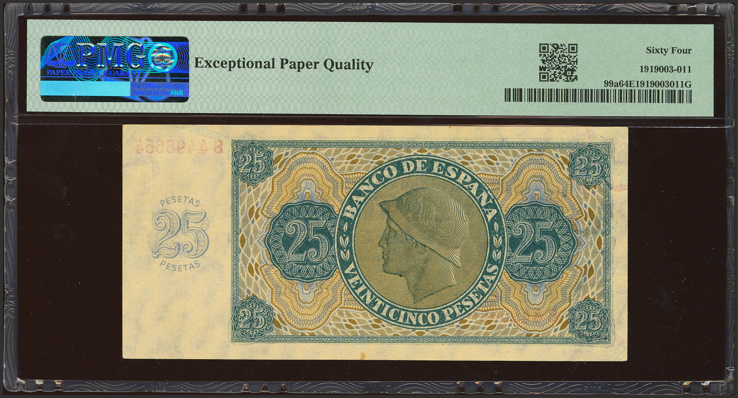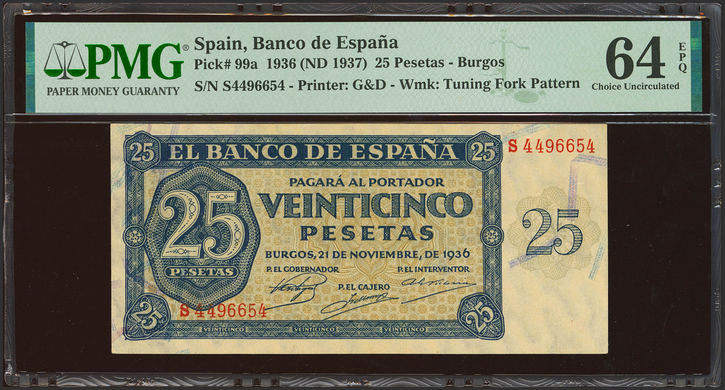 25 Pesetas. 21 de Noviembre de 1936. Serie S, última serie emitida. (Edifil 2023: 419b, Pick: 99a). Inusual en esta excepcional calidad, apresto original. SC. Encapsulado PMG64EPQ.