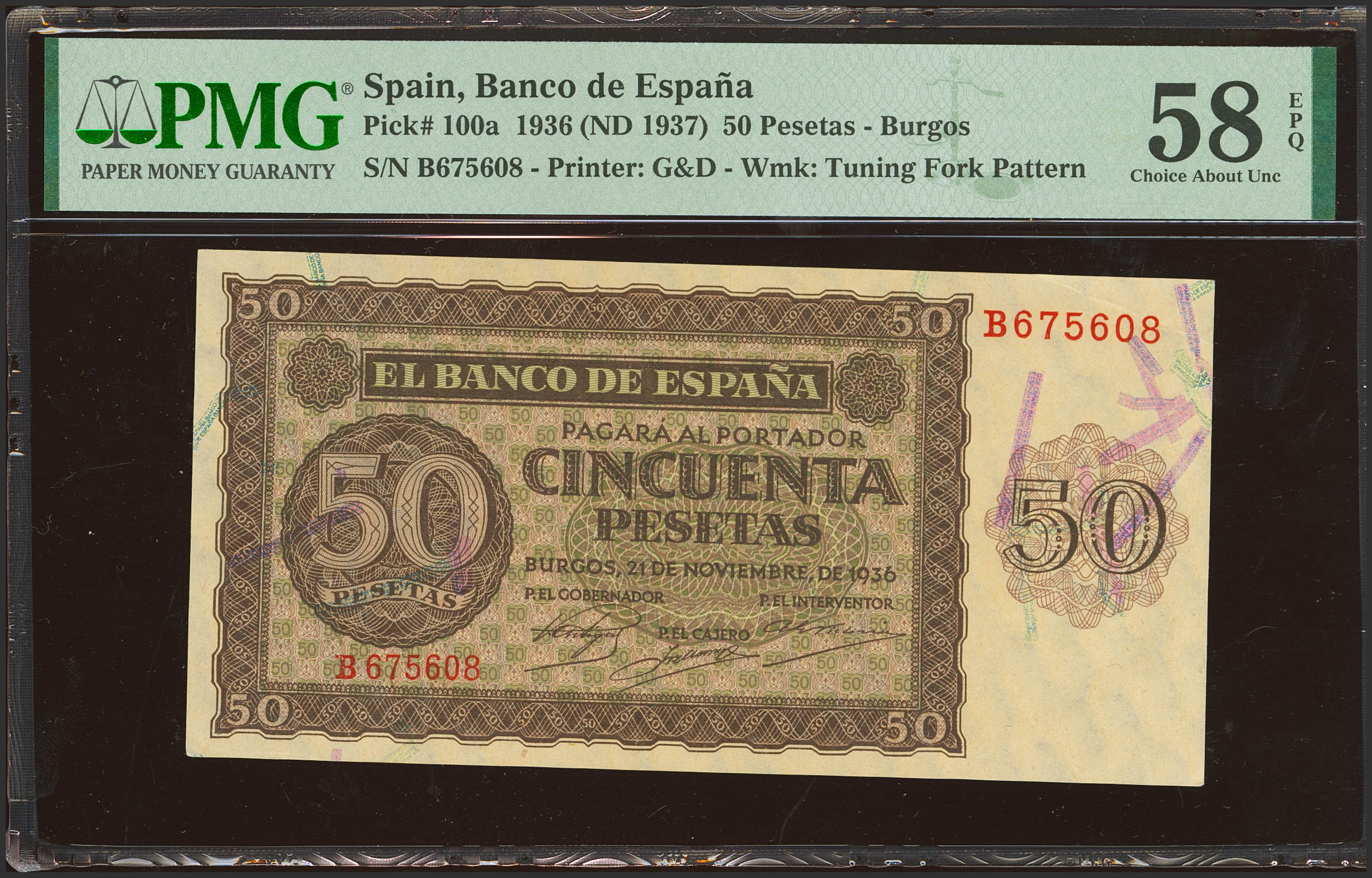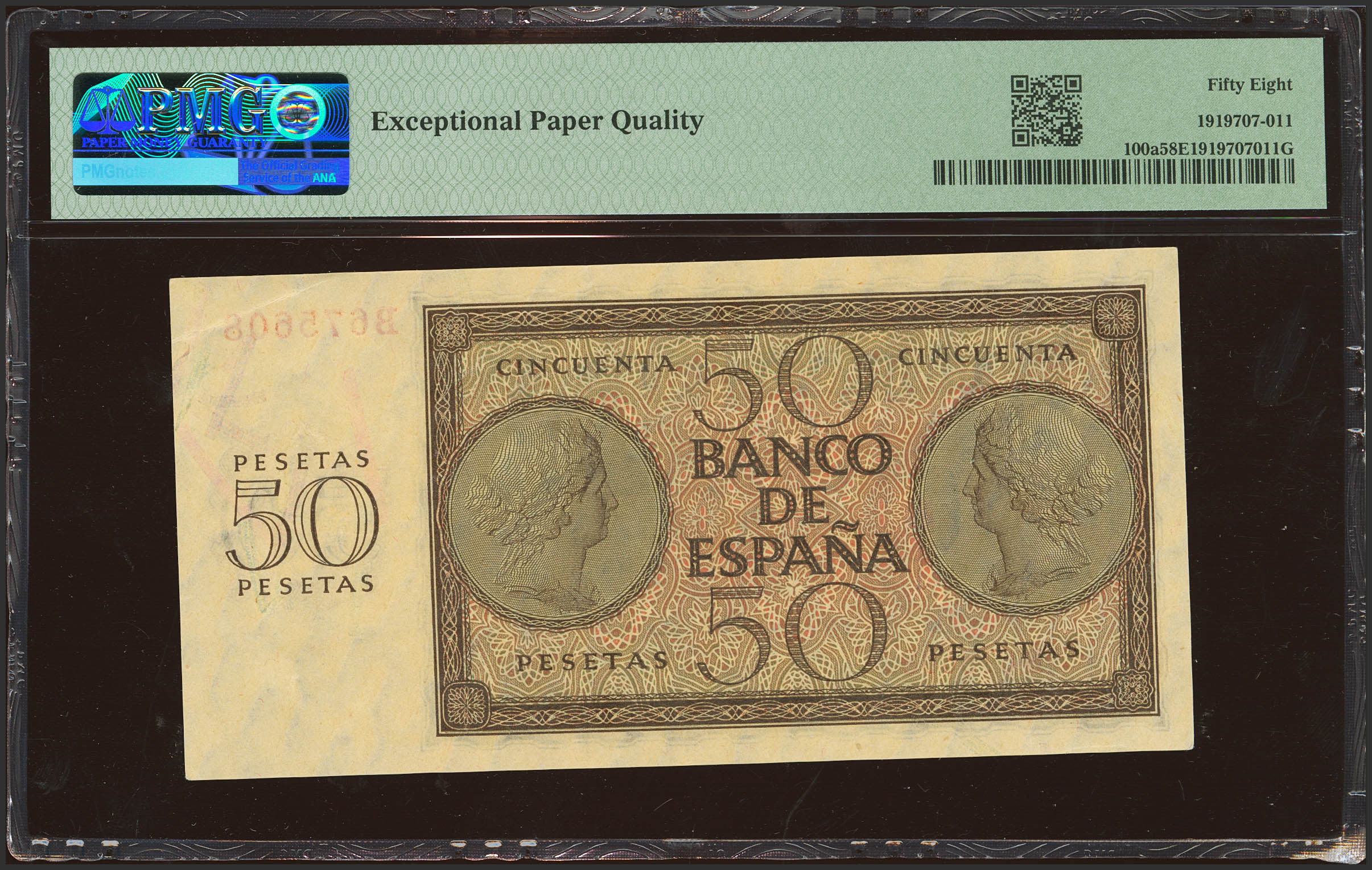 50 Pesetas. 21 de Noviembre de 1936. Serie B. (Edifil 2023: 420a, Pick: 100a). Apresto original. EBC+++. Encapsulado PMG58EPQ.