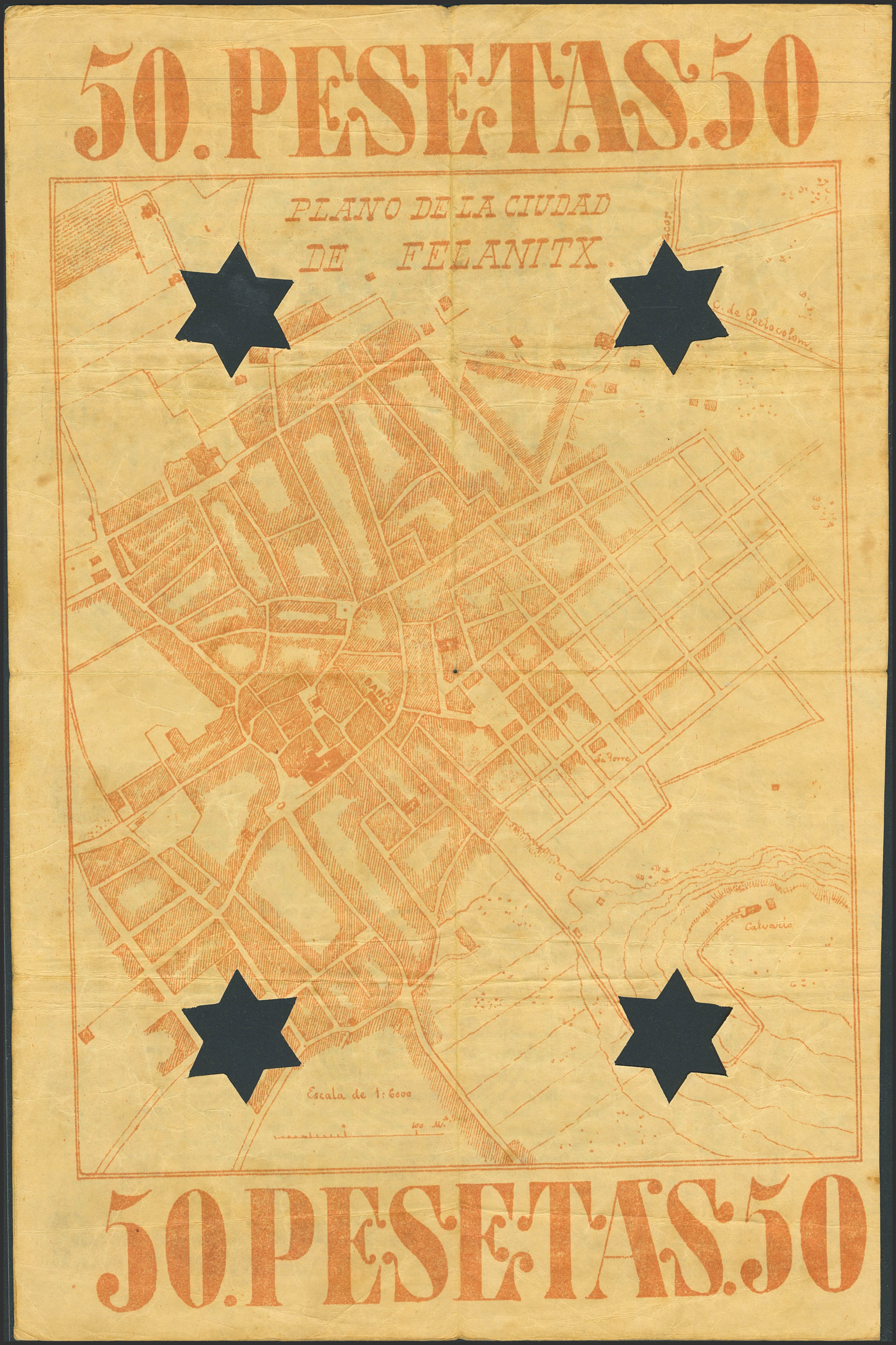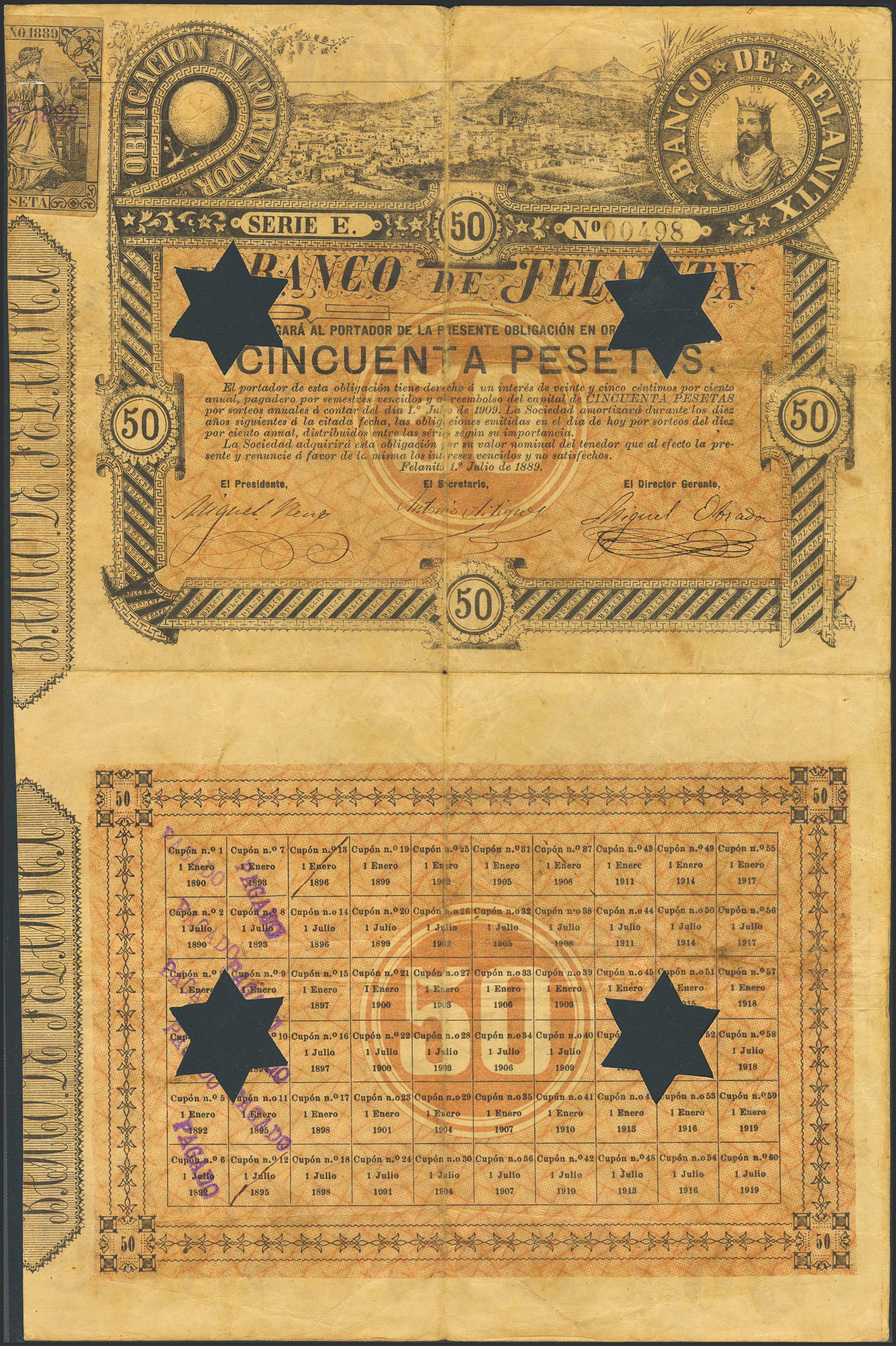 50 Pesetas. Obligación del Banco de Felanitx. 1 de Julio de 1889. Serie E y taladrado de estrella de 5 puntas. Raro, verdaderamente circulado y completo con los cupones. Para entender mejor la contextualización de este billete recomendamos la obra "Obligaciones, vales y documentos puestos en circulación como papel moneda en España", de Don Ramón Cobo Huici. MBC+.
