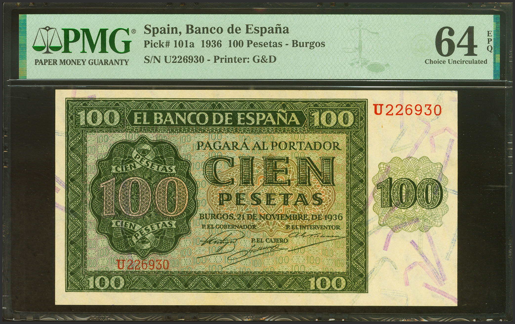 100 Pesetas. 21 de Noviembre de 1936. Serie U. (Edifil 2023: 421a, Pick: 101a). Apresto original. SC. Encapsulado PMG64EPQ.