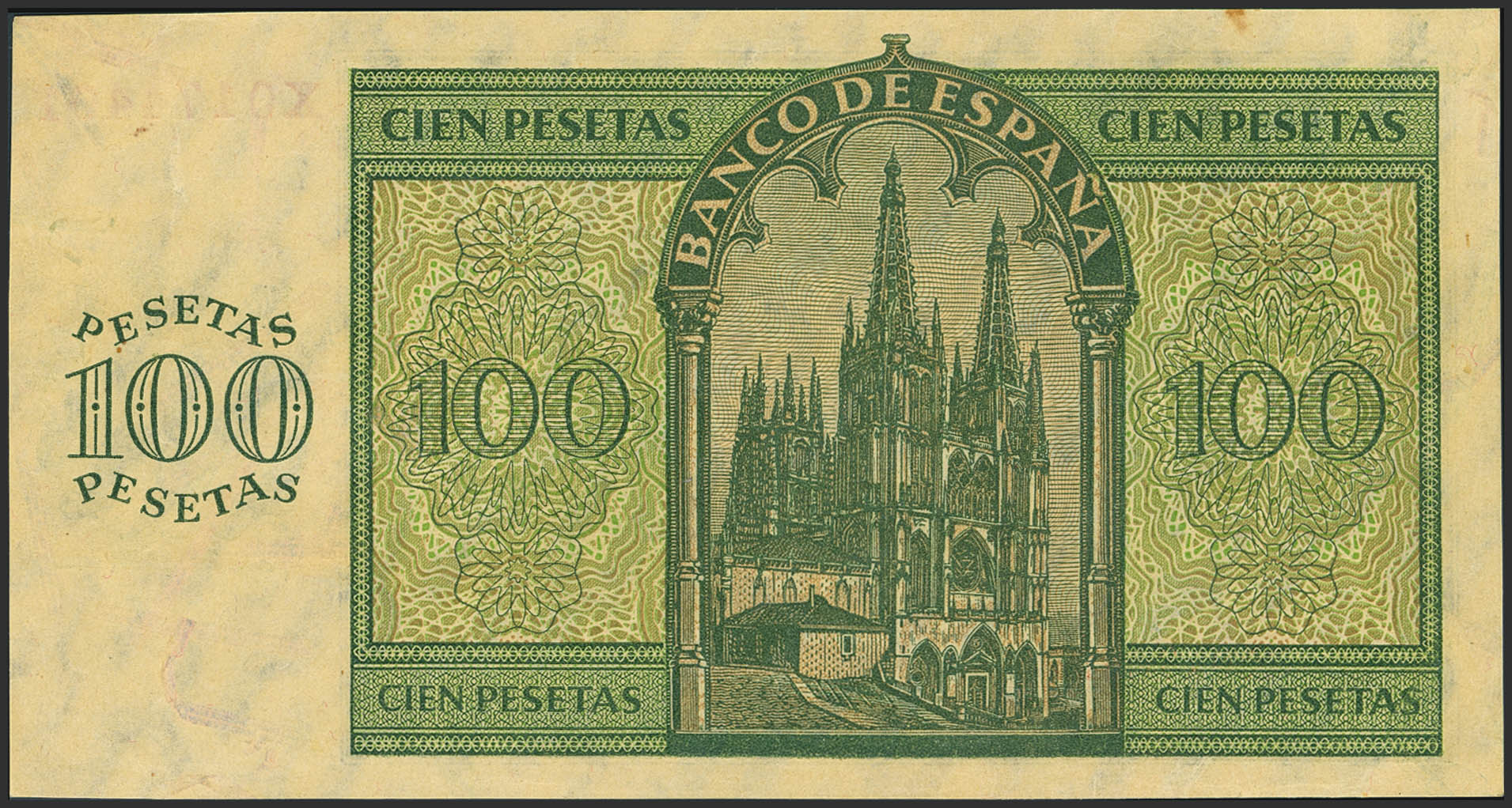 100 Pesetas. 21 de Noviembre de 1936. Serie X, última serie emtida. (Edifil 2023: 421b). Apresto original, manchita del tiempo SC-.
