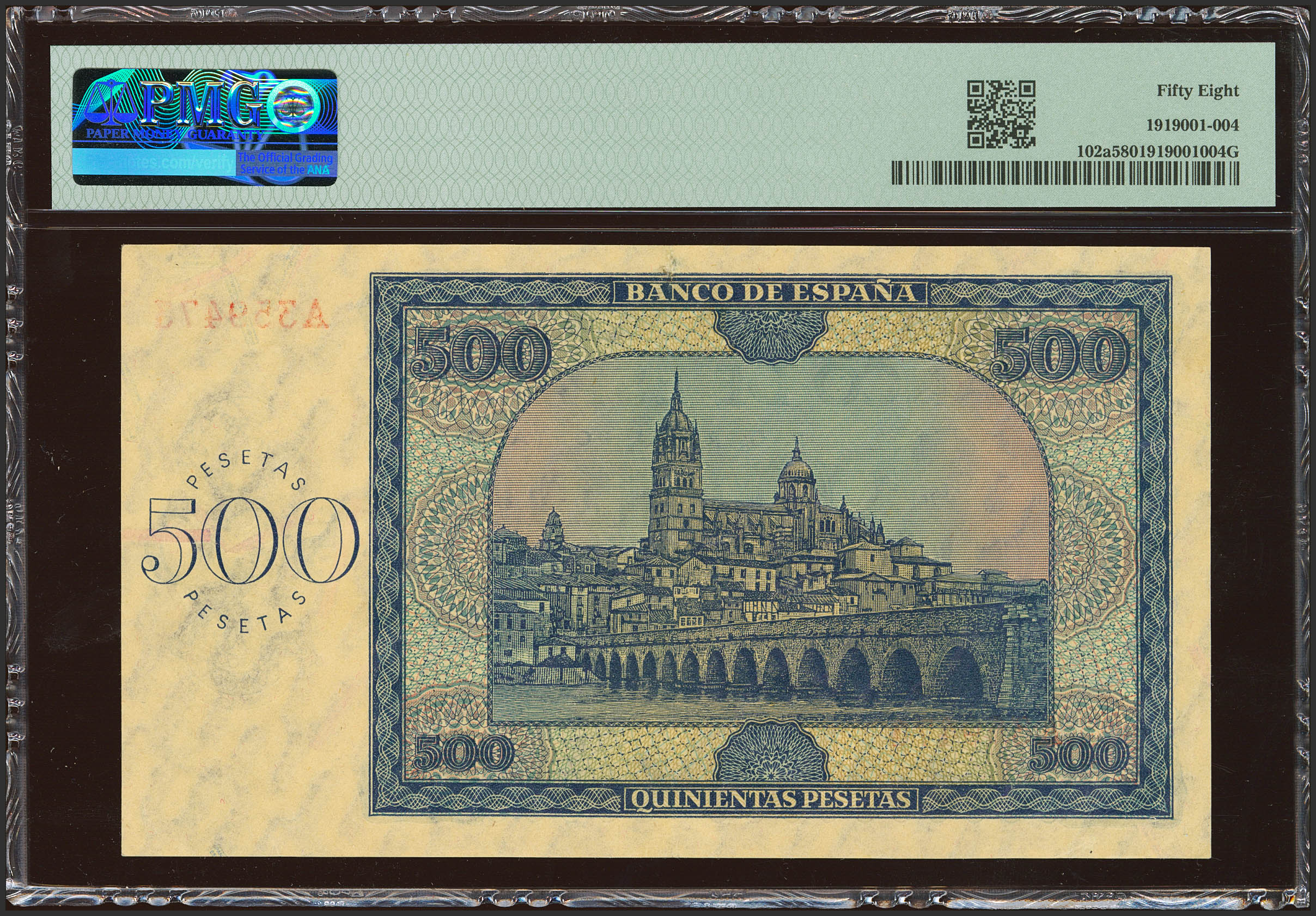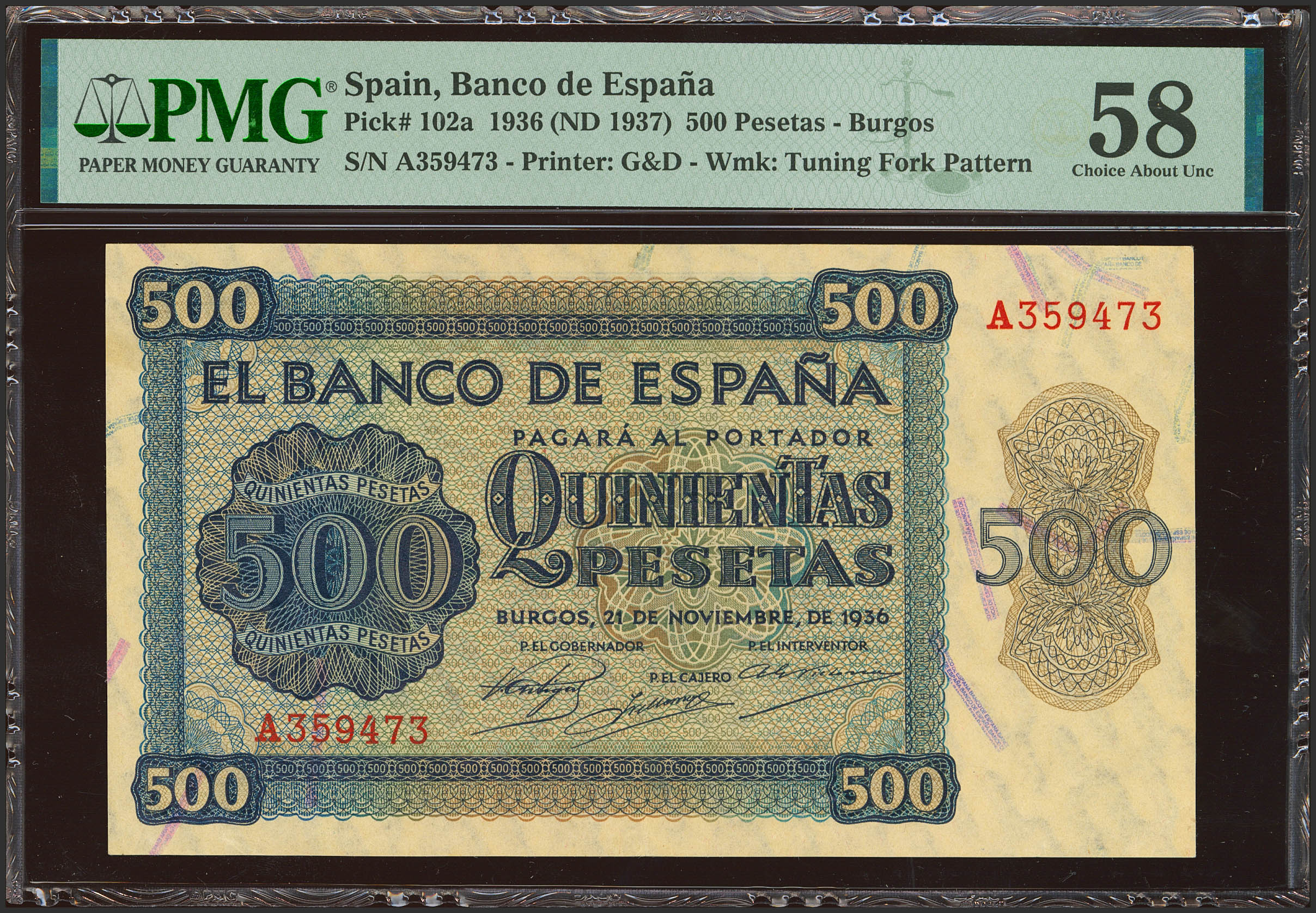 500 Pesetas. 21 de Noviembre de 1936. Serie A. (Edifil 2023: 422, Pick: 102a). Inusual. EBC++. Encapsulado PMG58.