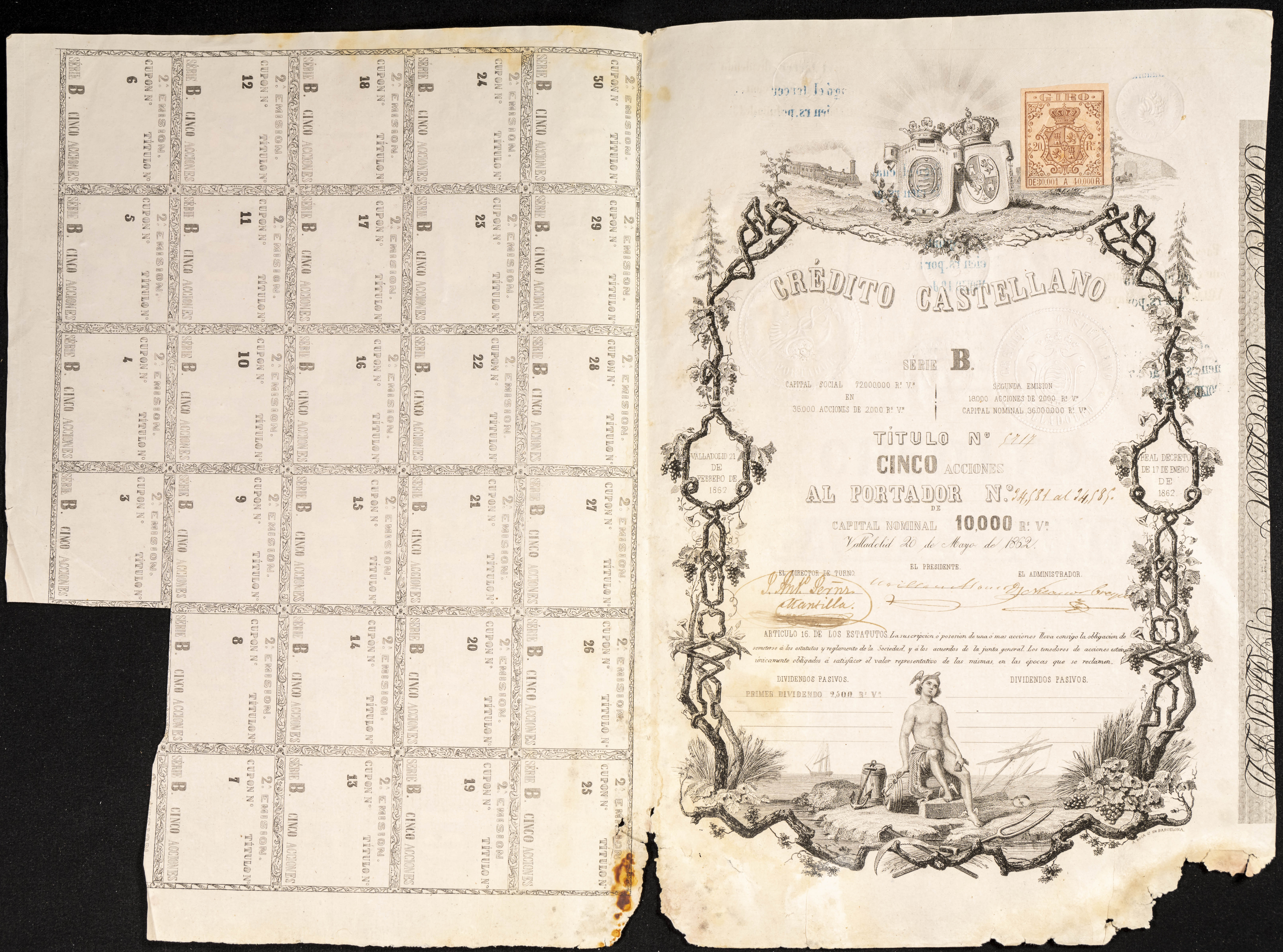 CREDITO CASTELLANO. 10000 Reales de Vellón. 20 de Mayo de 1862. Diversas marcas de uso interno del Banco de Valladolid. Rarísimo, especialmente con sus cupones. Para entender mejor la contextualización de este billete recomendamos la obra "Obligaciones, vales y documentos puestos en circulación como papel moneda en España", de Don Ramón Cobo Huici. MBC-.