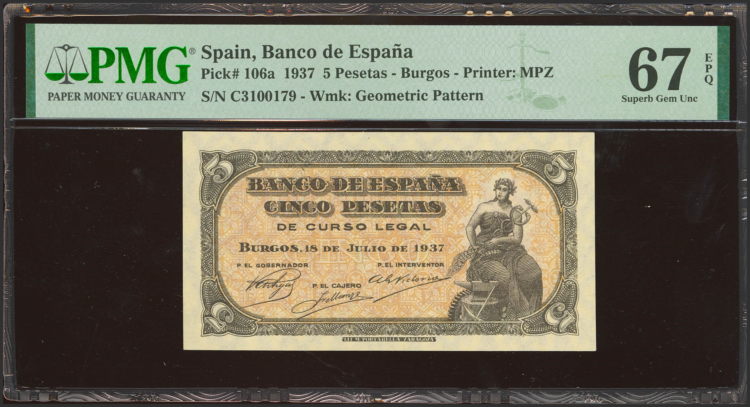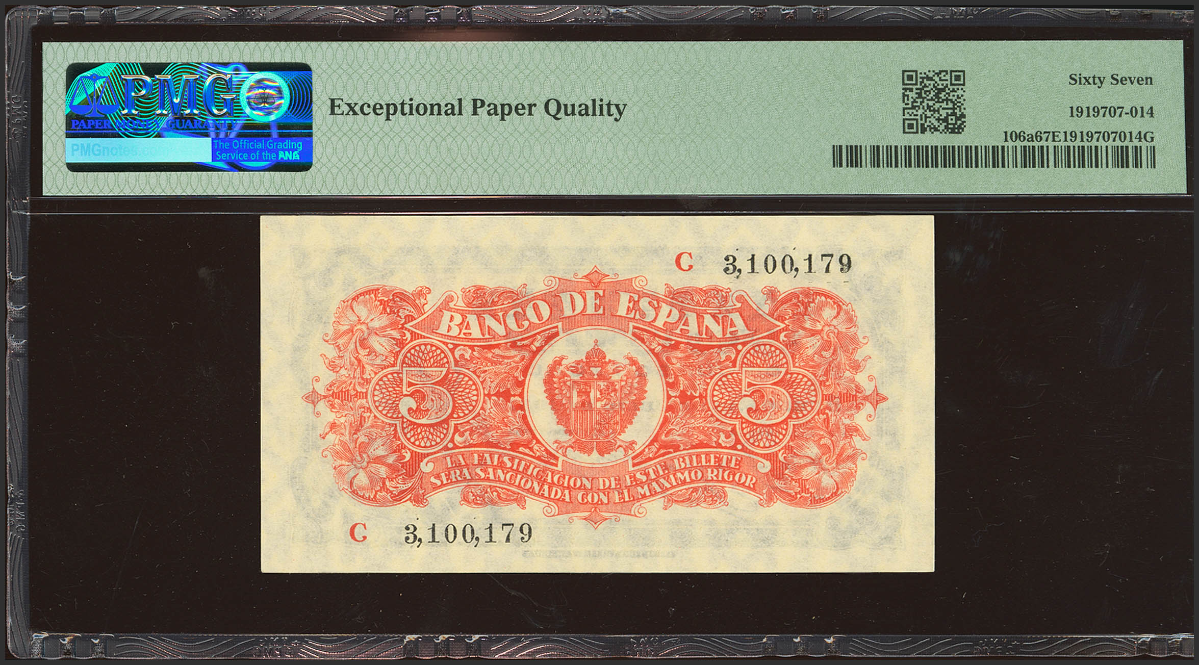 5 Pesetas. 18 de Julio de 1937. Serie C, última serie emitida. (Edifil 2023: 424b, Pick: 106a). Muy raro en esta excepcional calidad calidad, apresto original. SC. Encapsulado PMG67EPQ.