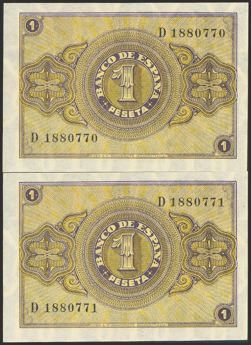 1 Peseta. 12 de Octubre de 1937. Pareja correlativa. Serie D. (Edifil 2023: 425a). Conserva todo su apresto original. SC.
