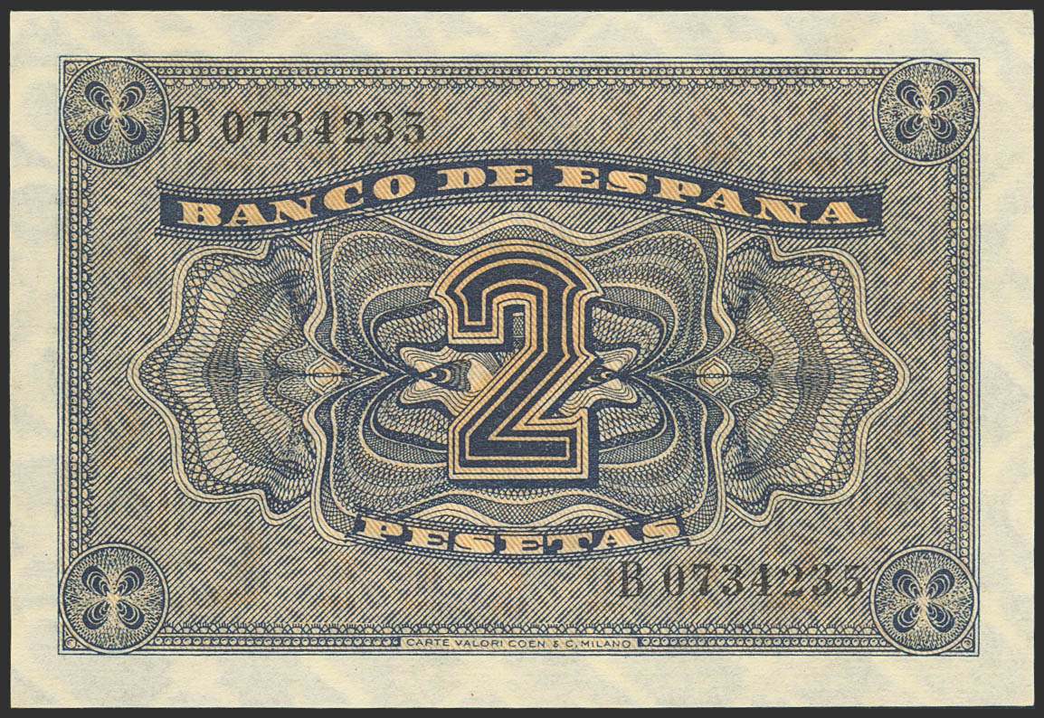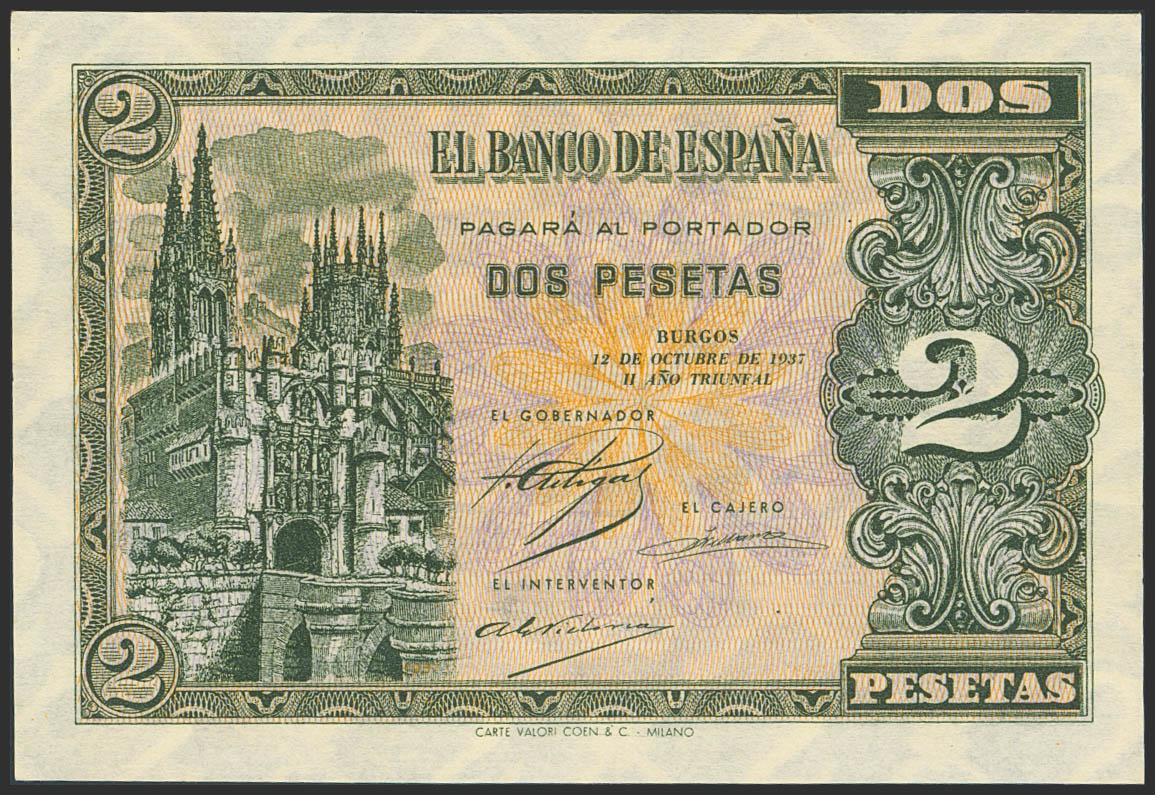 2 Pesetas. 12 de Octubre de 1937. Serie B. (Edifil 2023: 426a). Inusual, apresto original. SC-.