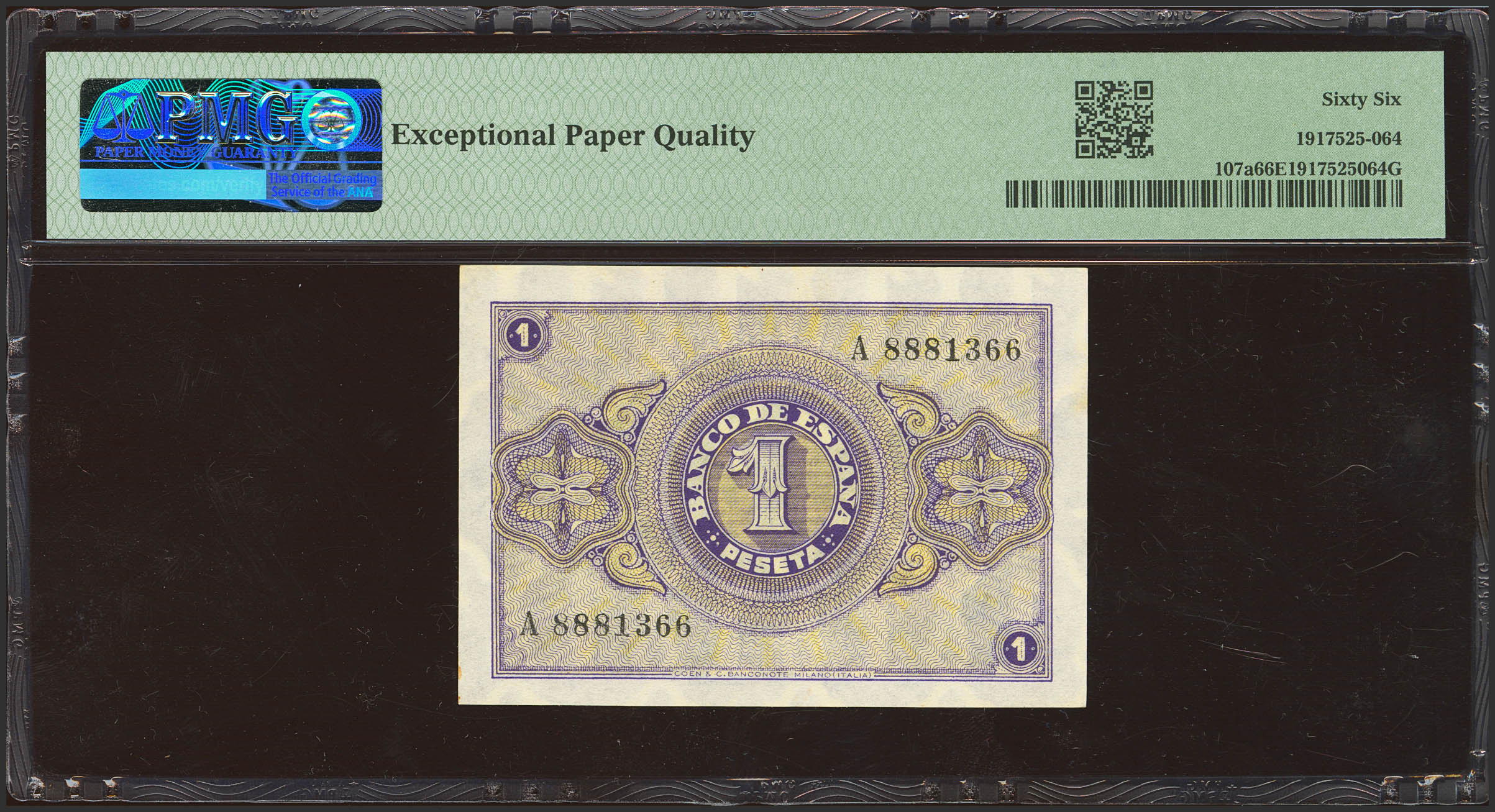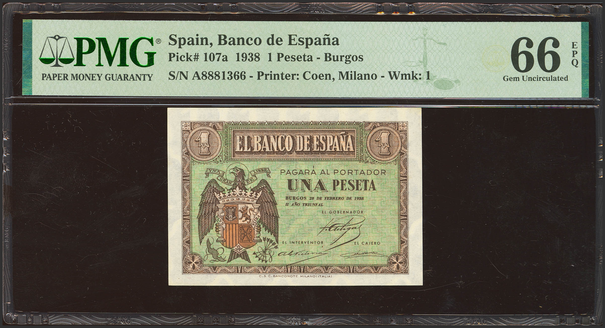1 Pesetas. 28 de Febrero de 1938. Serie A. (Edifil 2023: 427, Pick: 107a). Apresto original. SC. Encapsulado PMG66EPQ.