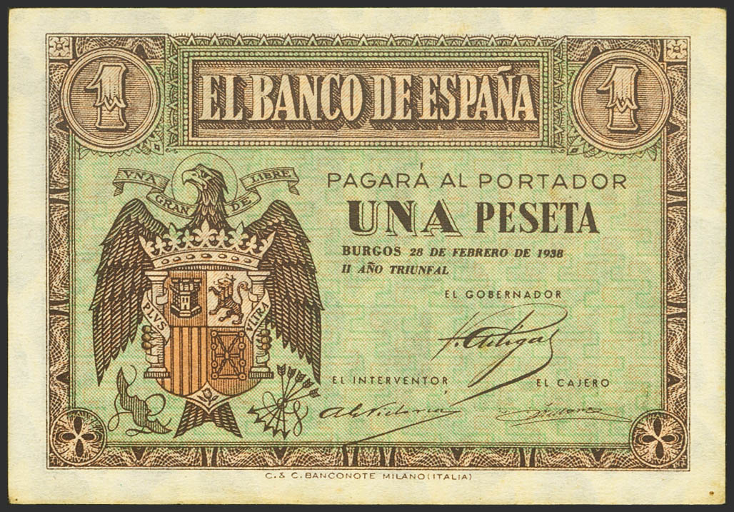 1 Peseta. 28 de Febrero de 1938. Serie B. (Edifil 2021: 427a). Apresto original y manchitas del tiempo. SC-.