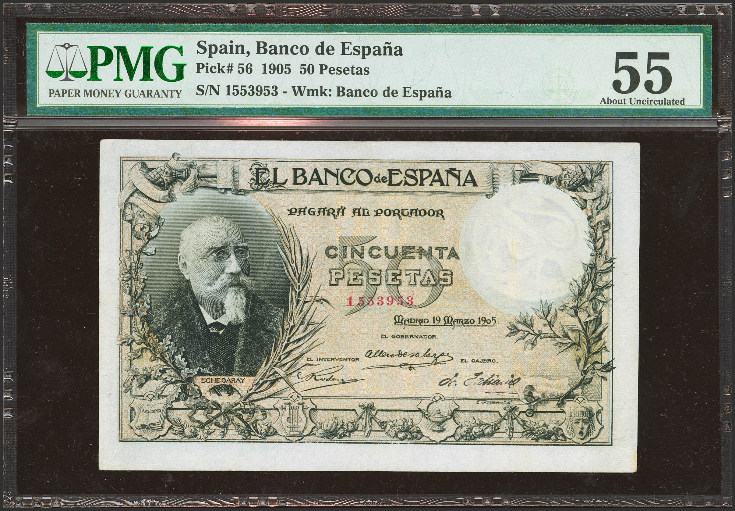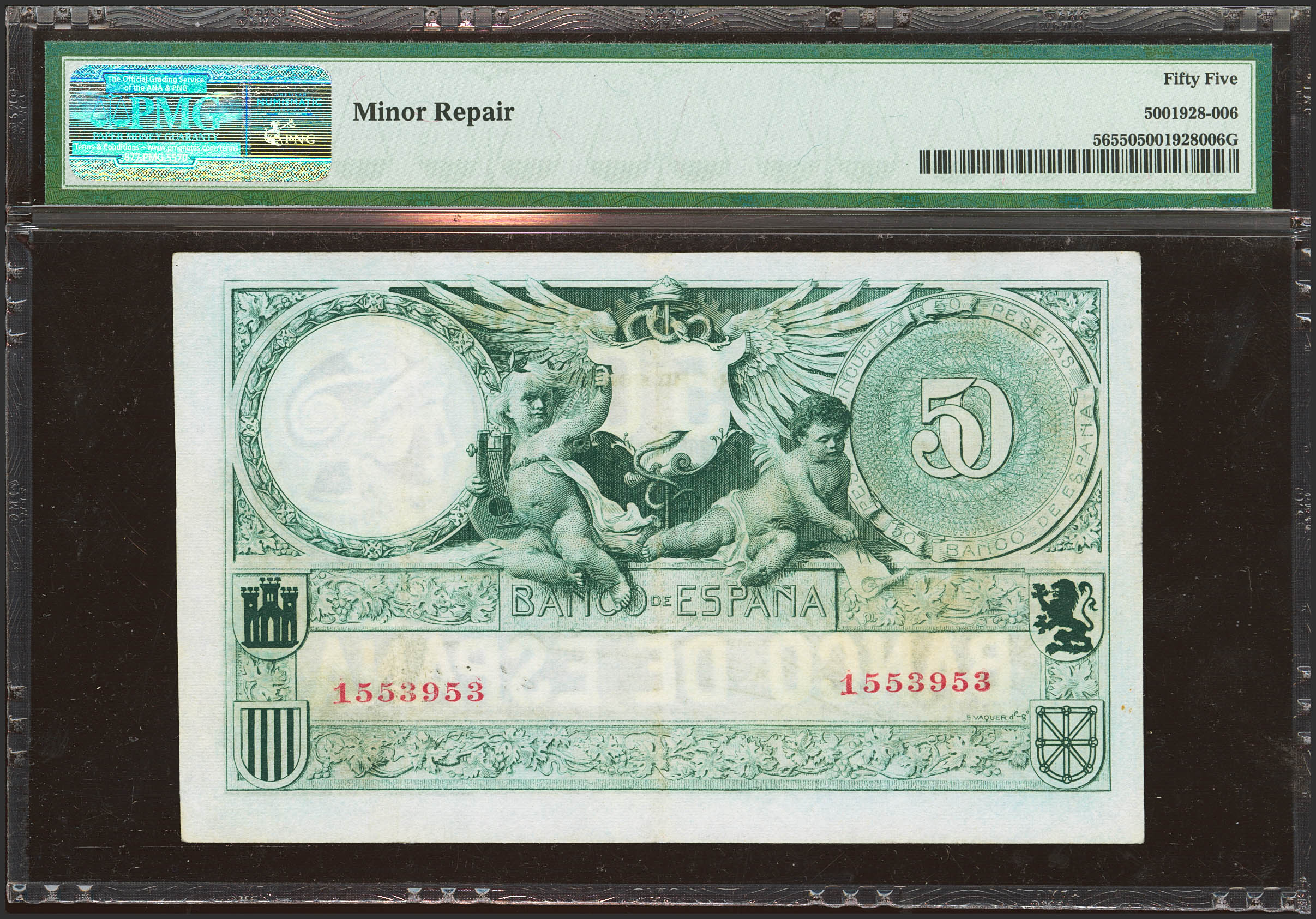50 Pesetas. 19 de Marzo de 1905. Sin serie. (Edifil 2023: 312, Pick: 56). Muy raro especialmente en esta excepcional calidad, mínimamente reparado. EBC+. Encapsulado PMG55 (minor repairs). (para hacernos idea de la rareza, a fecha 1 de Noviembre de 2024, este billete es el tercer mejor calificado junto a otro billete en PMG)