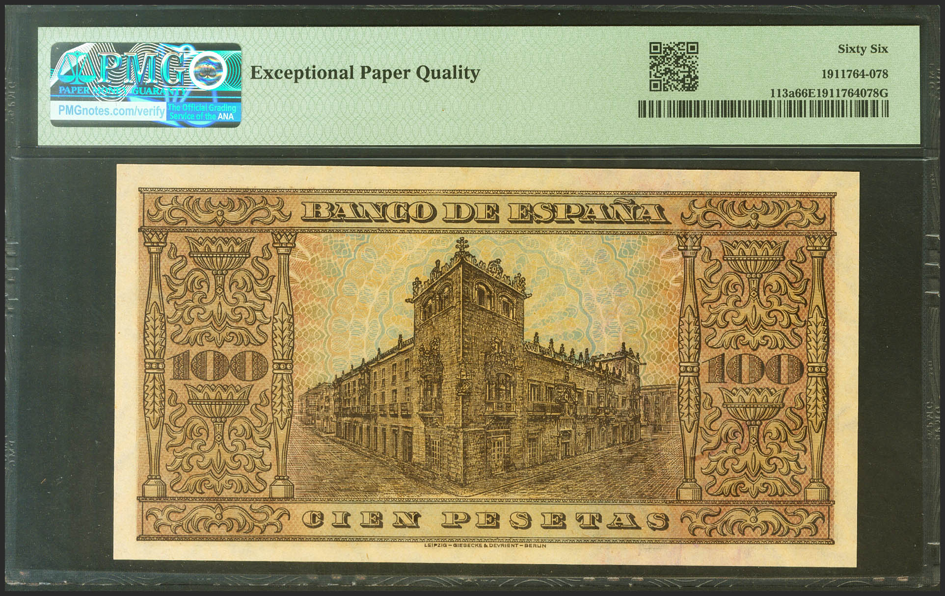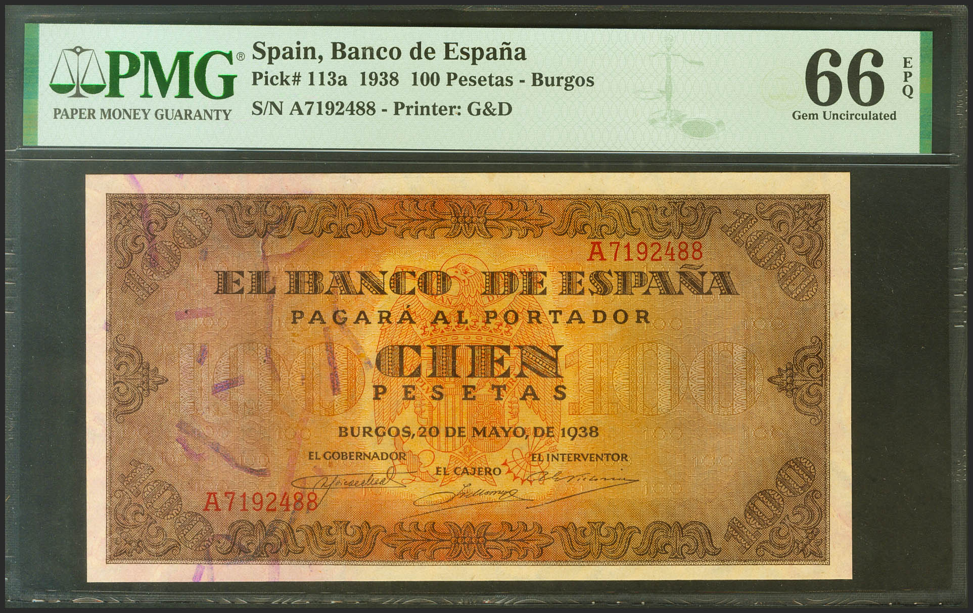 100 Pesetas. 20 de Mayo de 1938. Serie A. (Edifil 2017: 432). Muy raro en esta excepcional calidad, conservando todo su apresto original. SC. Encapsulado PMG66EPQ.