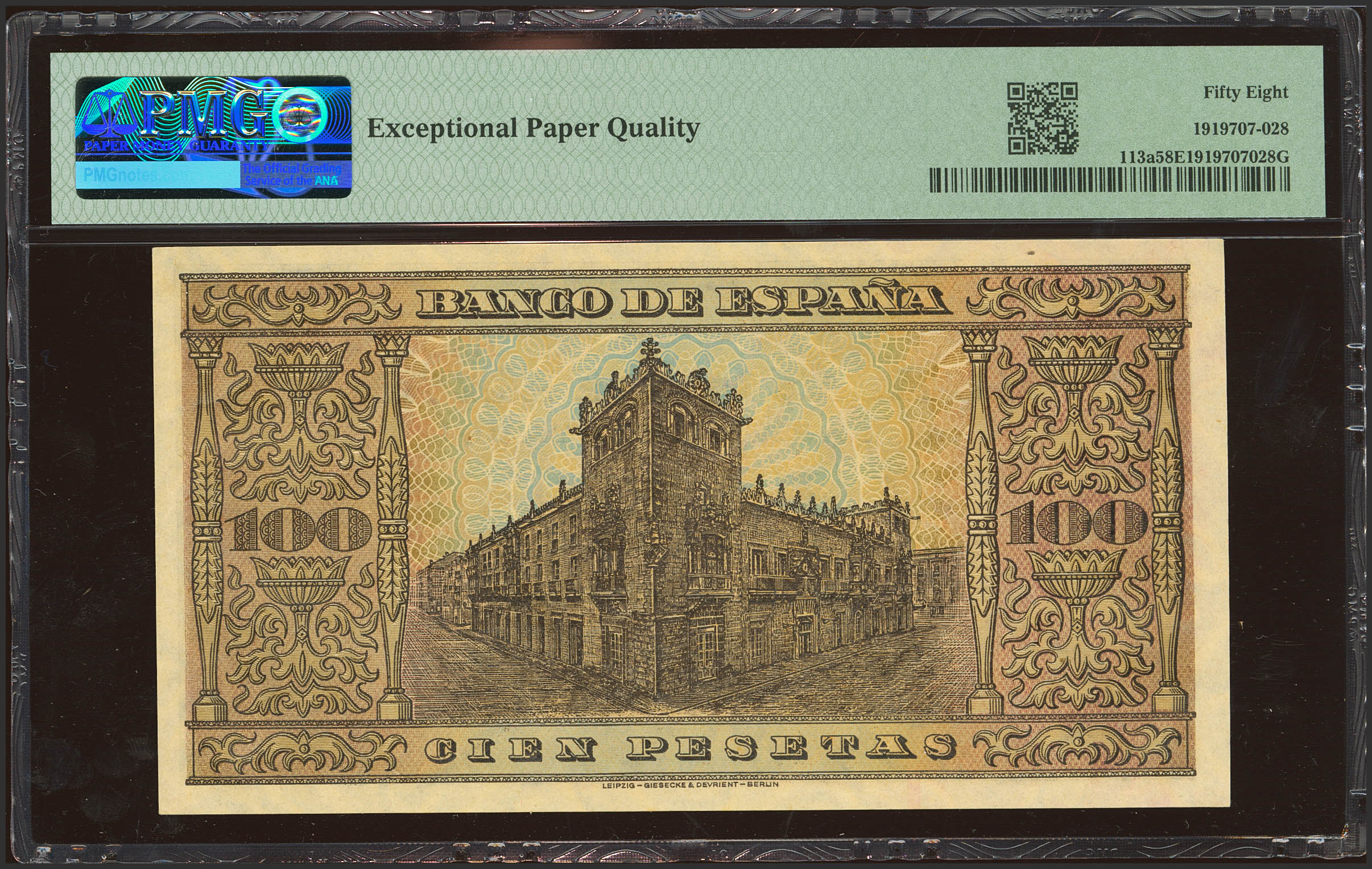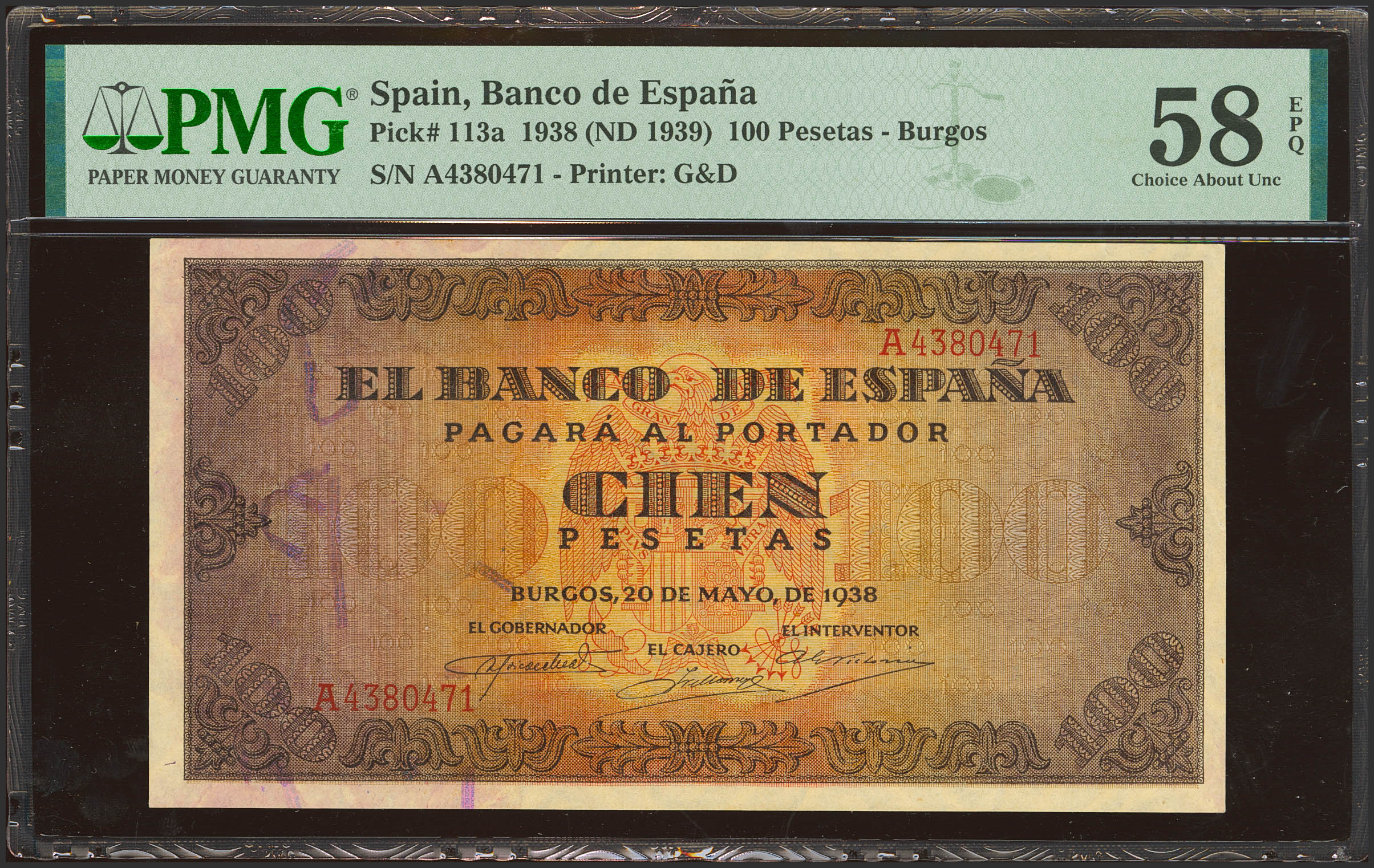 100 Pesetas. 20 de Mayo de 1938. Serie A. (Edifil 2023: 432, Pick: 113a). Apresto original. EBC+++. Encapsulado PMG58EPQ.