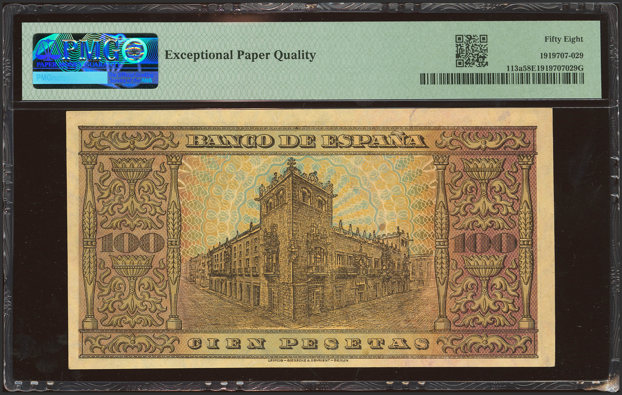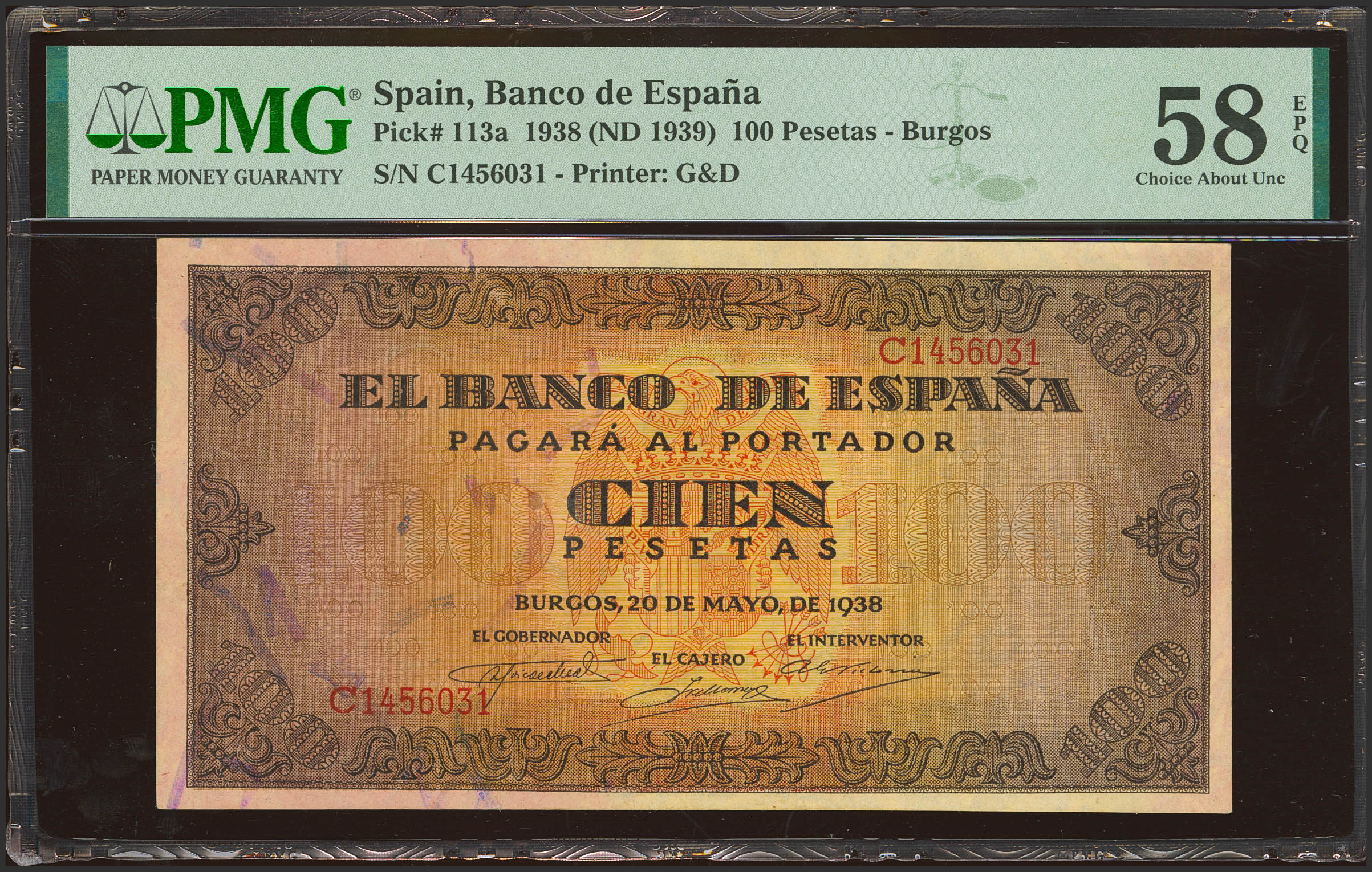 100 Pesetas. 20 de Mayo de 1938. Serie C. (Edifil 2023: 432a, Pick: 113a). Apresto original. EBC+++. Encapsulado PMG58EPQ.