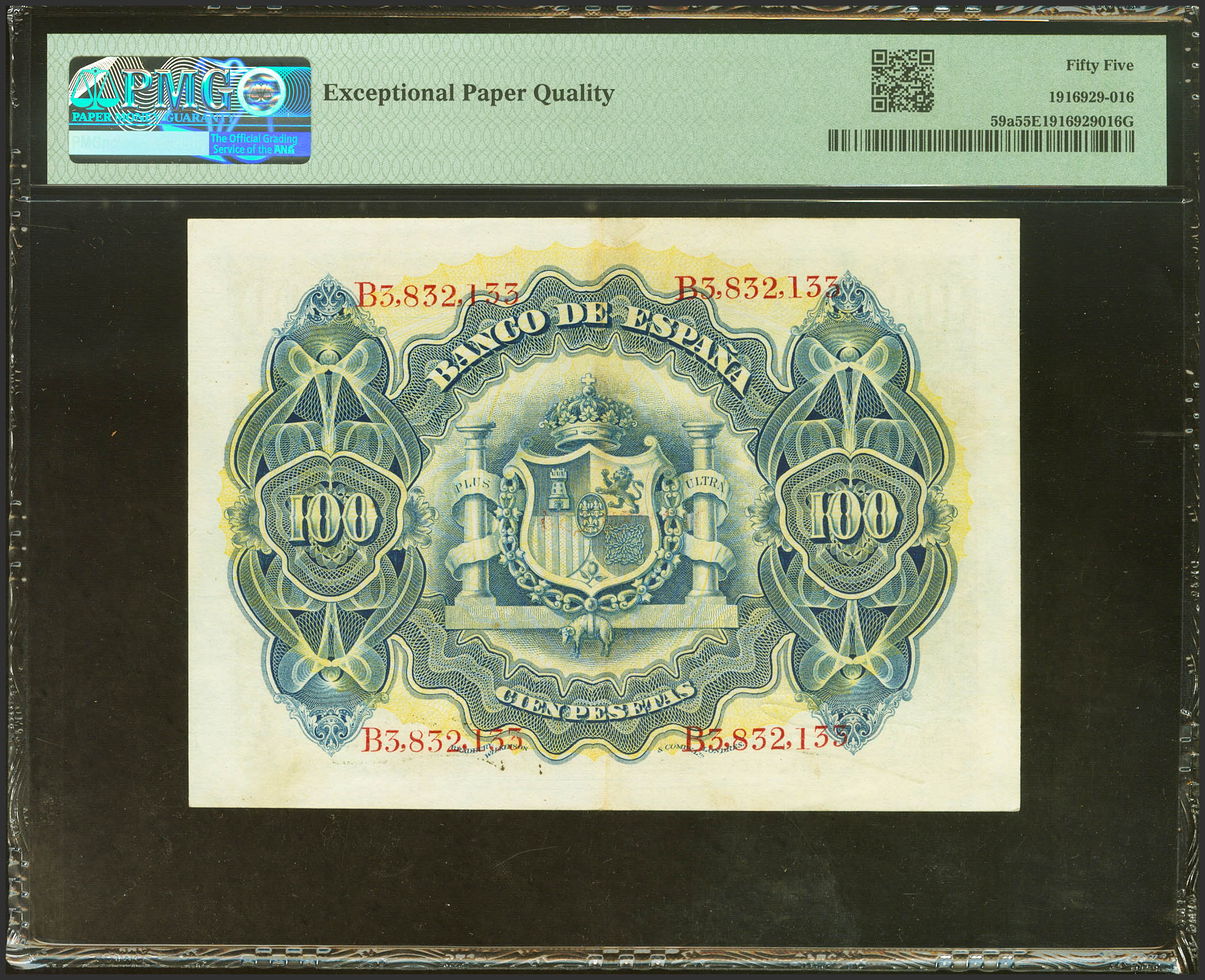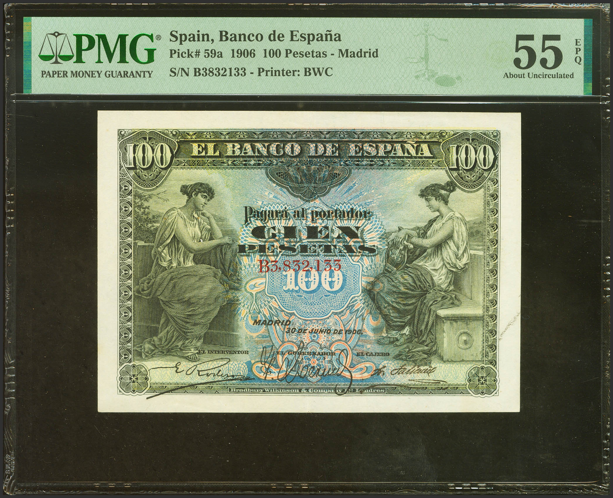 100 Pesetas. 30 de Junio de 1906. Serie B. (Edifil 2023: 313a, Pick: 59a). Apresto original. EBC++. Encapsulado PMG55EPQ.