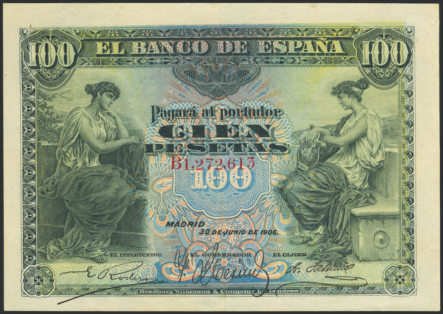 100 Pesetas. 30 de Junio de 1906. Serie B. (Edifil 2023: 313a). Conserva parte de su apresto original. MBC+.