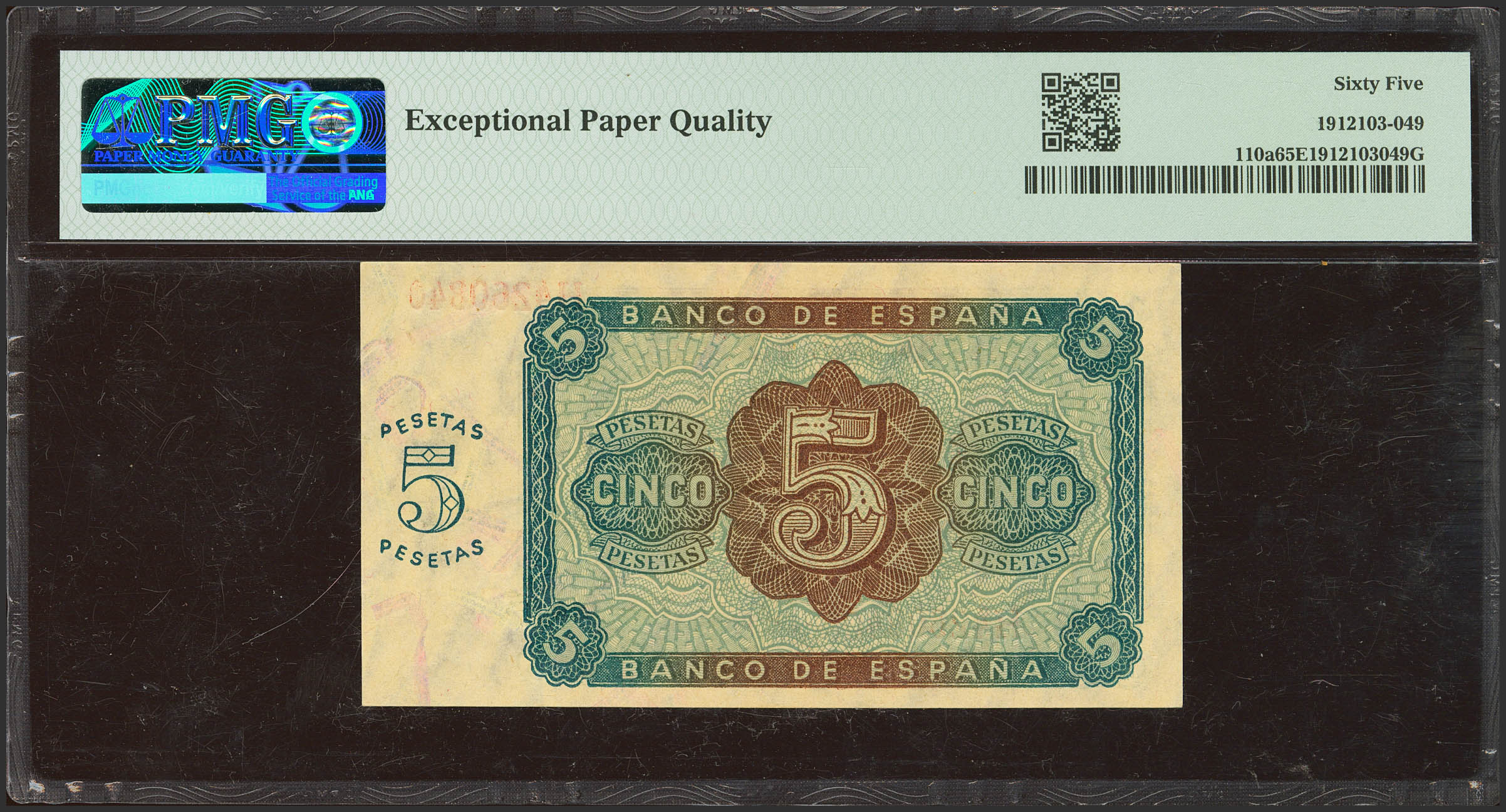 5 Pesetas. 10 de Agosto de 1938. Serie H. (Edifil 2021: 435a, Pick: 110a). Inusual en esta excepcional calidad, apresto original. SC. Encapsulado PMG65EPQ.