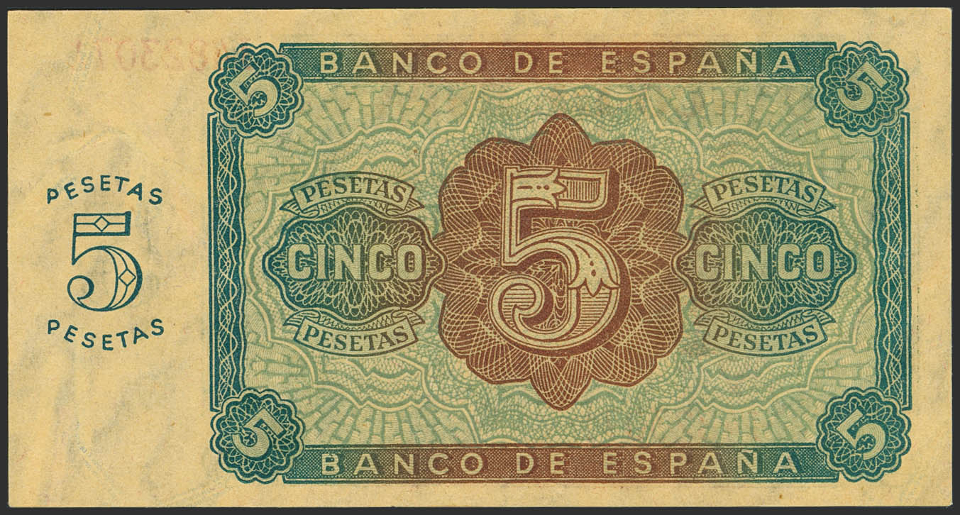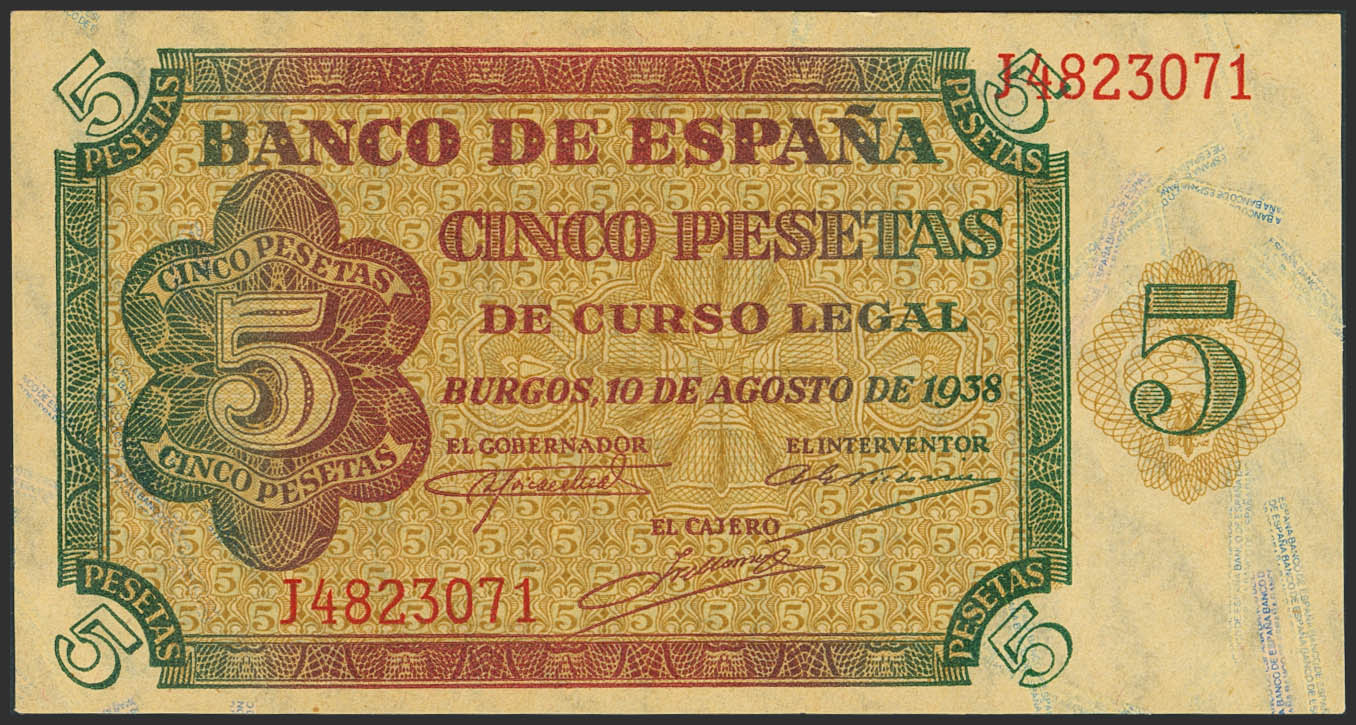 5 Pesetas. 10 de Agosto de 1938. Serie J. (Edifil 2023: 435a). Apresto original. SC-.