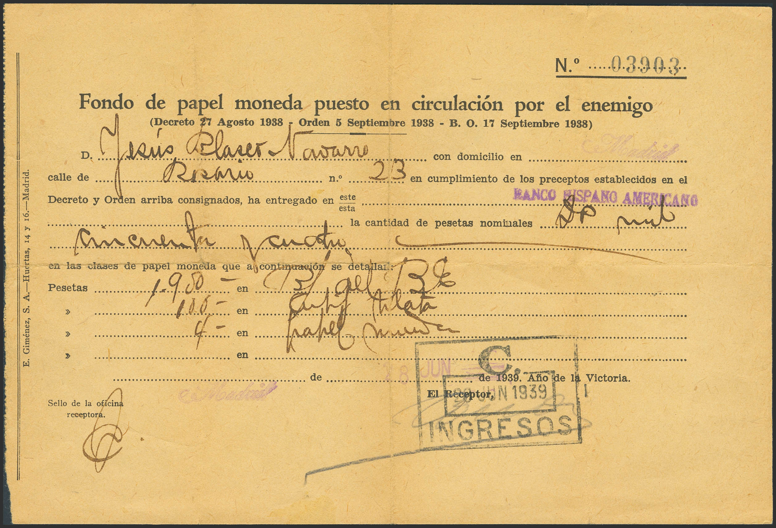 MADRID. Fondo de Papel-Moneda puesto en circulación por el enemigo por valor de 1954 Pesetas, fechado el 28 de Junio de 1939. MBC-.