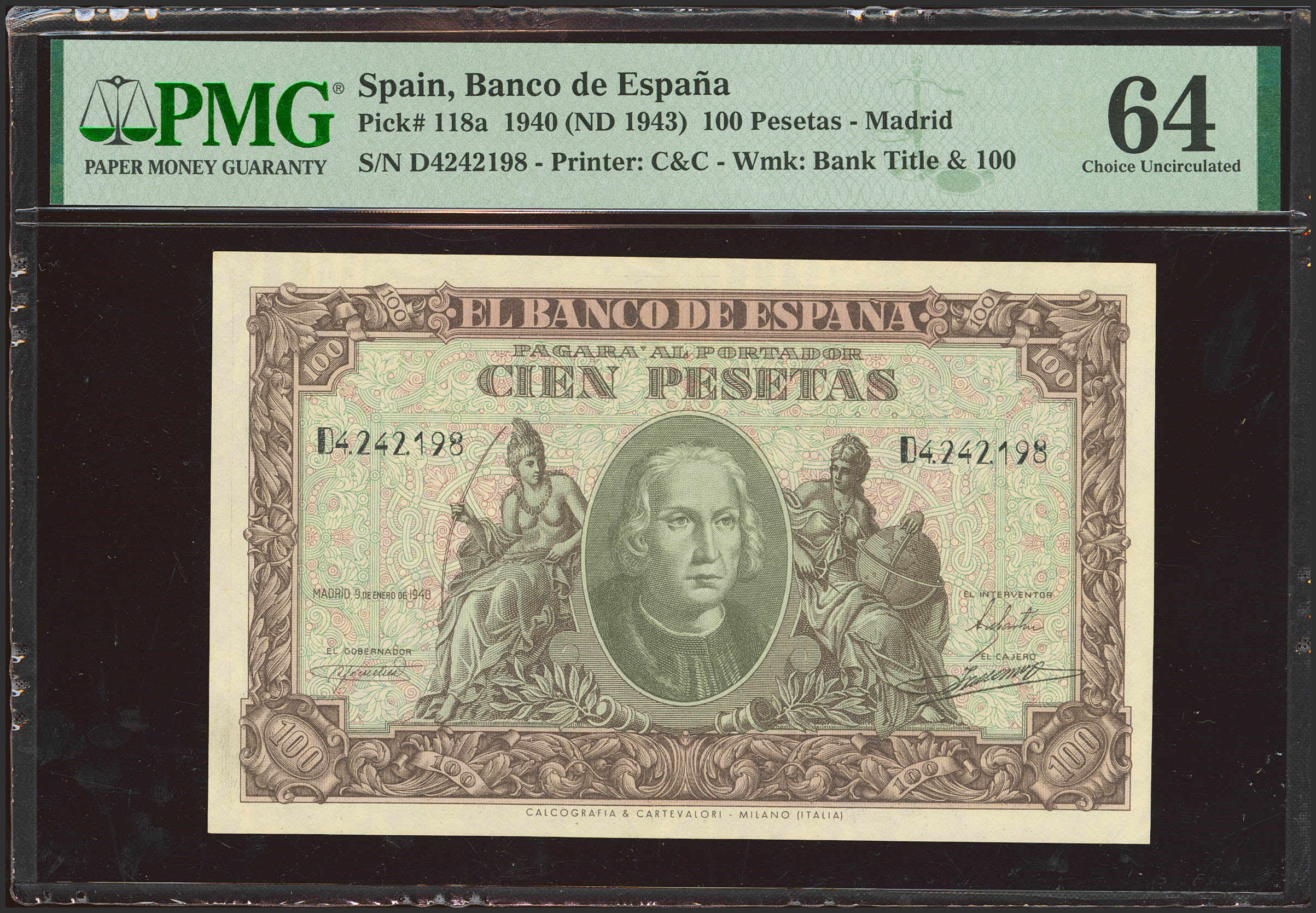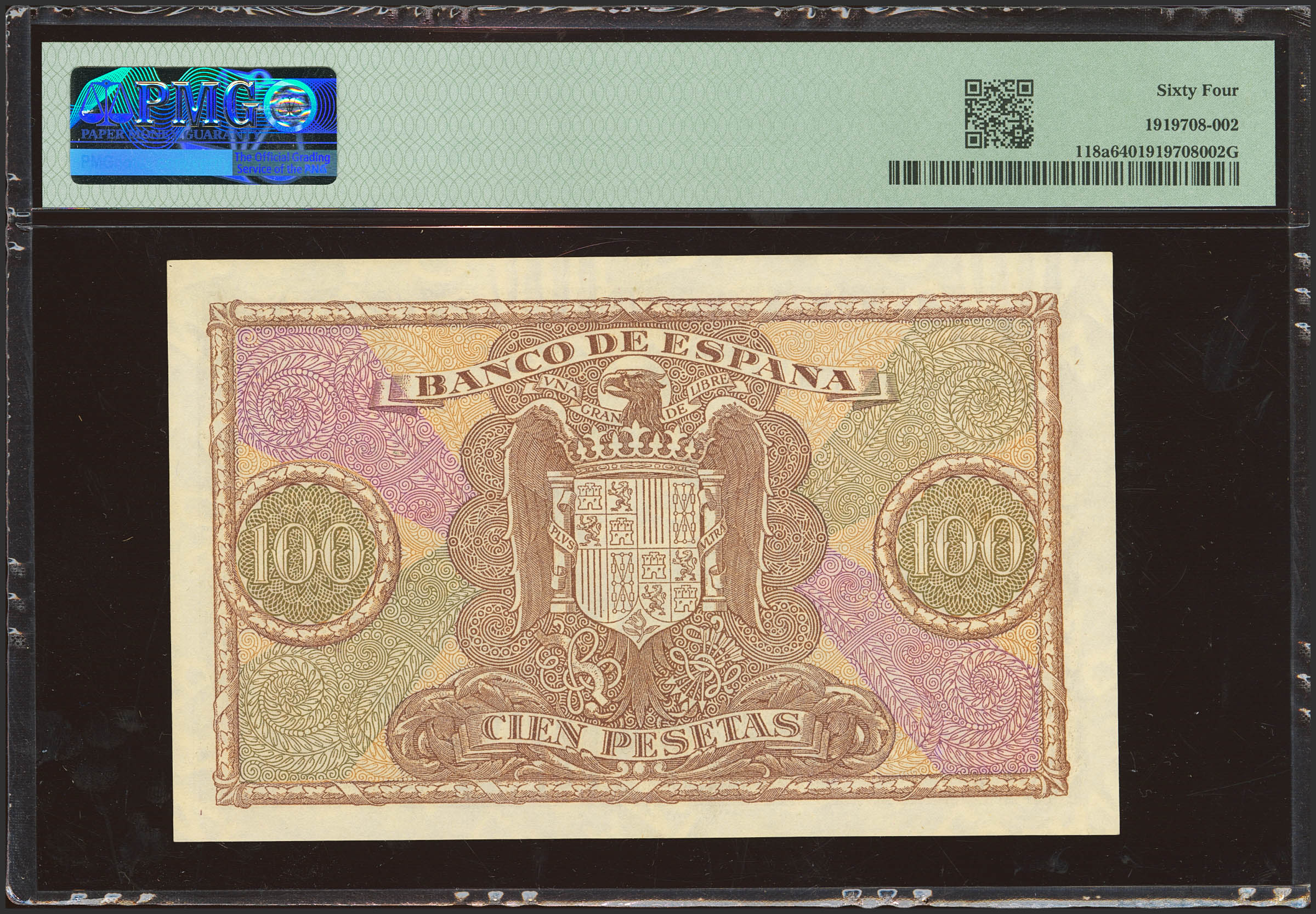 100 Pesetas. 9 de Enero de 1940. Serie D. (Edifil 2023: 438a, Pick: 118a). Inusual en esta calidad. SC. Encapsulado PMG64.
