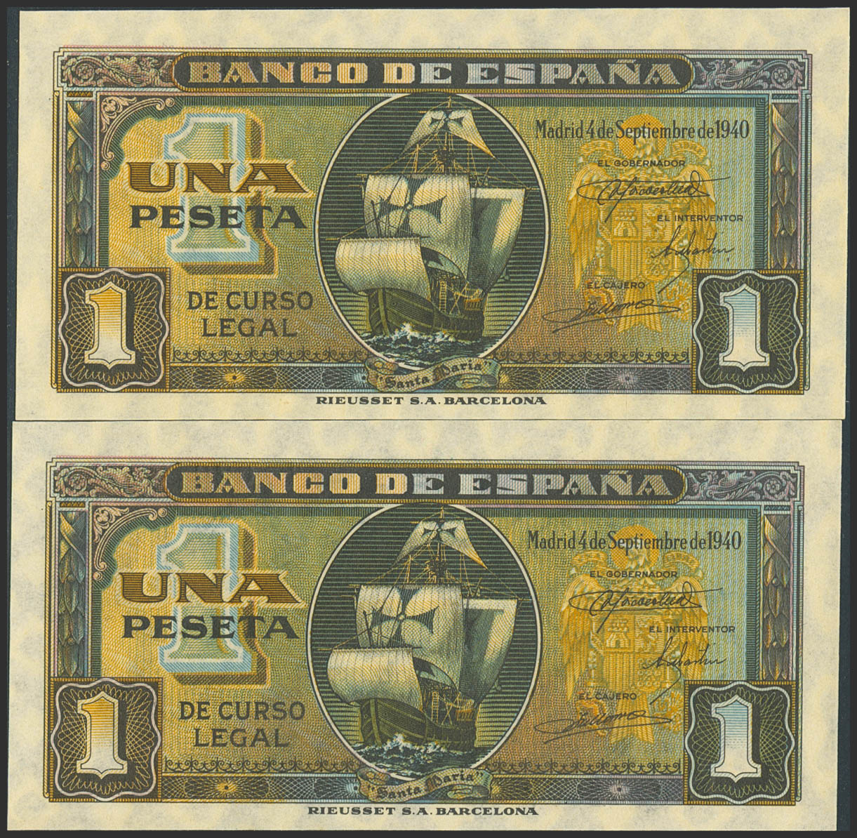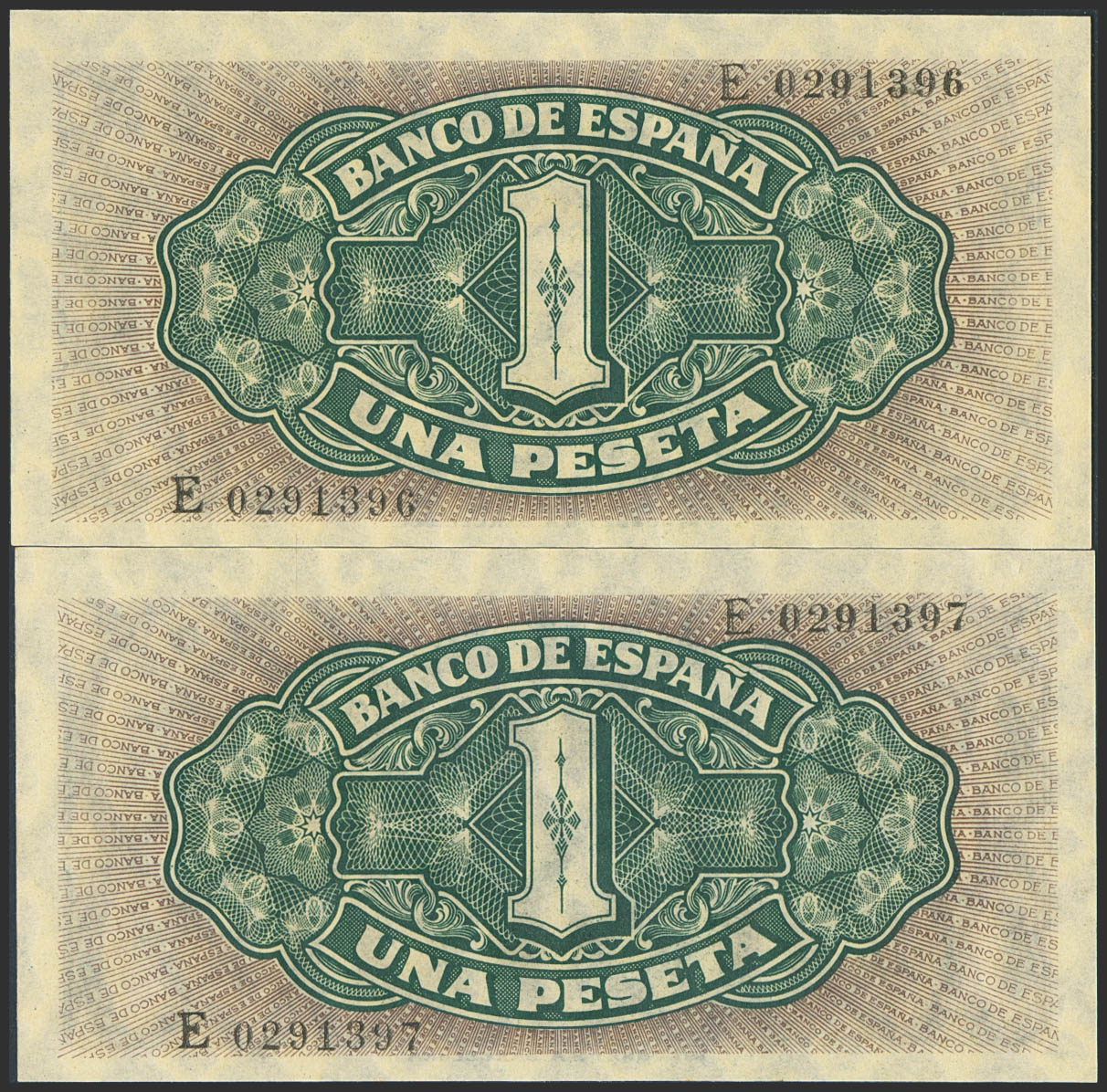 1 Peseta. 4 de Septiembre de 1940. Pareja correlativa. Serie E. (Edifil 2023: 442a). Apresto original. SC-.