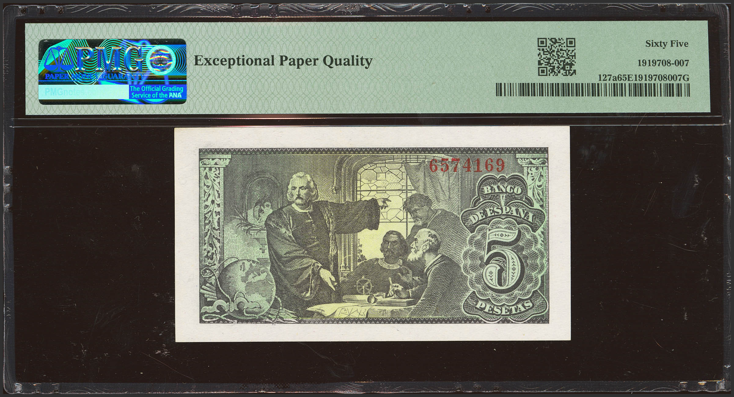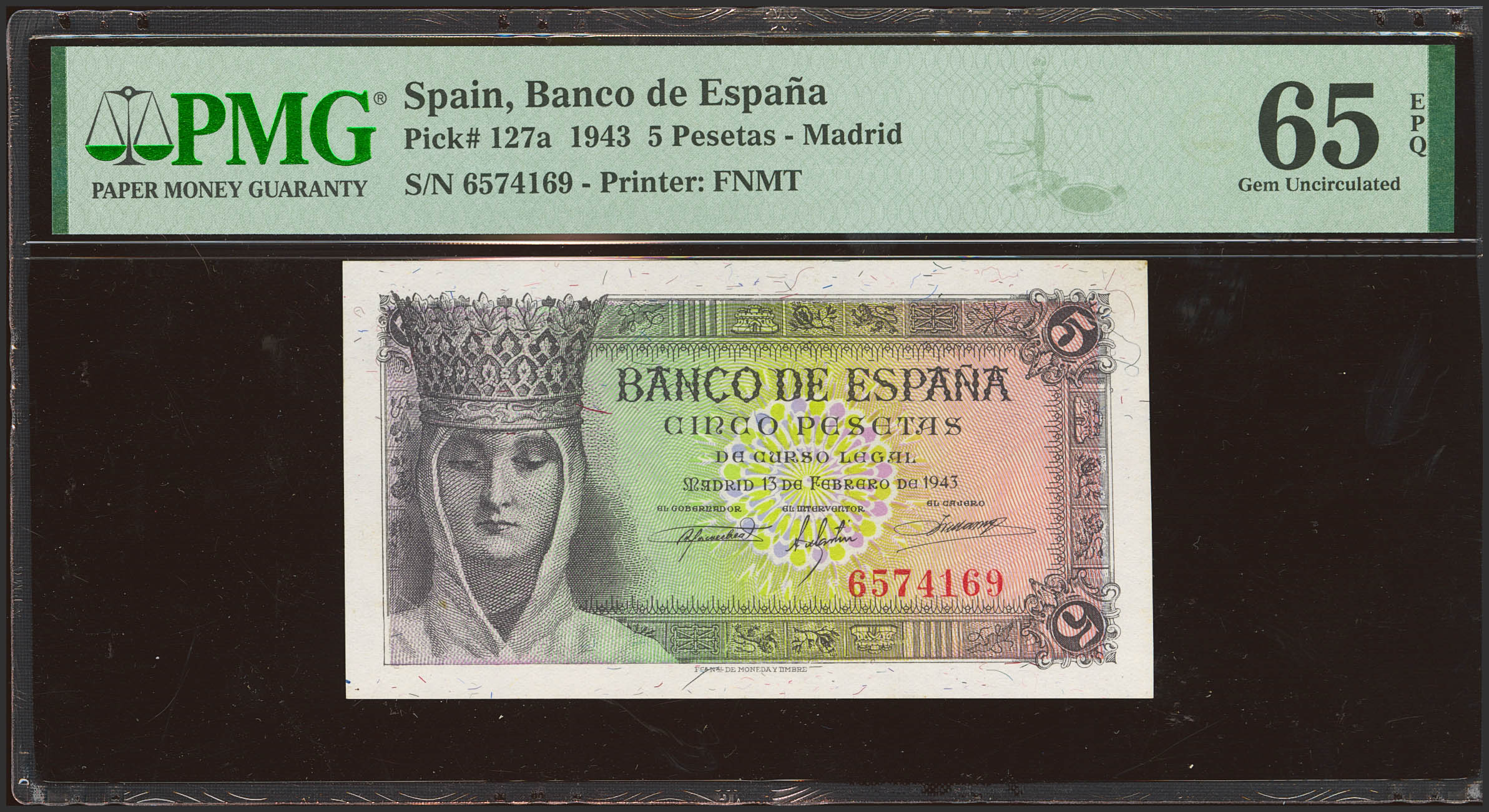 5 Pesetas. 13 de Febrero de 1943. Sin serie. (Edifil 2021: 446, Pick: 127a). Inusual en esta excepcional calidad, apresto original. SC. Encapsulado PMG65EPQ.