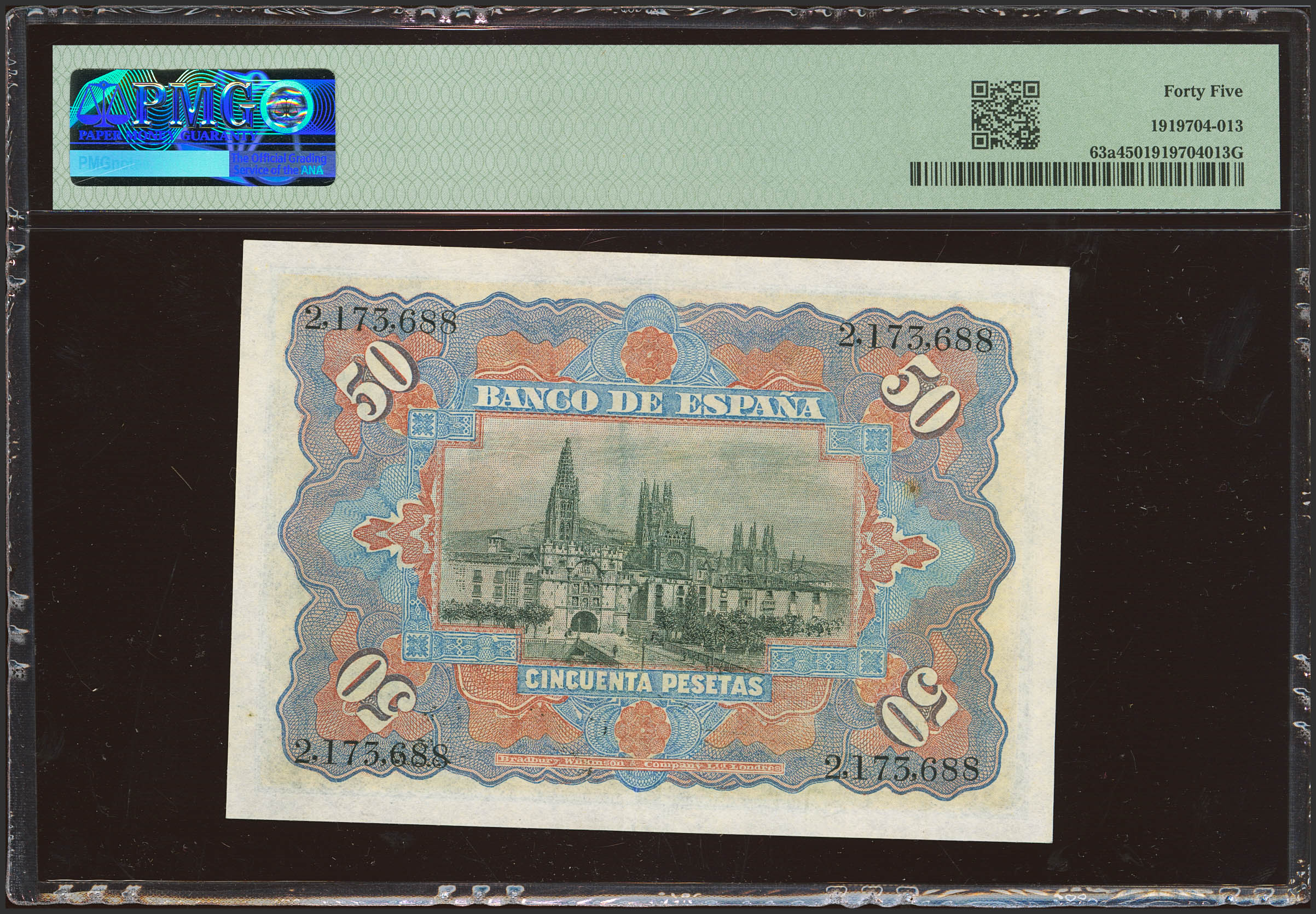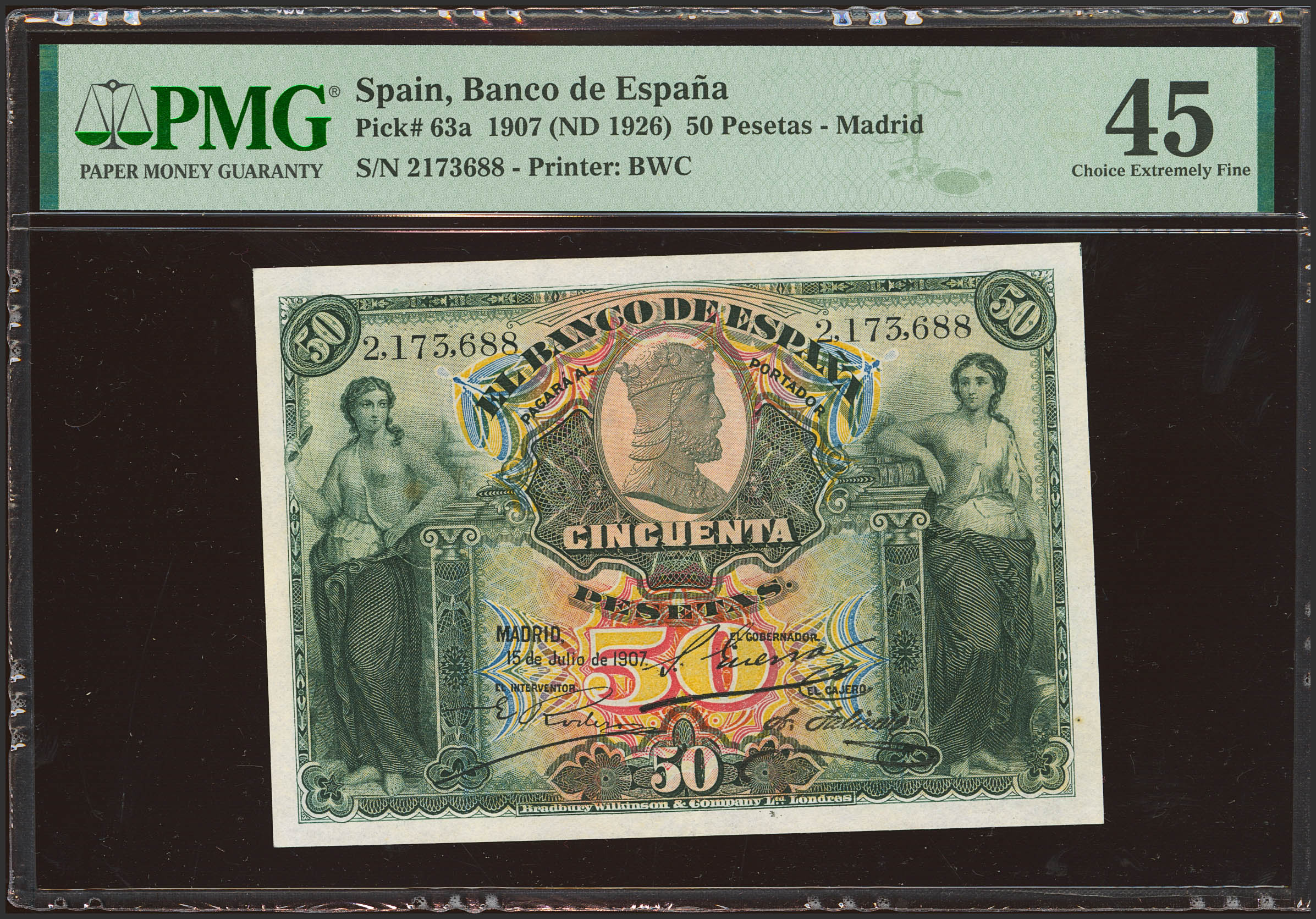 50 Pesetas. 15 de Julio de 1907. Sin serie. (Edifil 2023: 319, Pick: 63a). EBC-. Encapsulado PMG45.