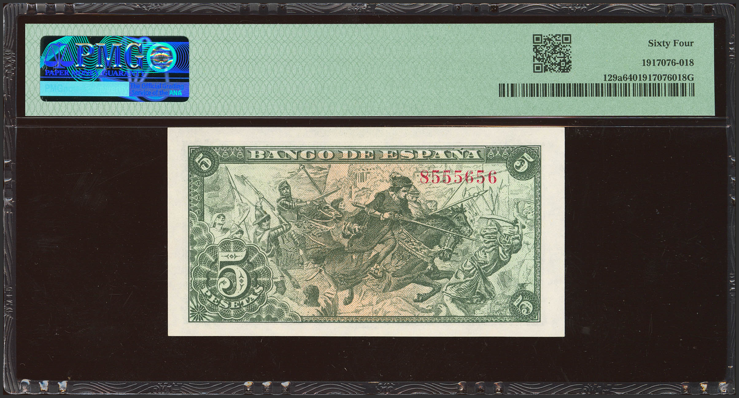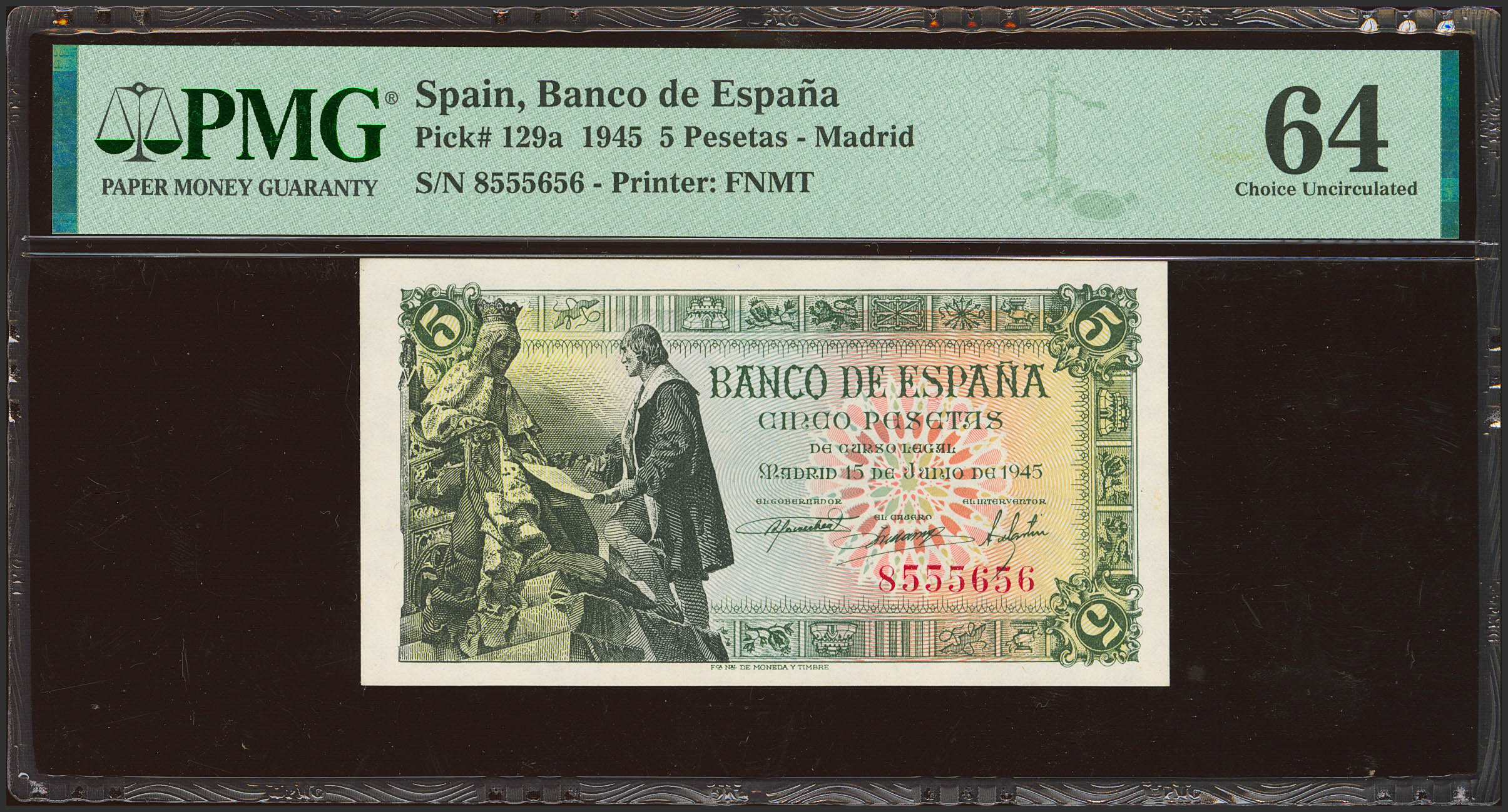 5 Pesetas. 15 de Junio de 1945. Sin serie. (Edifil 2023: 449, Pick: 129a). Inusual en esta calidad. SC. Encapsulado PMG64.