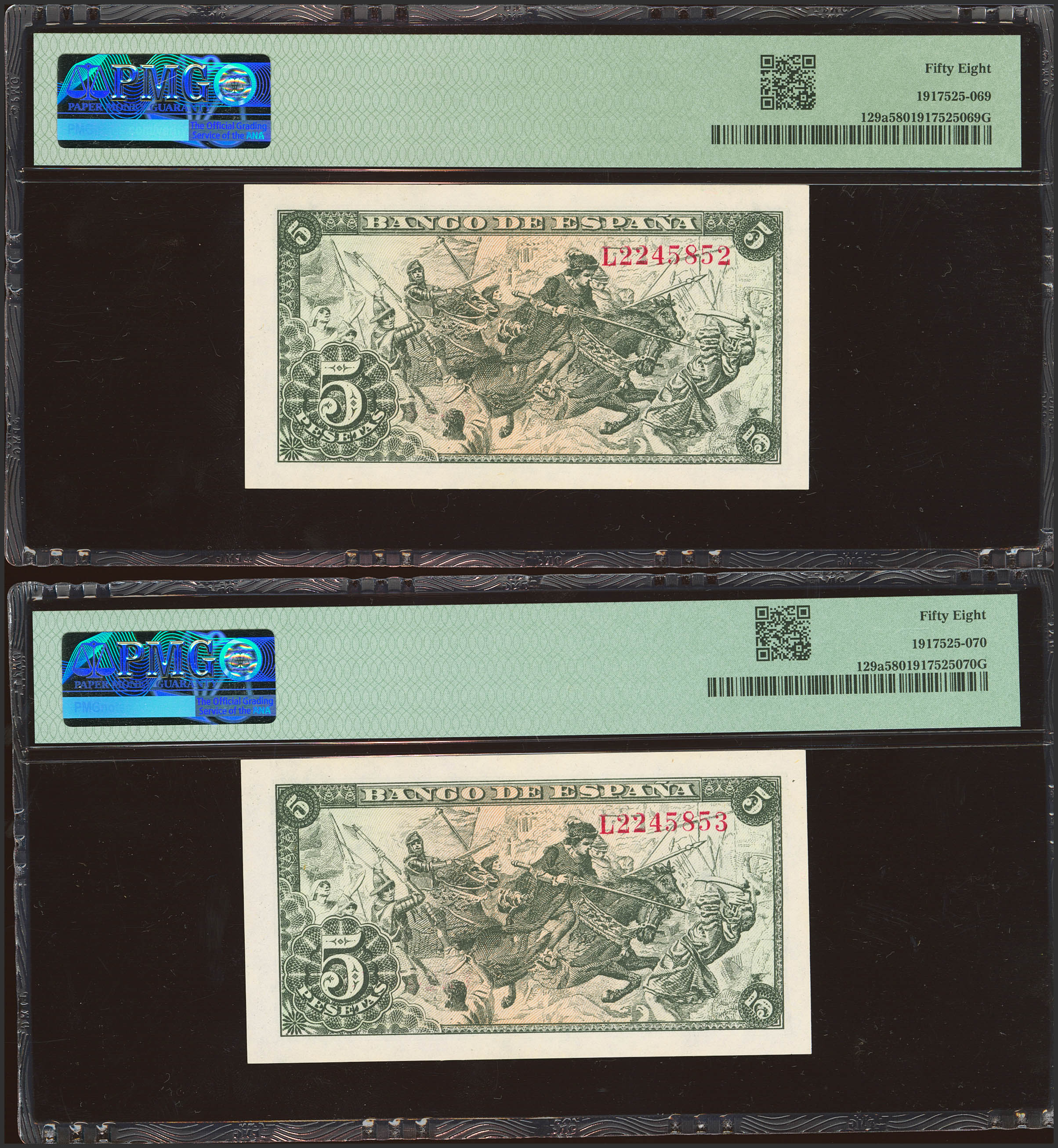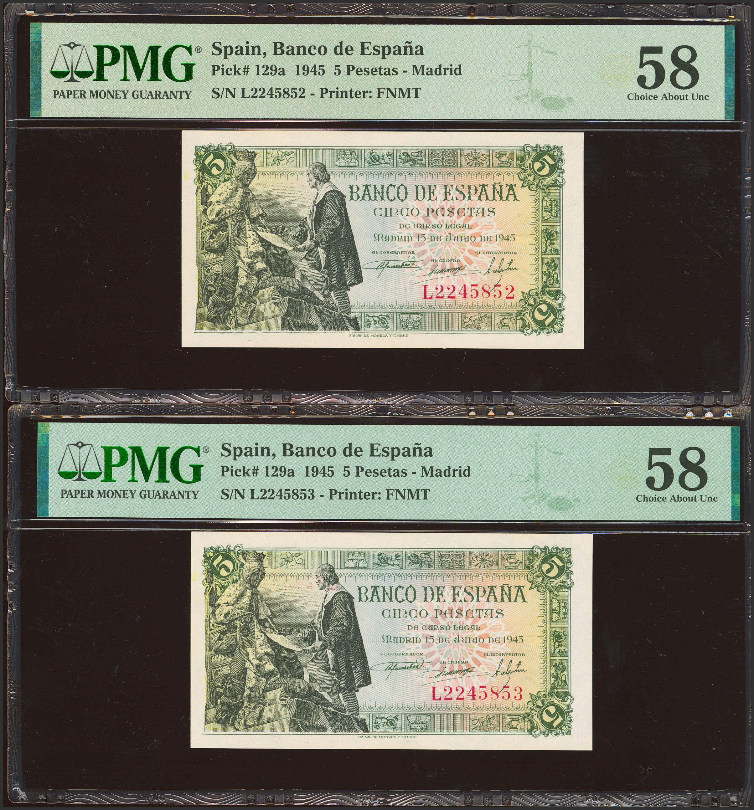 5 Pesetas. 15 de Junio de 1945. Pareja correlativa. Serie L, última serie emitida. (Edifil 2023: 449b, Pick: 129a). EBC++. Encapuslados PMG58, ambos.