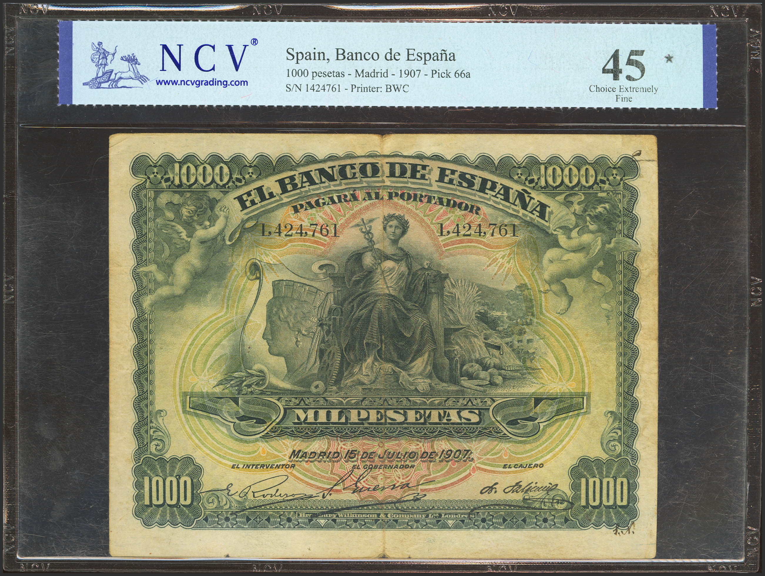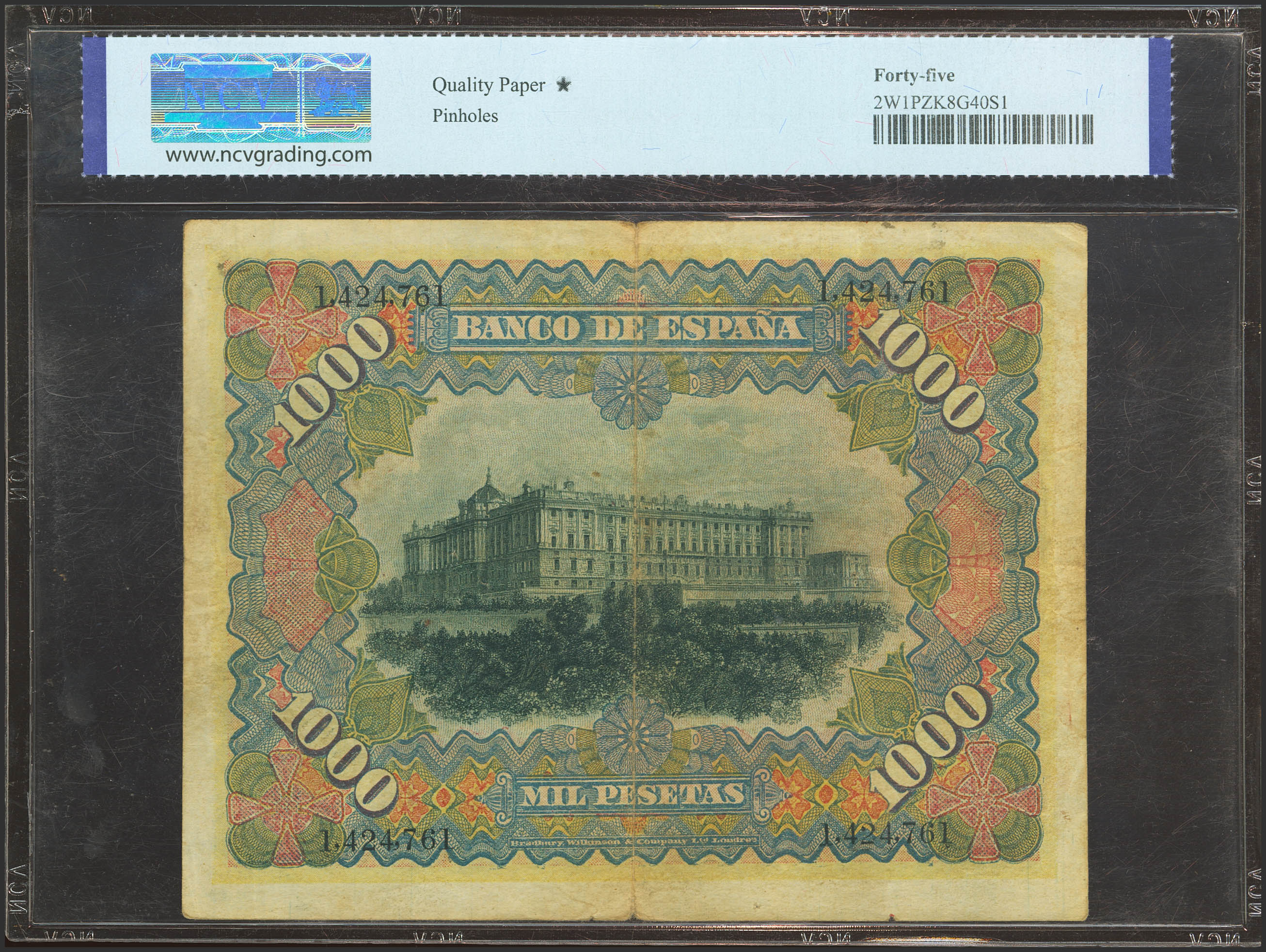 1000 Pesetas. 15 de Julio de 1907. Sin serie. (Edifil 2023: 322, Pick 66a). Raro, puntos de aguja. EBC-. Encapsulado NVC45 (pinholes).