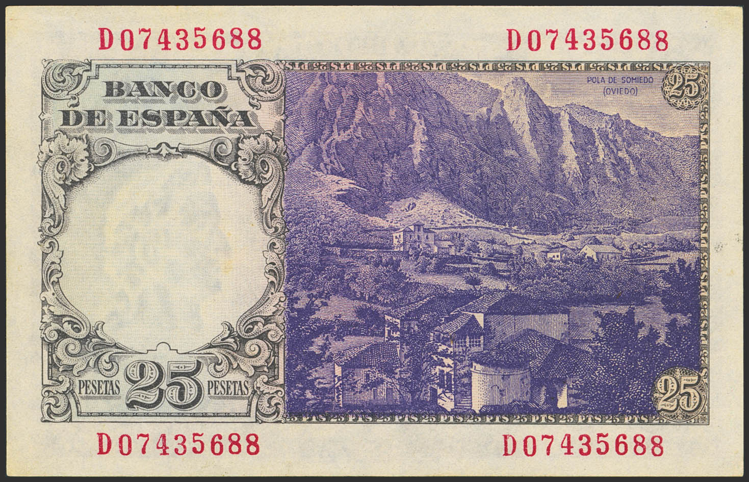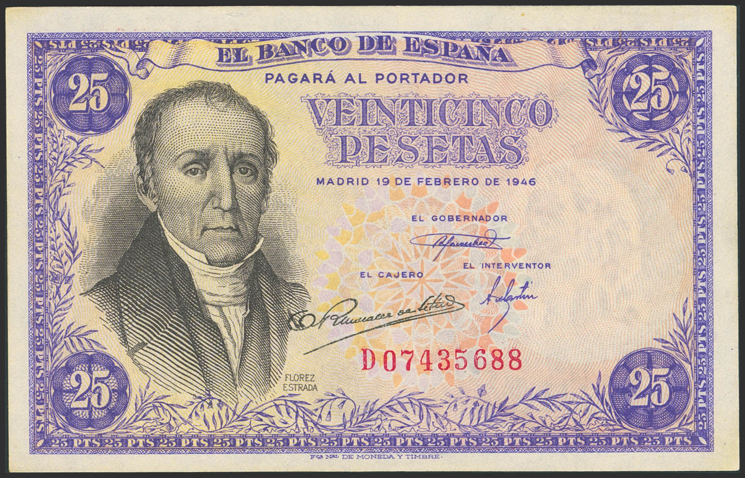 25 Pesetas. 19 de Febrero de 1946. Serie D. (Edifil 2021: 450a). Apresto original. SC-.