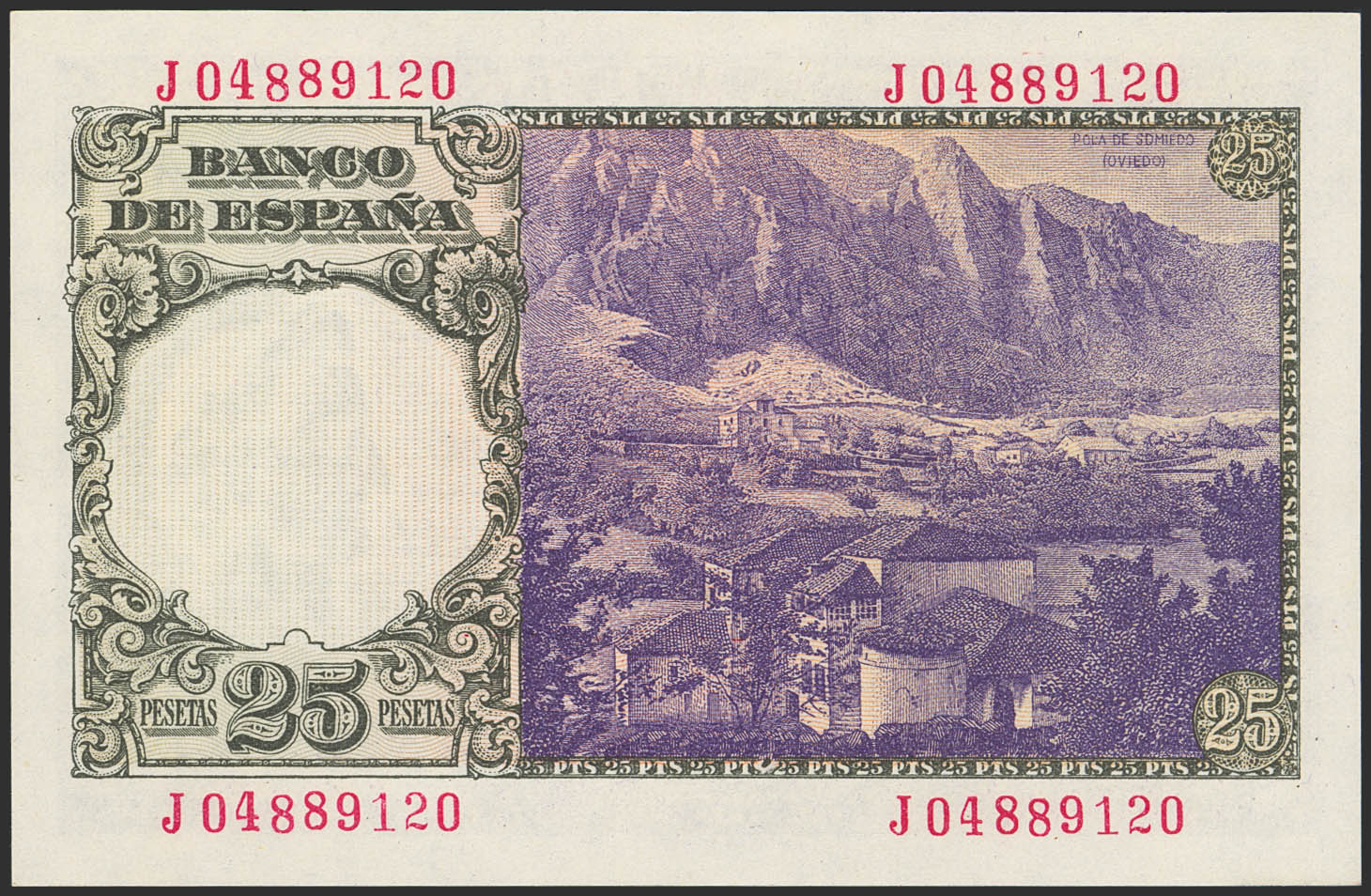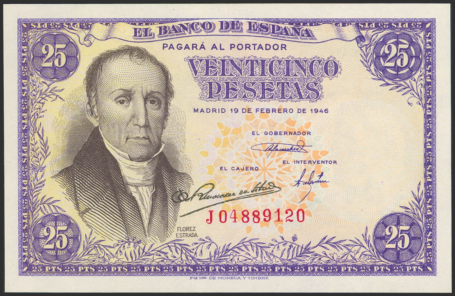 25 Pesetas. 19 de Febrero de 1946. Serie J. (Edifil 2023: 450a). Apresto original. SC.