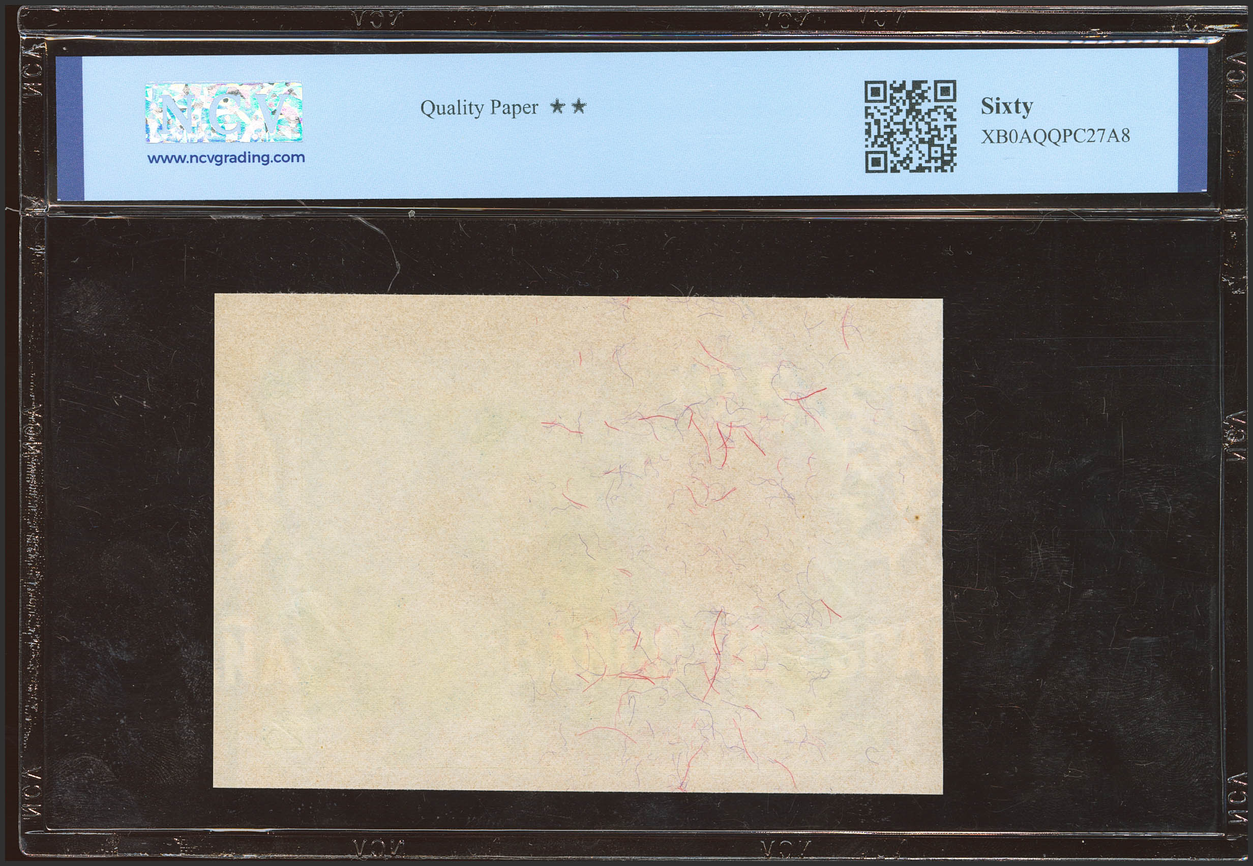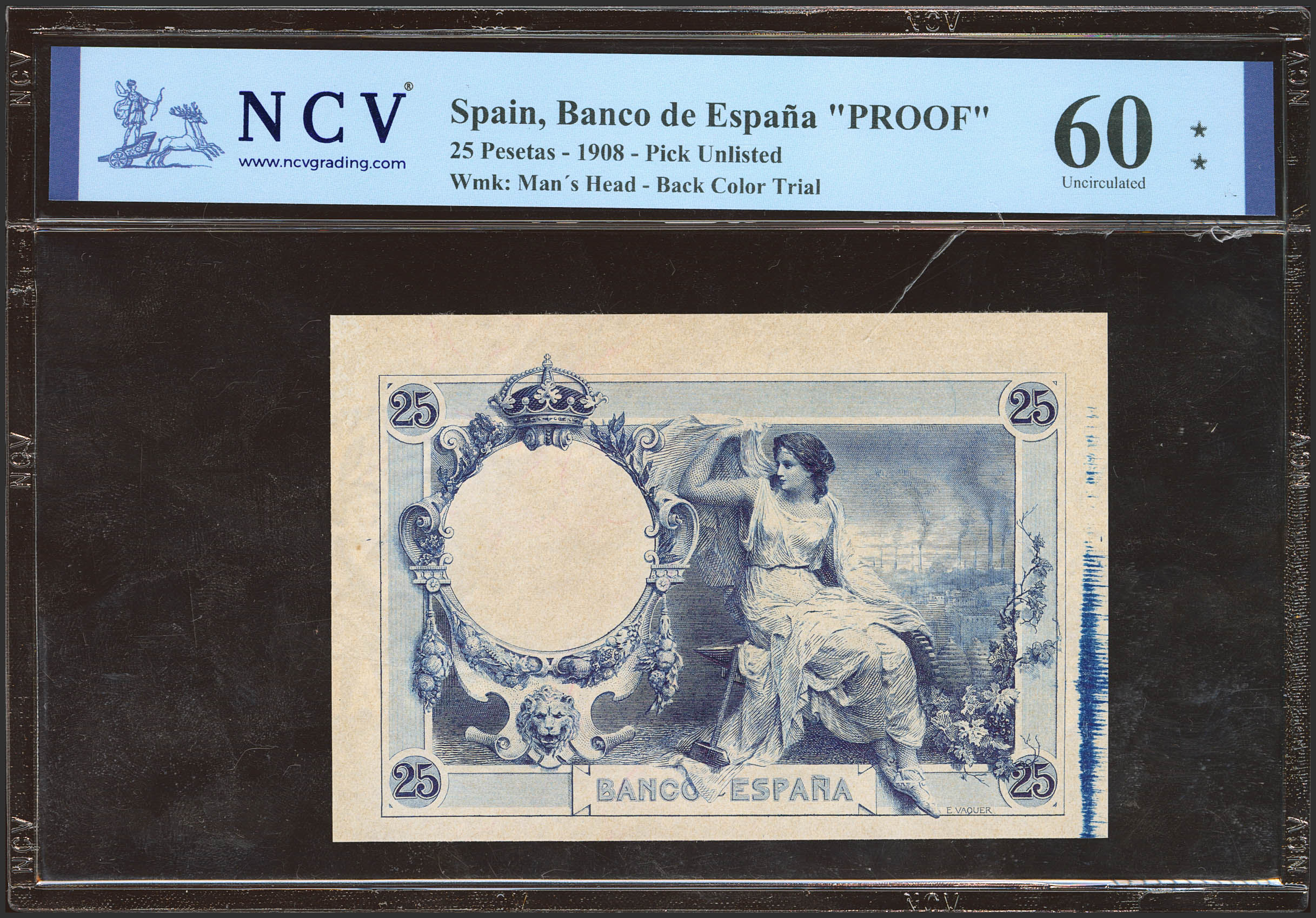 Prueba de color del reverso del 25 Pesetas no emitido en color azul, de la emisión del 1 de Diciembre de 1908. (Edifil 2023: NE14Pb). SC-. Encapsulado NCV60.