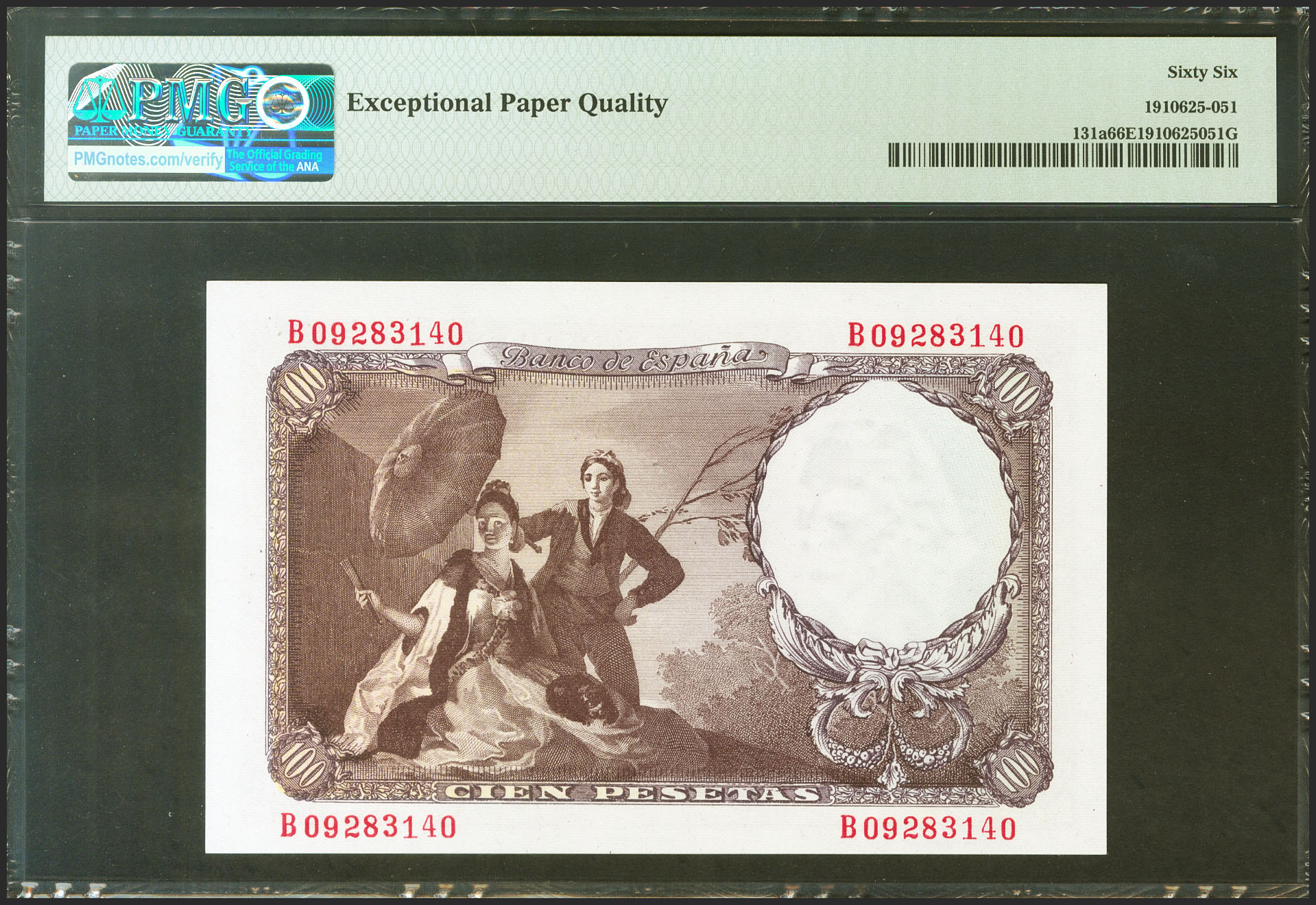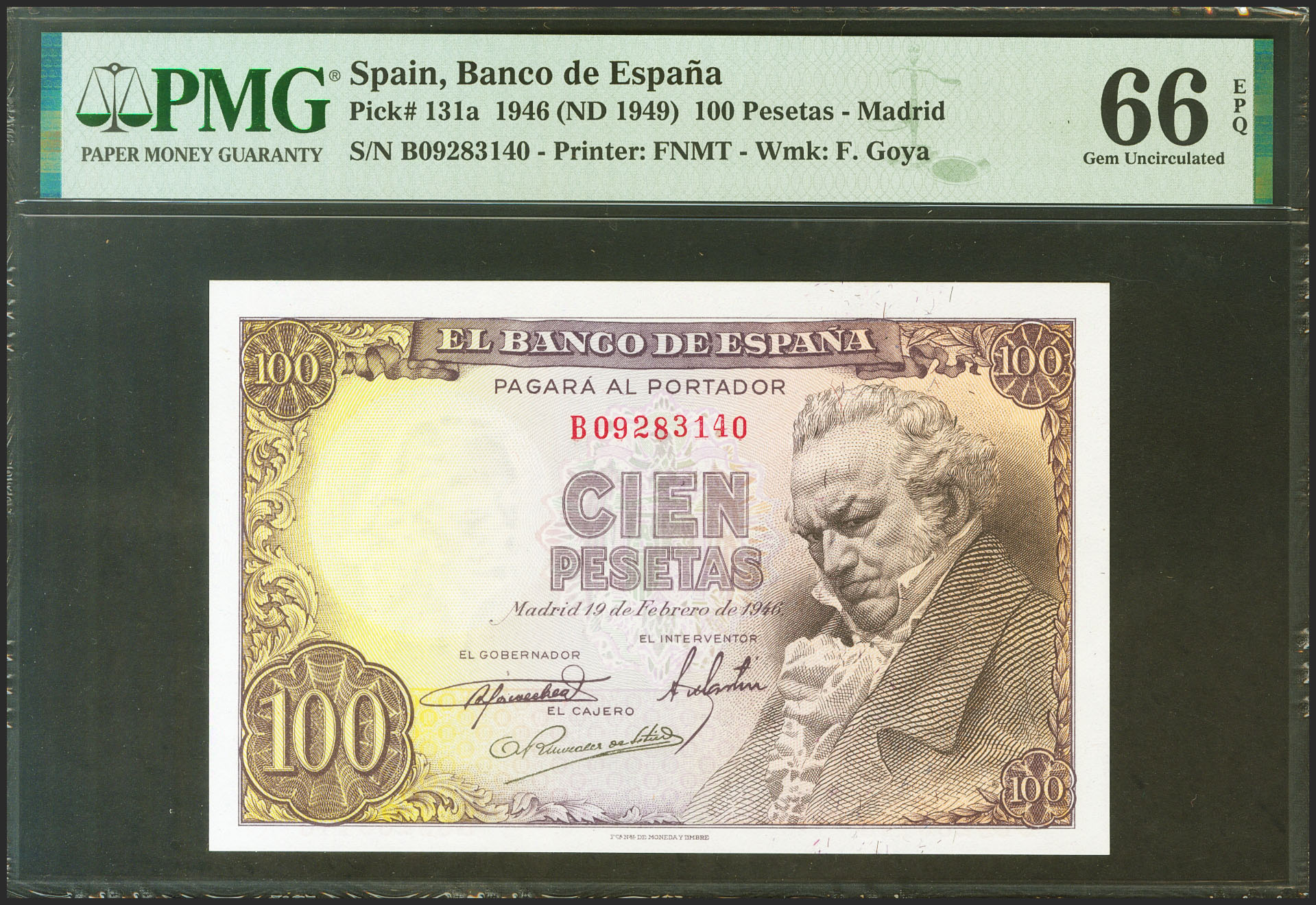 100 Pesetas. 19 de Febrero de 1946. Serie B. (Edifil 2021: 451b). Inusual en esta excepcional calidad, apresto original. SC. Encapsulado PMG66EPQ.