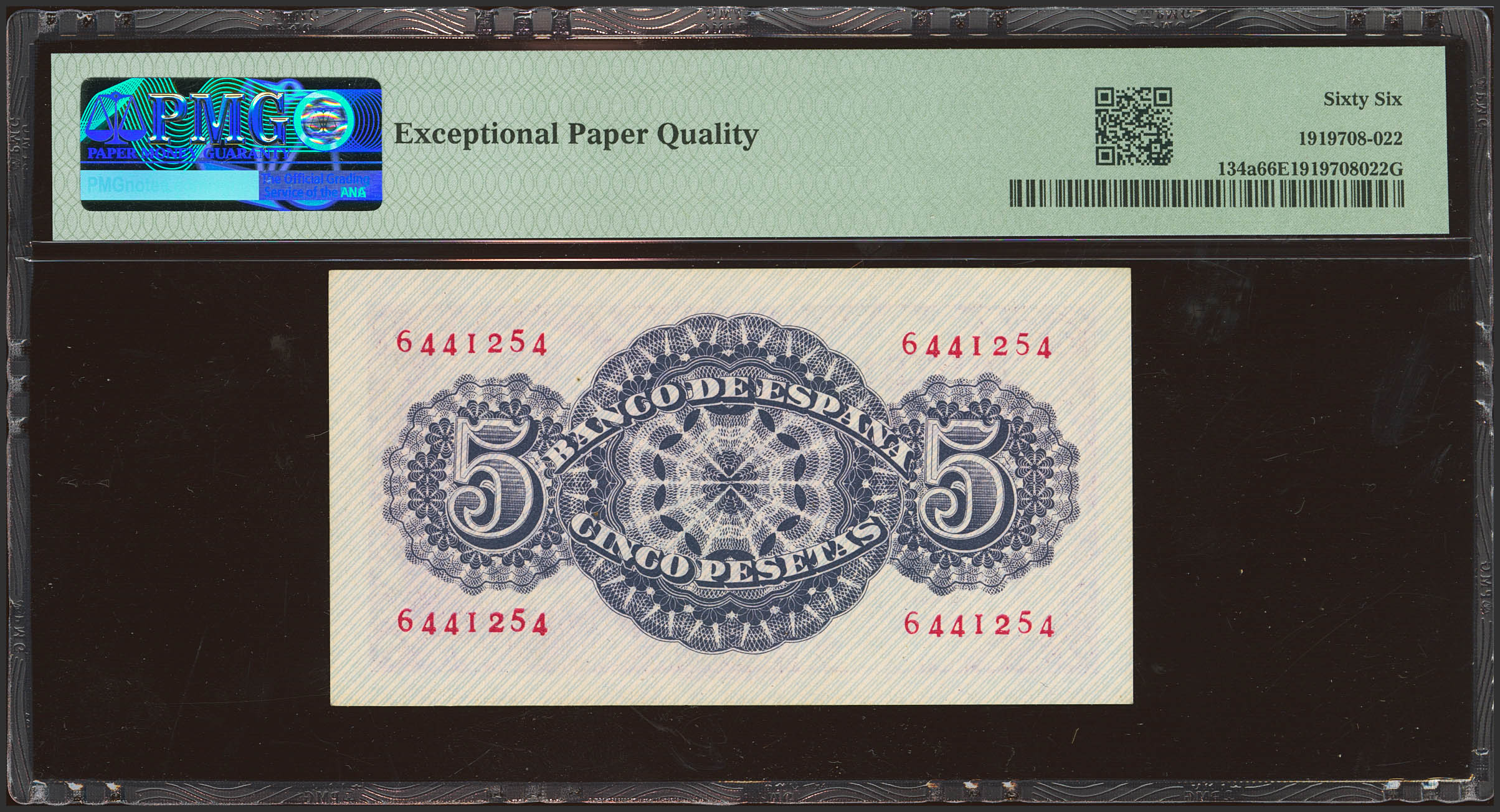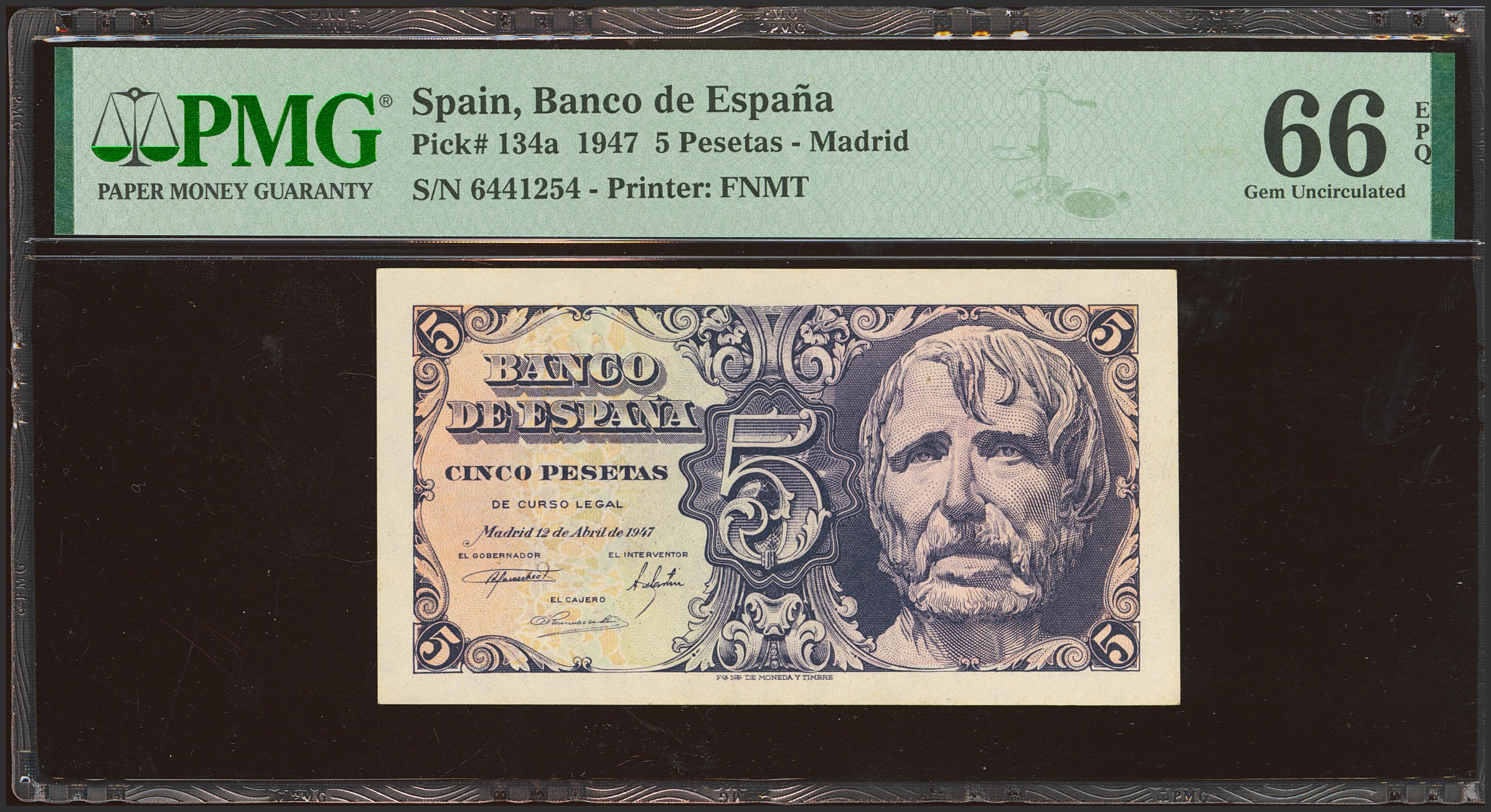 5 Pesetas. 12 de Abril de 1947. Sin serie. (Edifil 2023: 454, Pick: 134a). Raro en esta calidad, apresto original. SC. Encapsulado PMG66EPQ.
