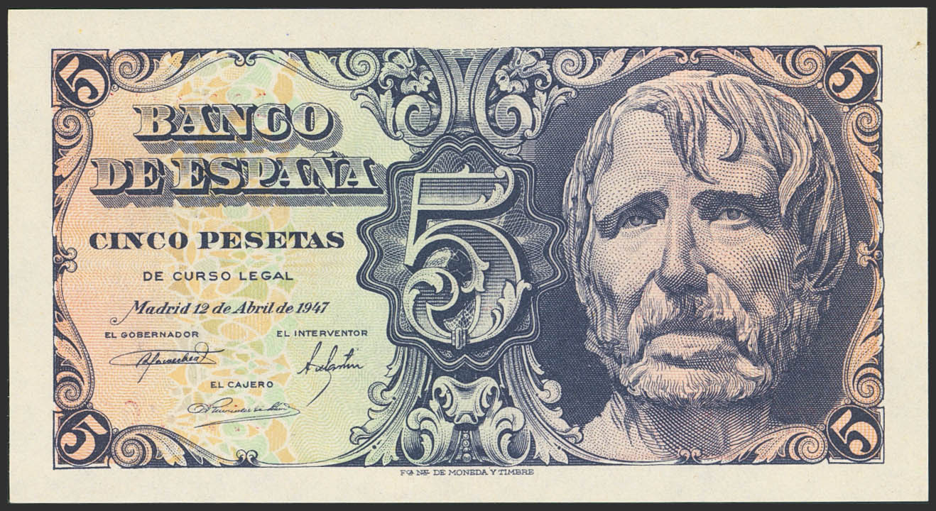 5 Pesetas. 12 de Abril de 1947. Sin serie. (Edifil 2023: 454). Apresto original. SC-.