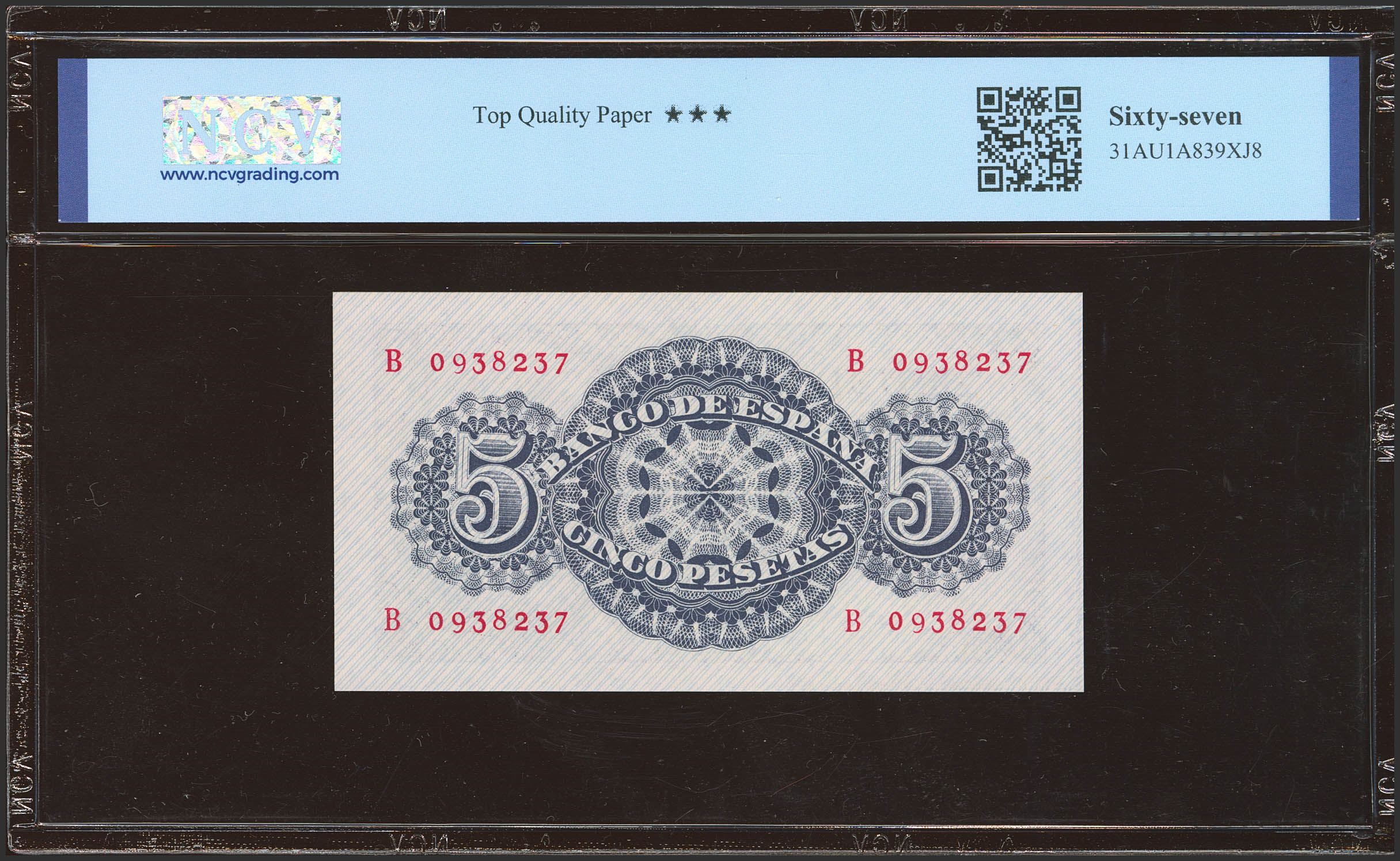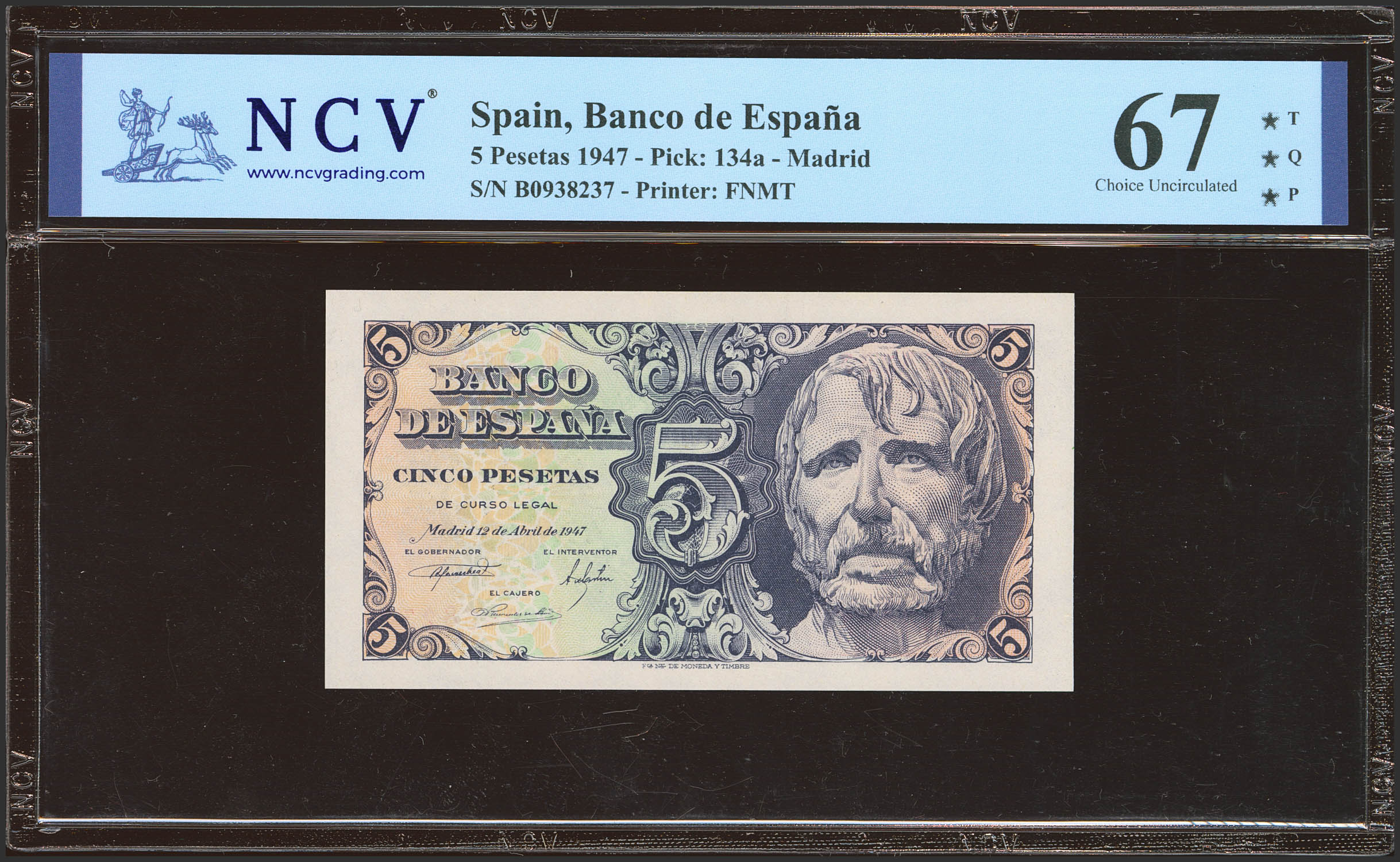 5 Pesetas. 12 de Abril de 1947. Serie B. (Edifil 2023: 454a, Pick: 134a). Raro en esta excepcional calidad, apresto original. SC. Encapsulado NCV67TQP.