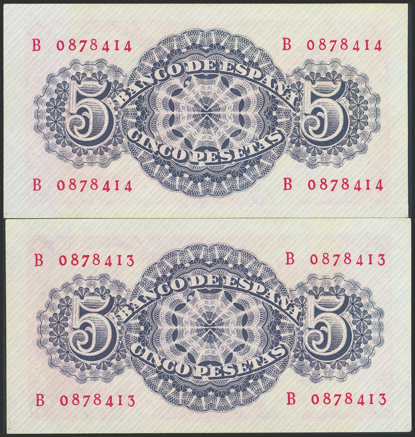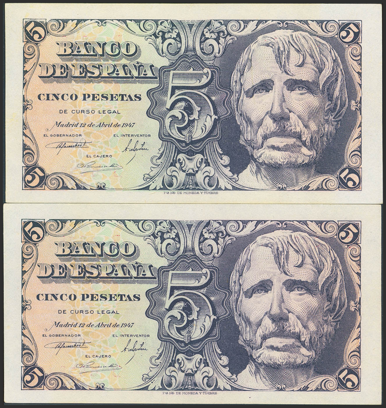 5 Pesetas. 12 de Abril de 1947. Pareja correlativa. Serie B. (Edifil 2023: 454a). Conserva parte del apresto original, tonalizado. SC-.