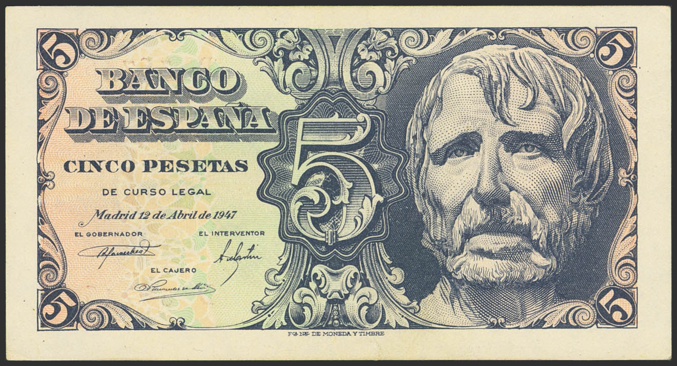 5 Pesetas. 12 de Abril de 1947. Serie D. (Edifil 2023: 454a). Apresto original. SC-.