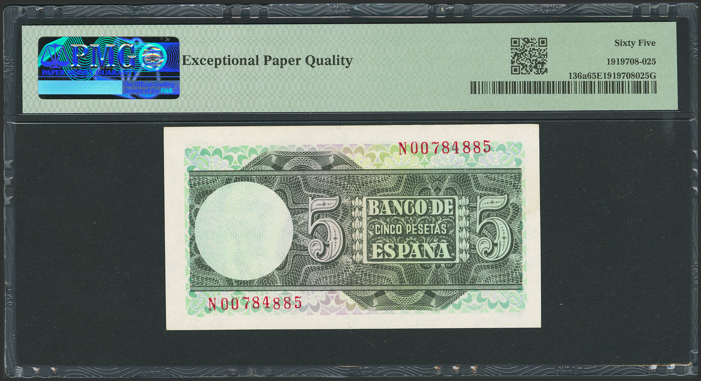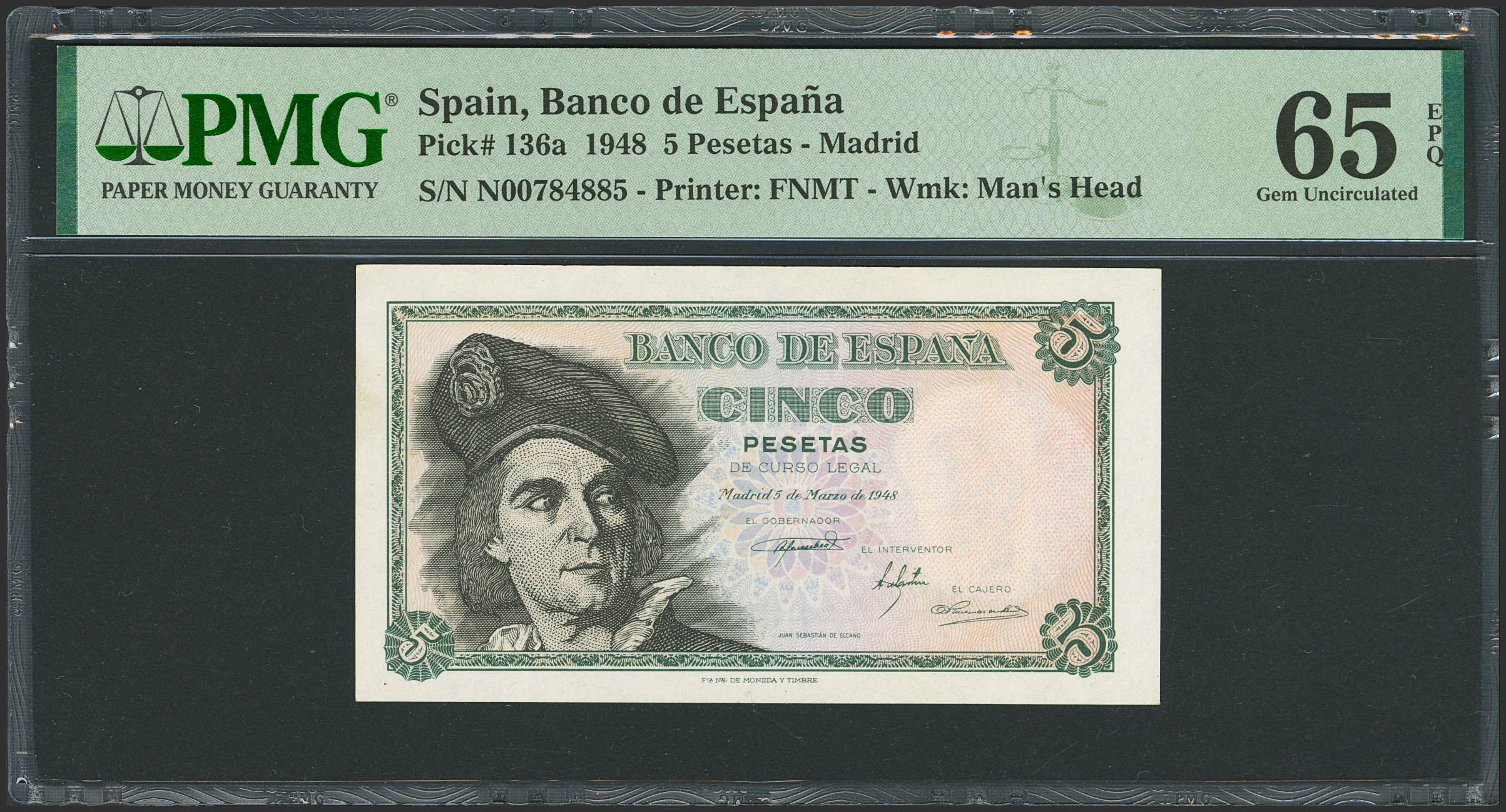 5 Pesetas. 5 de Marzo de 1948. Serie N, última serie emitida. (Edifil 2023: 455b, Pick: 136a). Muy raro en esta excepcional calidad, apresto original. SC. Encapsulado PMG65EPQ.