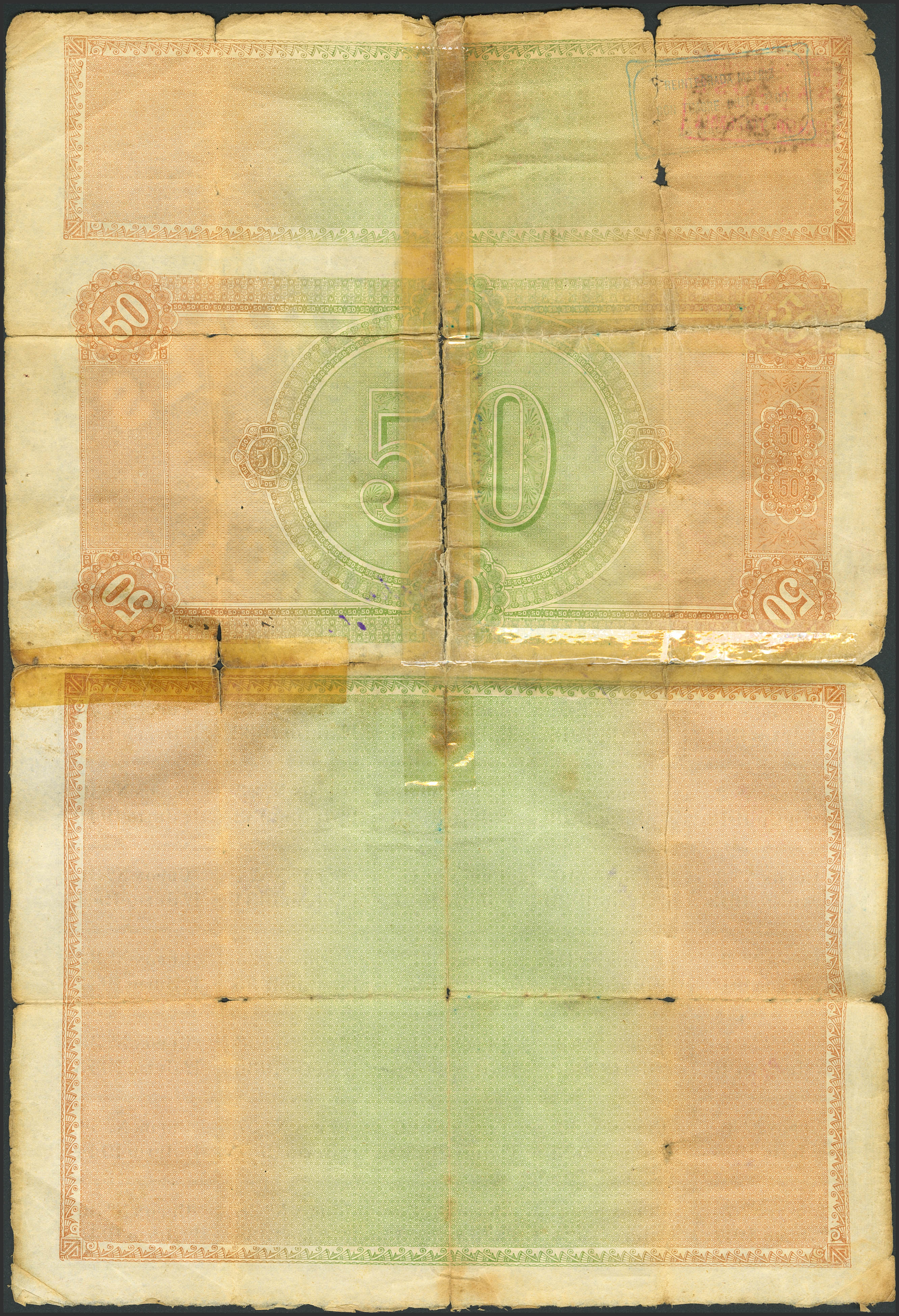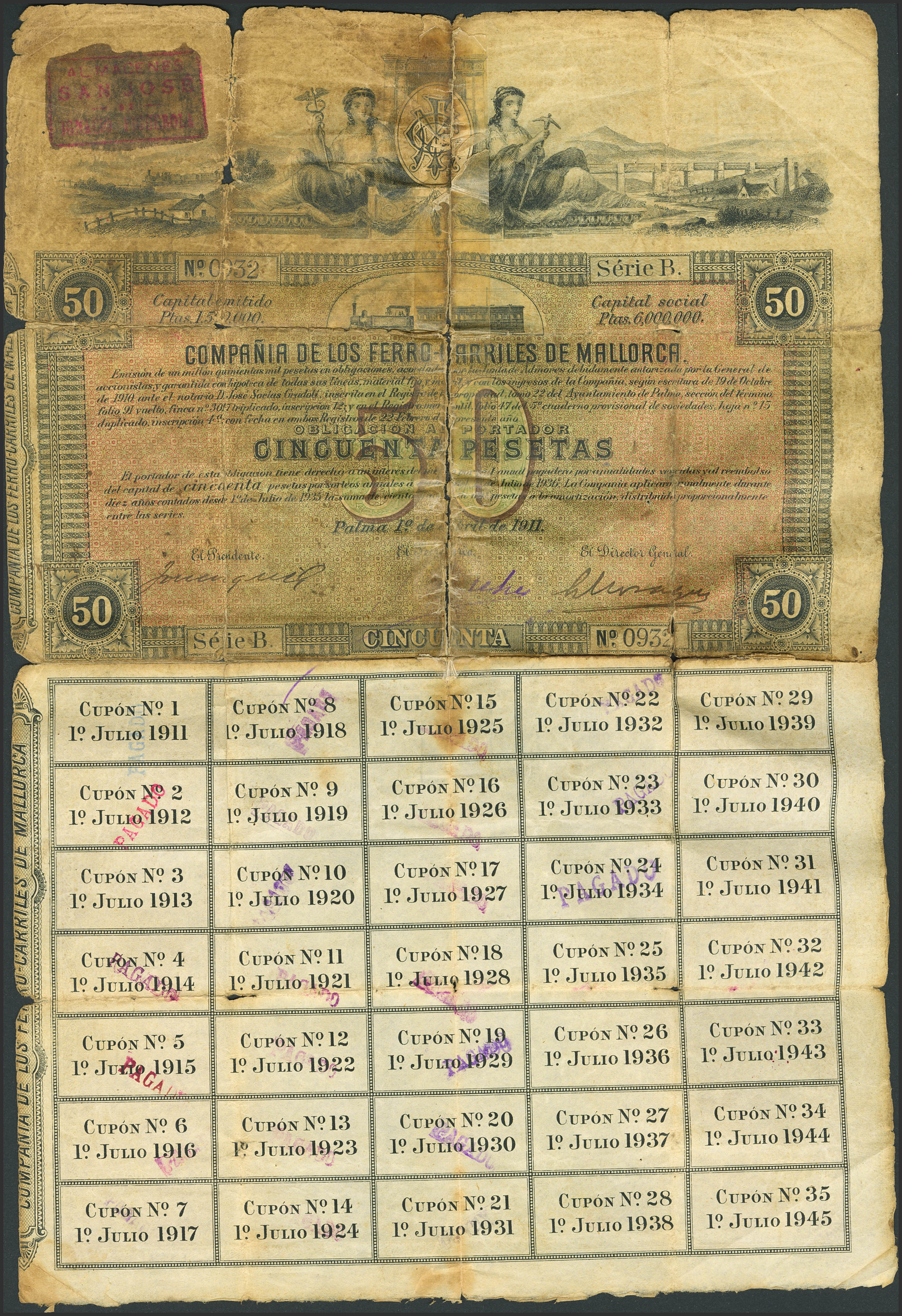 COMPAÑIA DE LOS FERROCARRILES (MALLORCA). Obligación de 50 Pesetas. 1911. Inusual verdaderamente circulado, reforzado con cinta adhesiva. Para entender mejor la contextualización de este billete recomendamos la obra "Obligaciones, vales y documentos puestos en circulación como papel moneda en España", de Don Ramón Cobo Huici. RC.